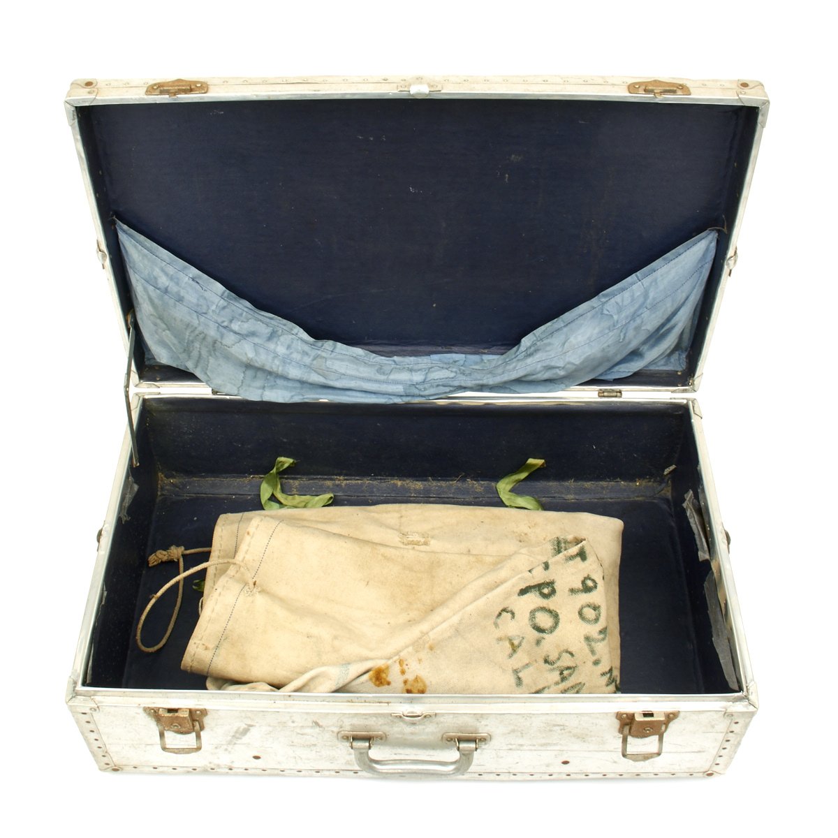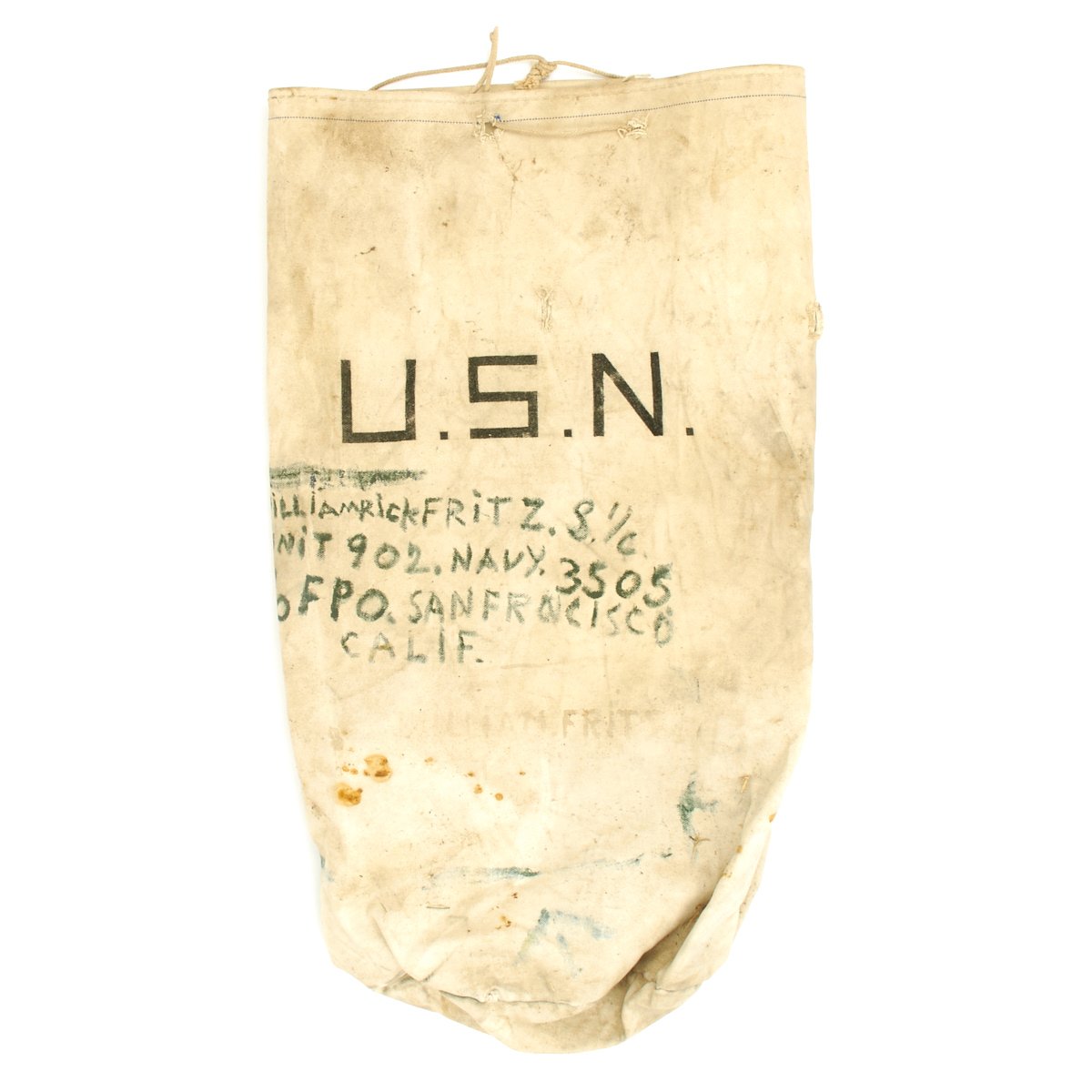 Inside the case is a USN canvas "stuff" bag with another soldier's information painted on it which reads: