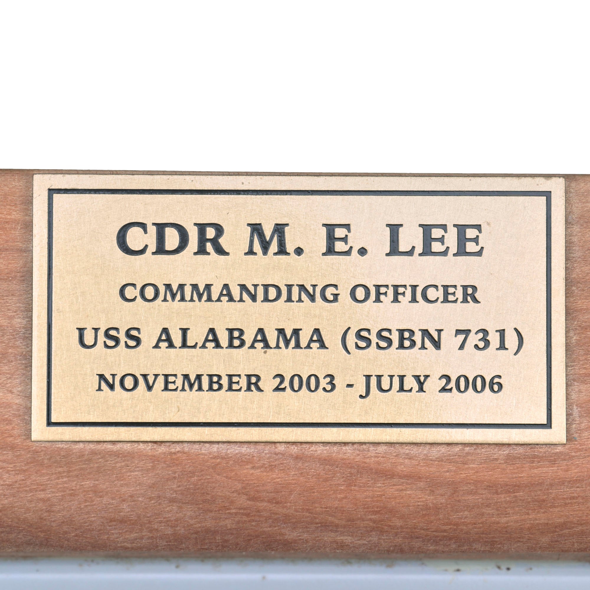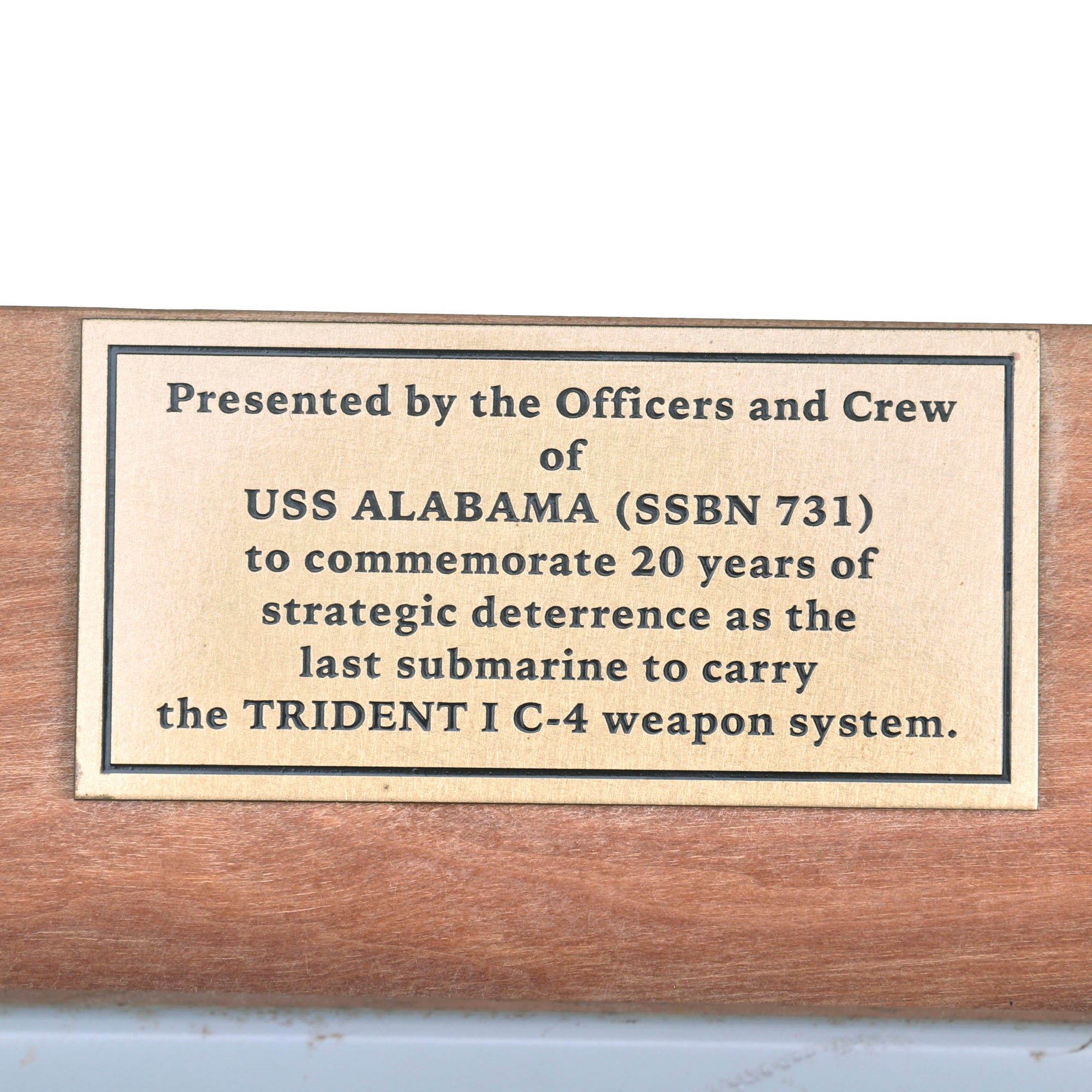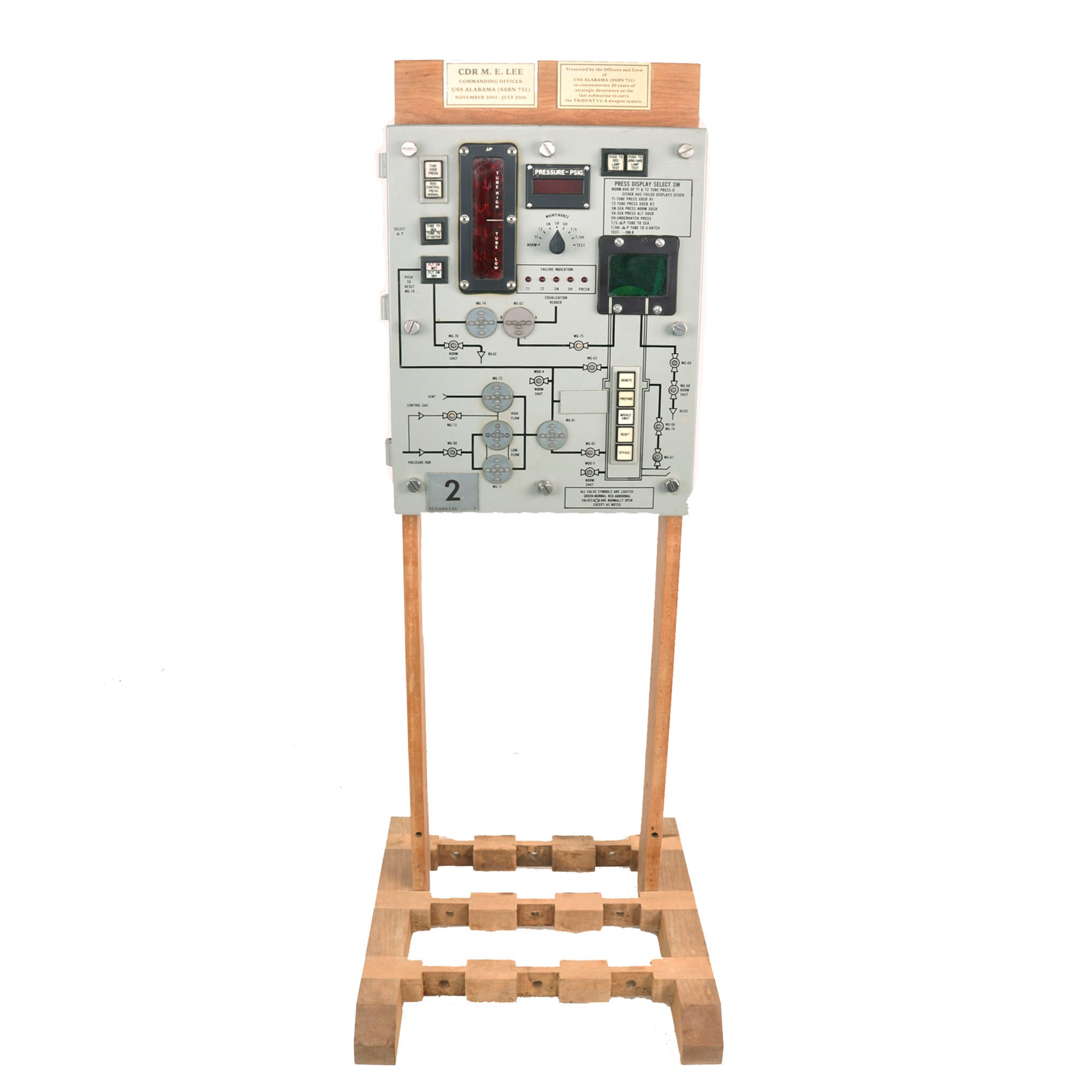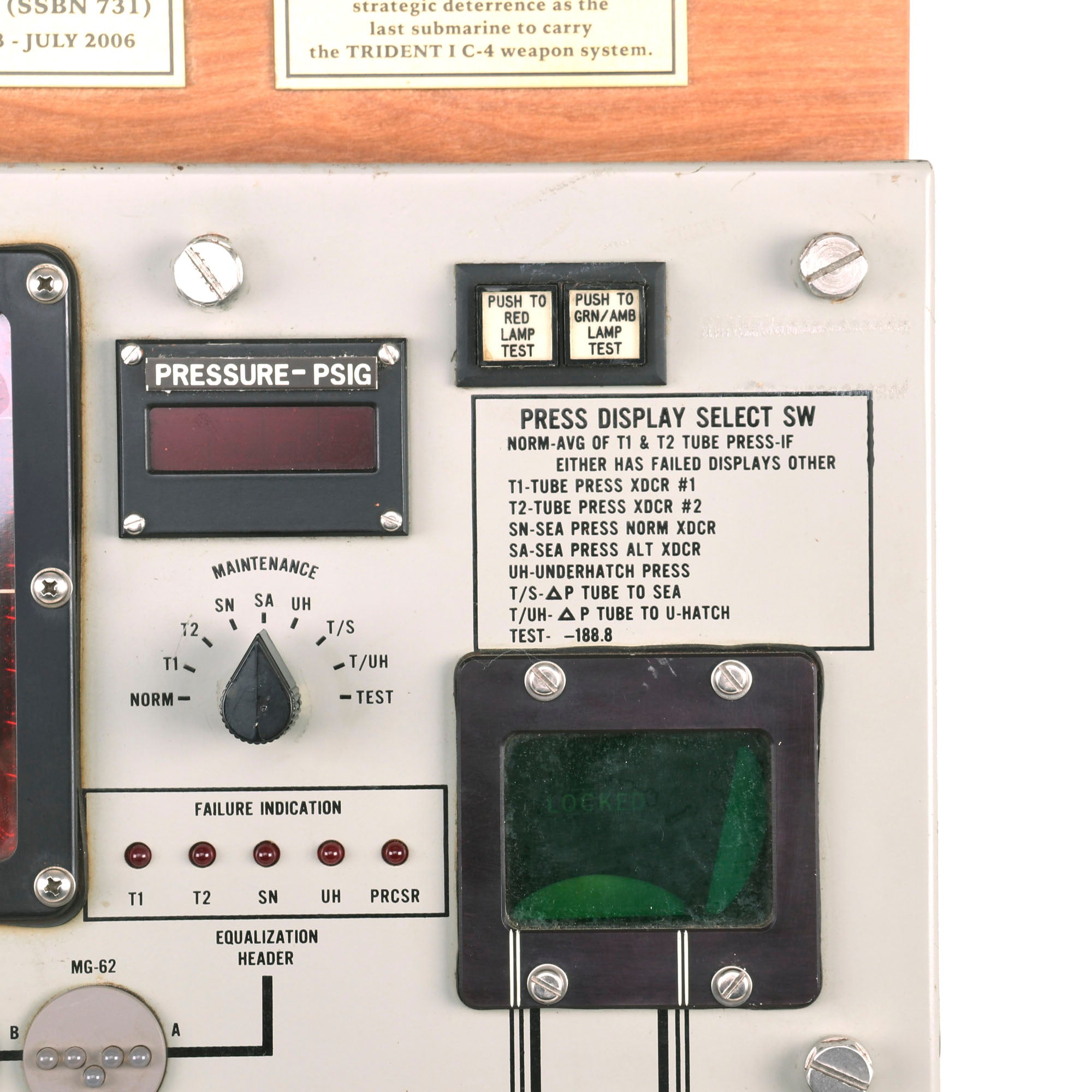 Original Item. One-of-a-Kind. This is one of the most interesting modern pieces we have offered. This is the Nuclear Submarine Missile Launch Control Panel off of the USS Alabama (SSBN-731), which was the last submarine to carry the Trident I C-4 Weapon System. This panel was mounted onto a base constructed from a wooden battery rack taken off of the USS Alabama and presented to Commander M. E. Lee, who served as Commanding Officer of the Submarine from November 2003 until July 2006. The piece measures 43¾” tall, with a 17 x 18 x 2½” base. The panel itself measures 13¾ x 17”.