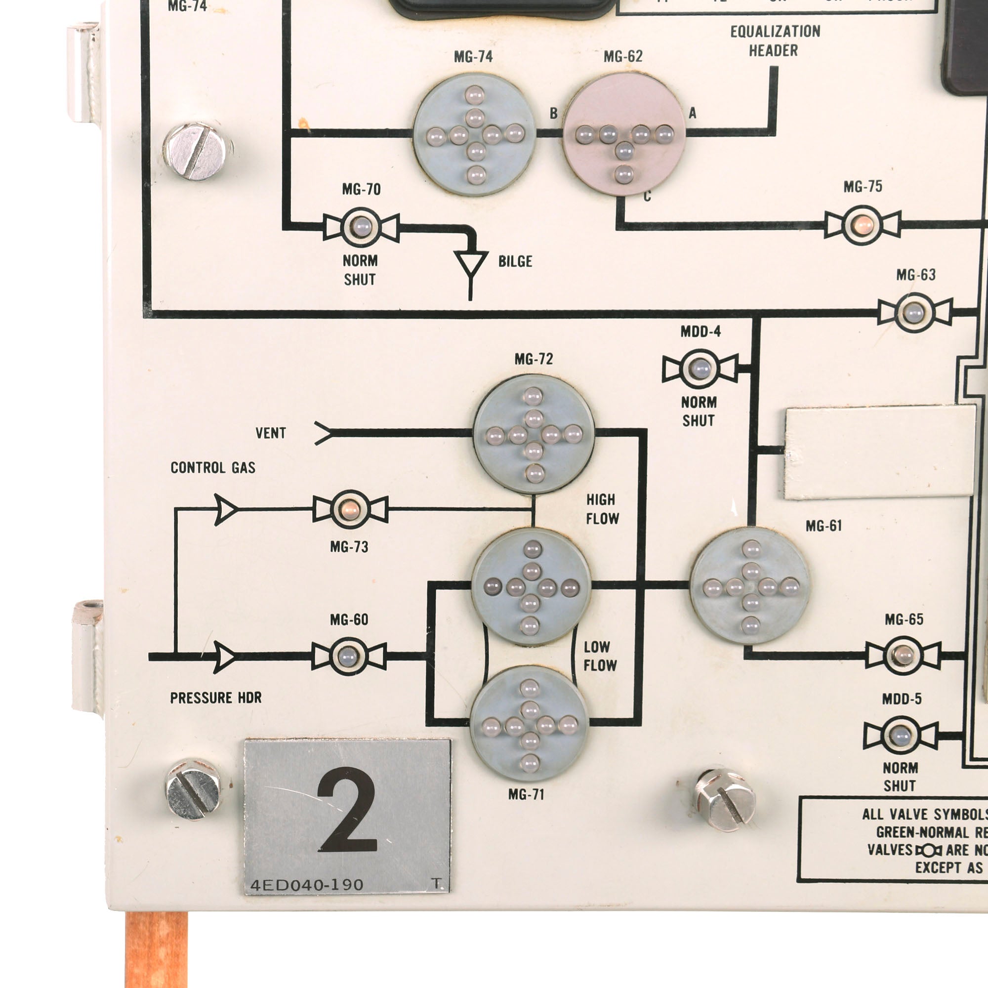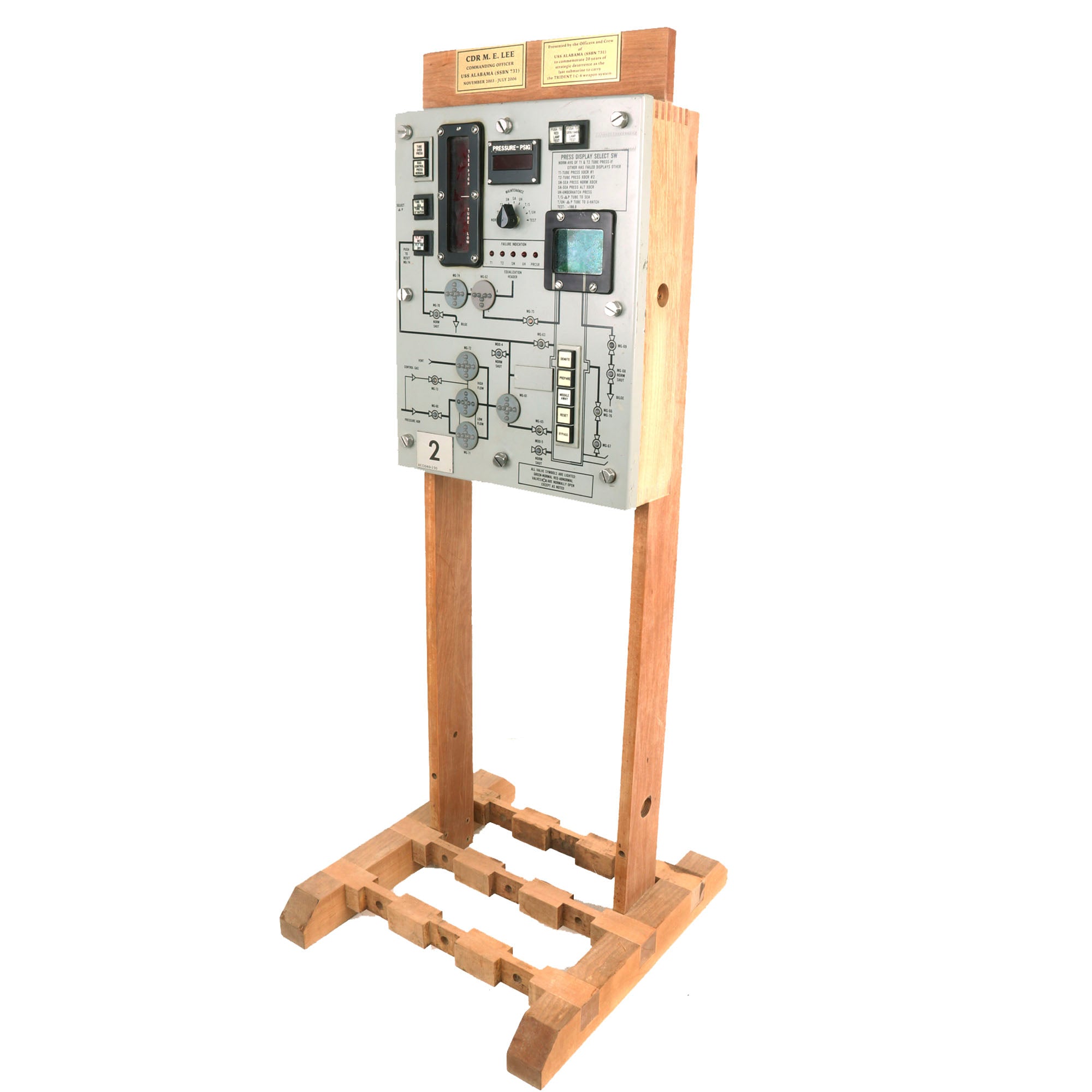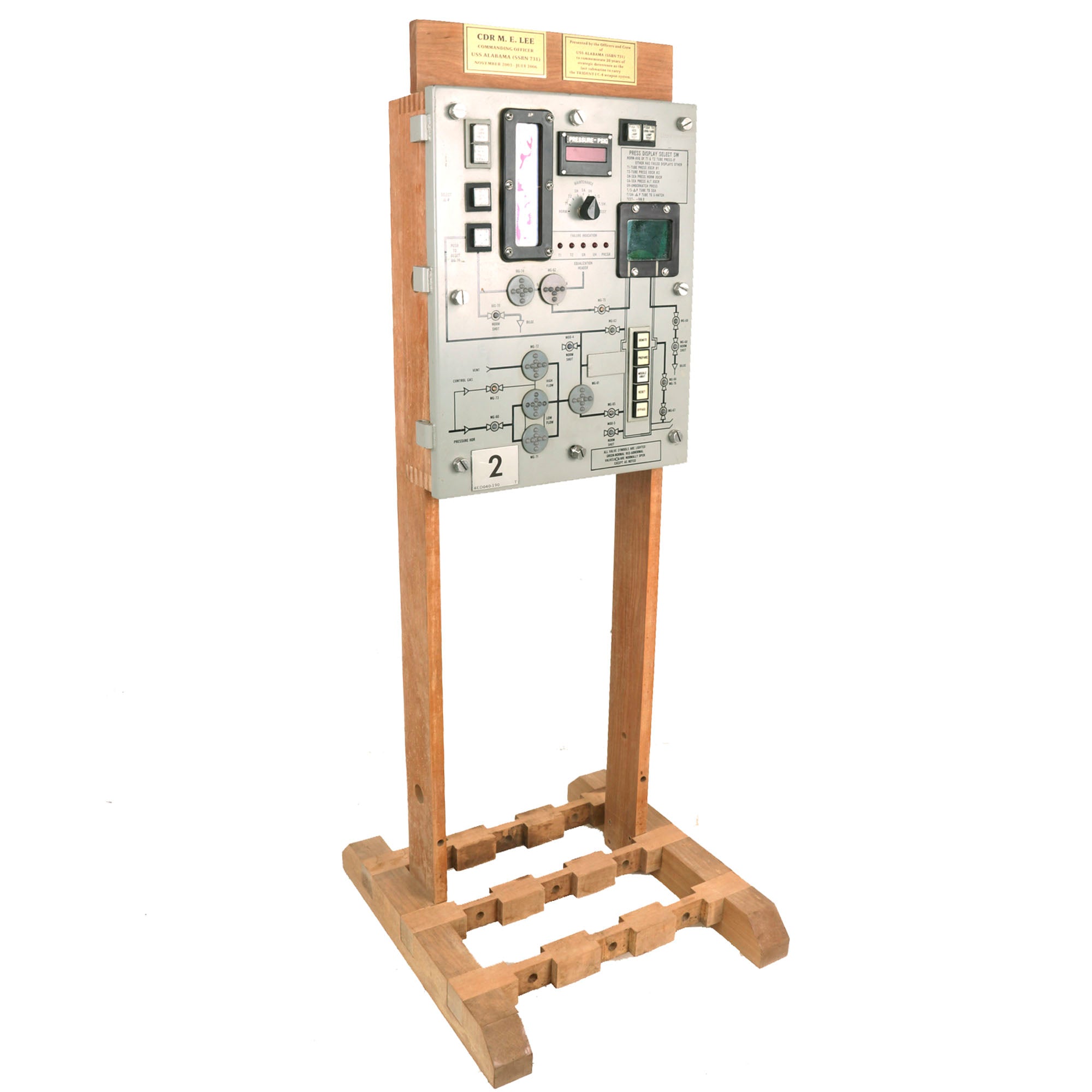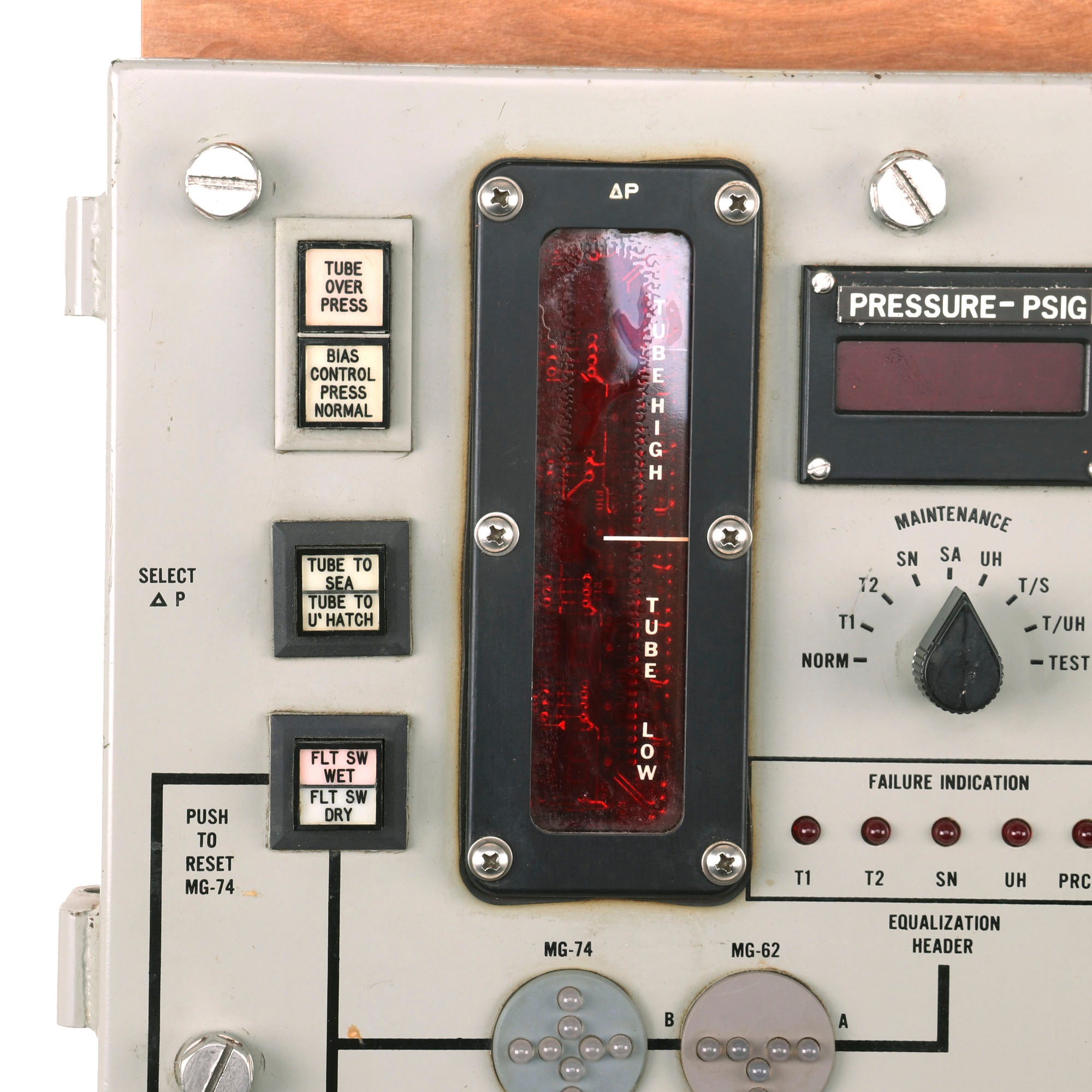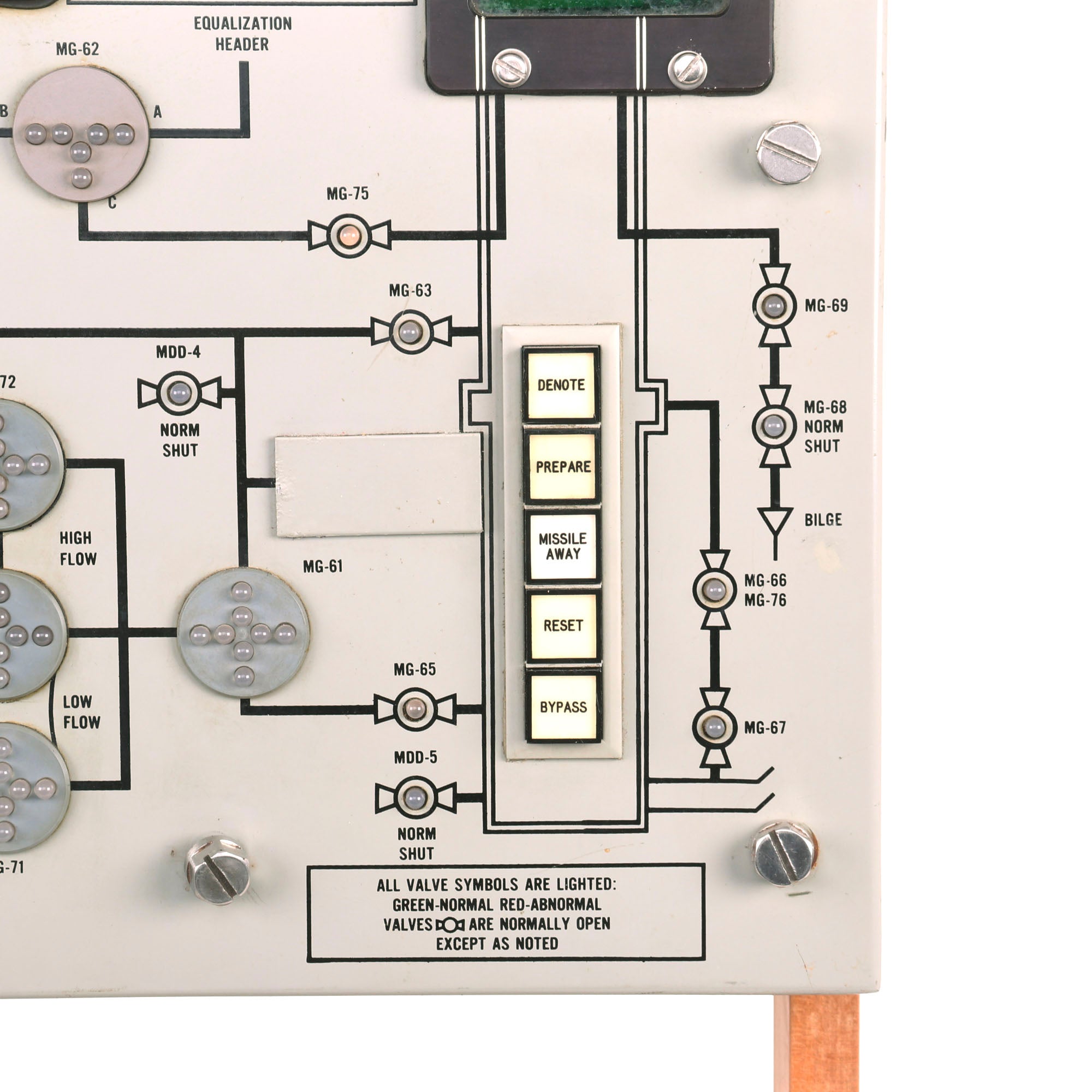 Original Item. One-of-a-Kind. This is one of the most interesting modern pieces we have offered. This is the Nuclear Submarine Missile Launch Control Panel off of the USS Alabama (SSBN-731), which was the last submarine to carry the Trident I C-4 Weapon System. This panel was mounted onto a base constructed from a wooden battery rack taken off of the USS Alabama and presented to Commander M. E. Lee, who served as Commanding Officer of the Submarine from November 2003 until July 2006. The piece measures 43¾” tall, with a 17 x 18 x 2½” base. The panel itself measures 13¾ x 17”.