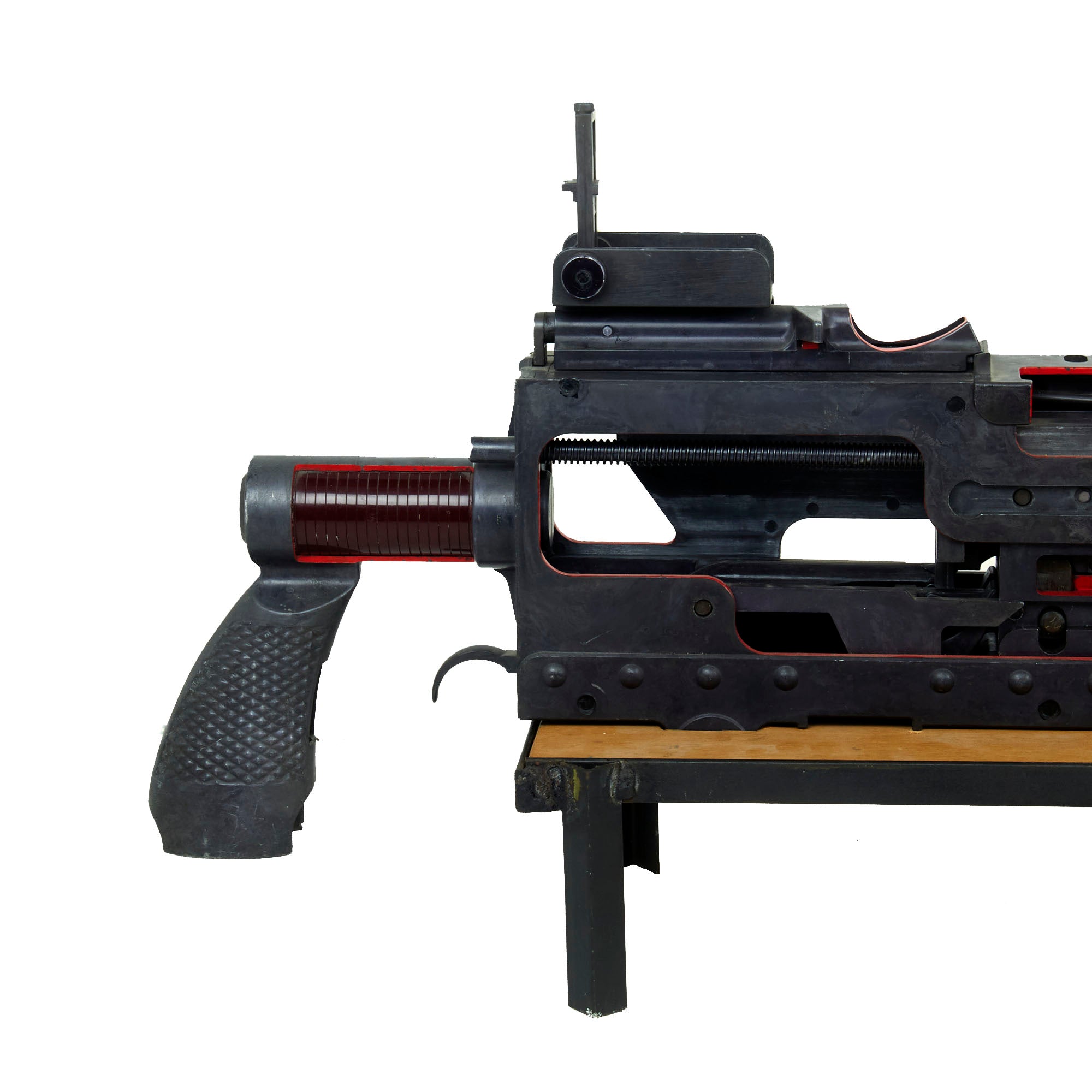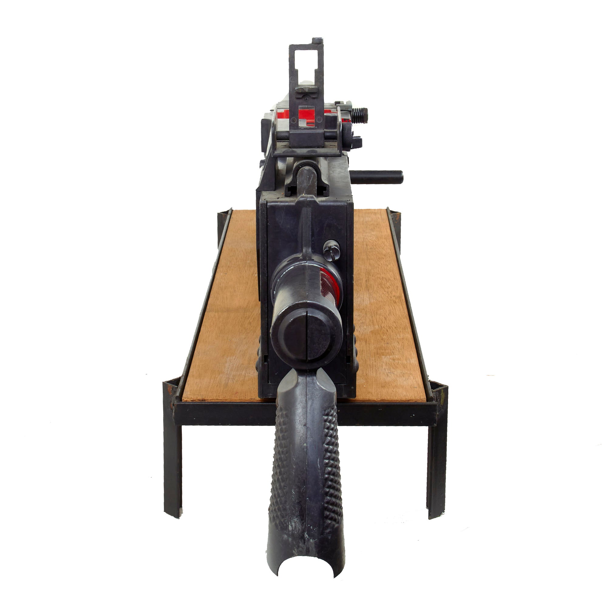 The custom-made stand measures roughly 12 x 36½ x 5½” and is very well put together, with the legs being welded on. The wooden base has two holes cut for the mounting piece to sit in when the gun is placed in the display. A really phenomenal addition that makes this piece ready to display!