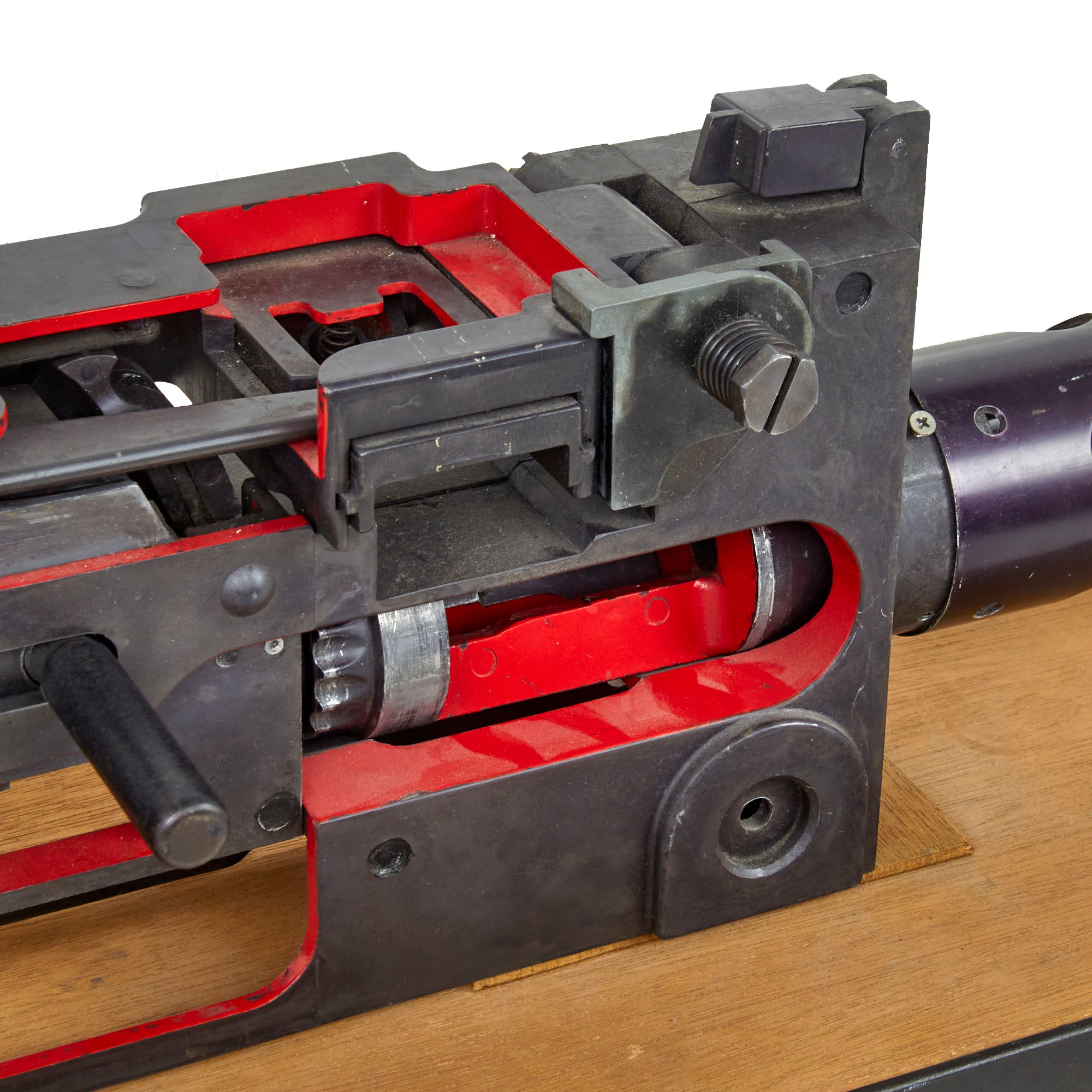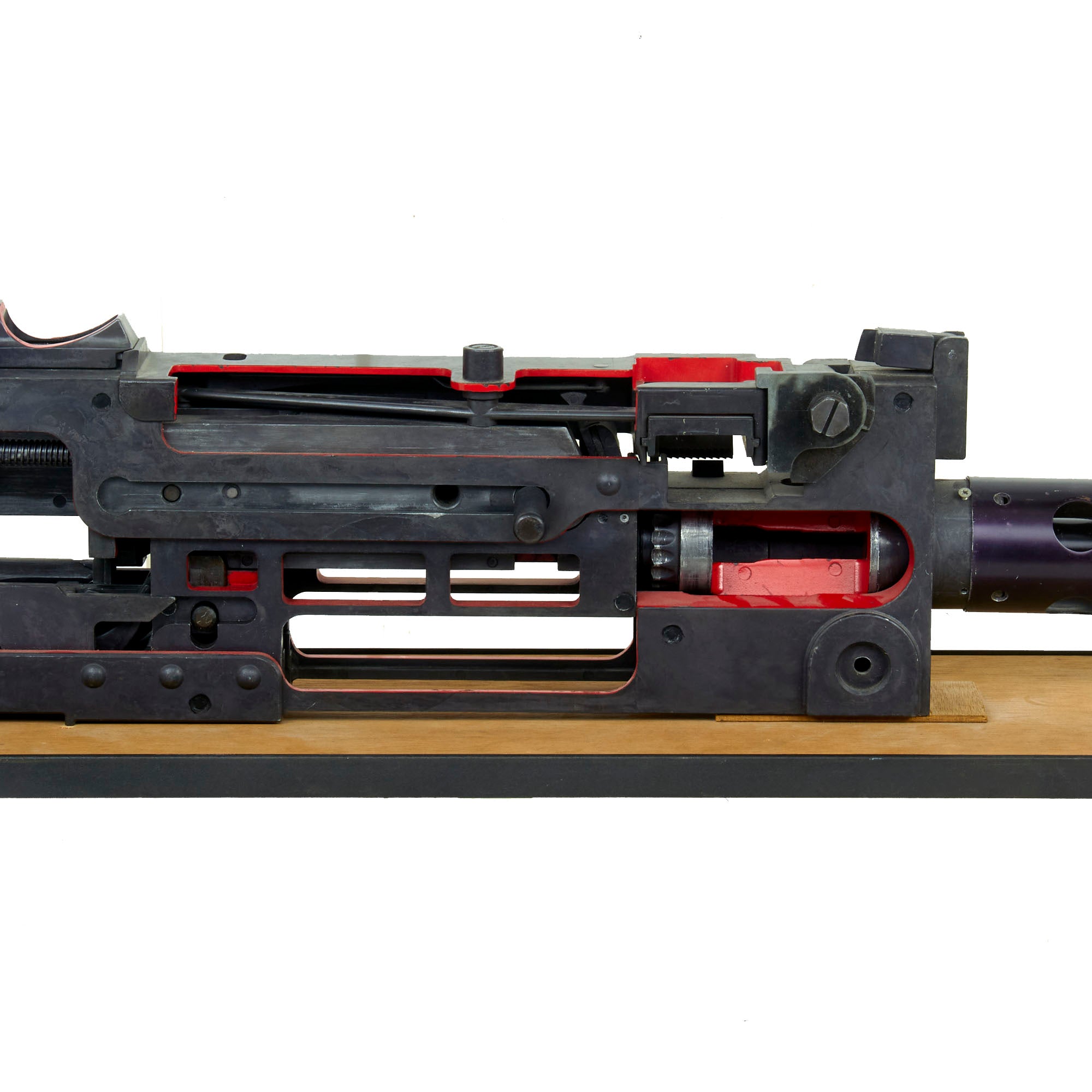 Original Item: Only One Available. Designed by the Office of Naval Research's Special Devices Center, this cutaway classroom training model measures 79 inches in overall length, and demonstrates the inner workings of the Browning Model 1919A6 Machine Gun. These are very hard to come by, especially with an original belt of dummy rounds. These were used as a way to familiarize service members with the inner workings of the Browning M1919, which was in use for decades as a front line weapon. It also bears many similarities to the Browning M2, which is still in service today. This example is in great shape and comes with a custom-built display stand!