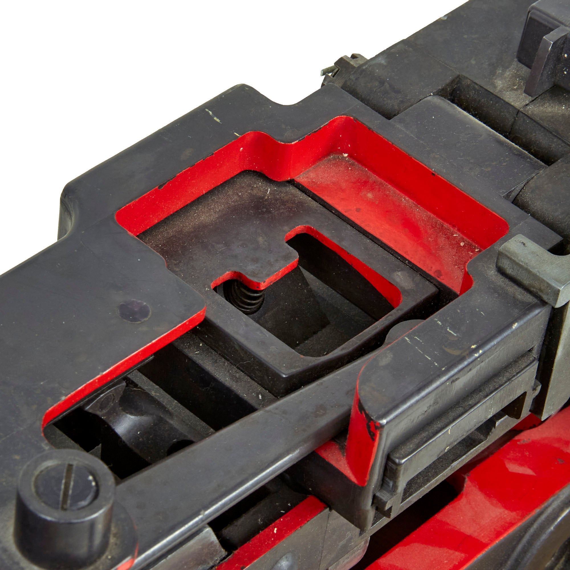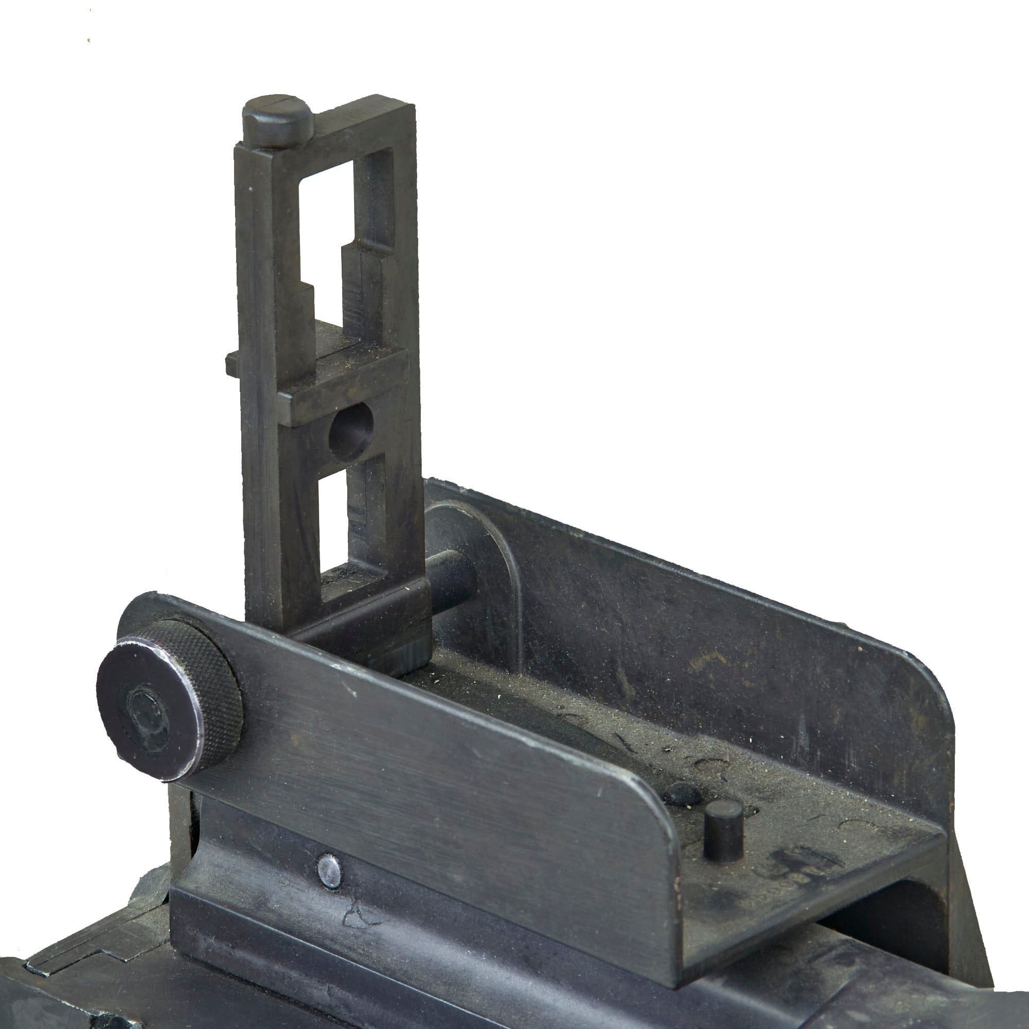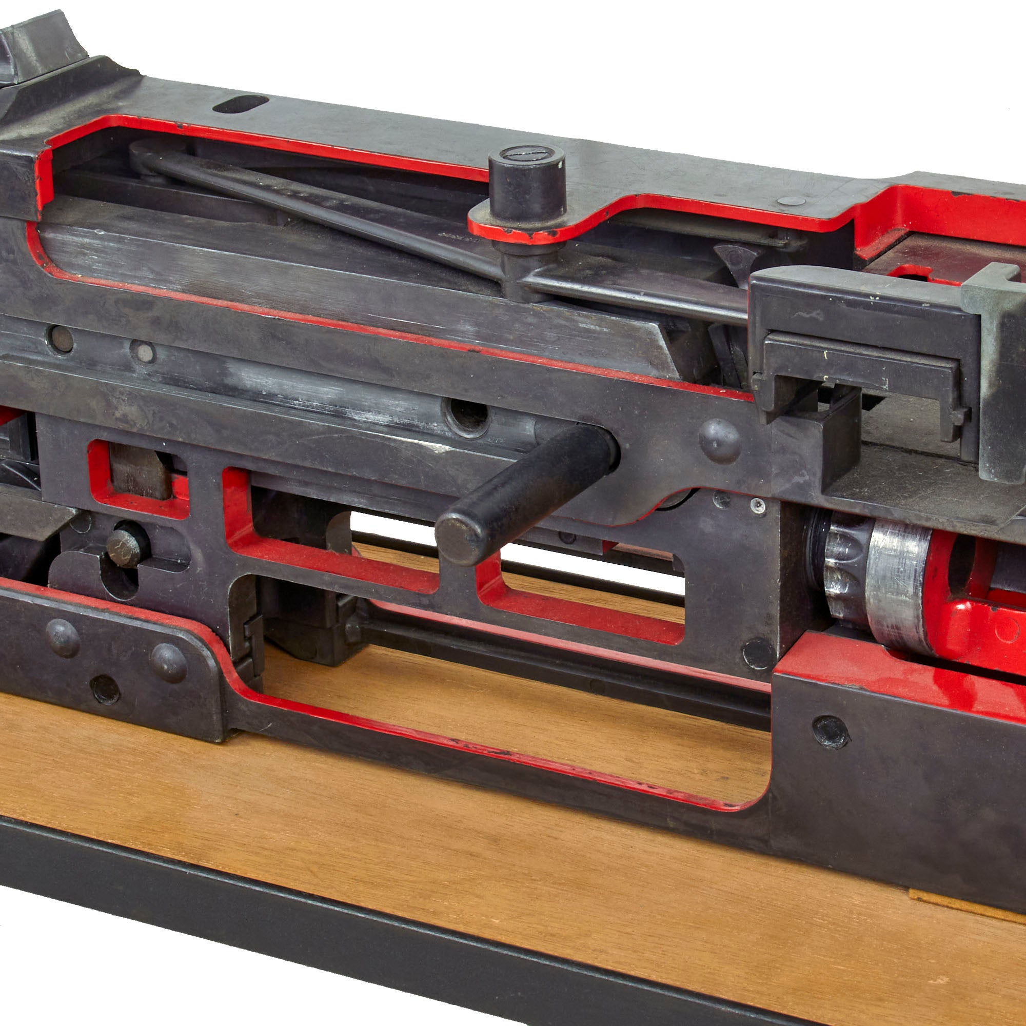The display model is made from mostly non-magnetic material, we believe zinc or something similar, which definitely makes it light weight, but also much less strong. With many areas cut out, this made it somewhat brittle, and parts were often lost. This example is in great shape, however, with most parts retained from what we can tell. The trigger & cocking handle are a bit stiff, probably due to being in storage for quite a long time. You can still pull the lever forward and push it back without issue. The front and rear sights still fold down as intended. The set retains its original paint, with the cutaway parts still correctly painted red. There aren’t many markings we could find besides on some specific parts, with a rod on the interior being marked 156503. The front of the barrel is marked 156478. This leads us to believe that these are just part numbers.
