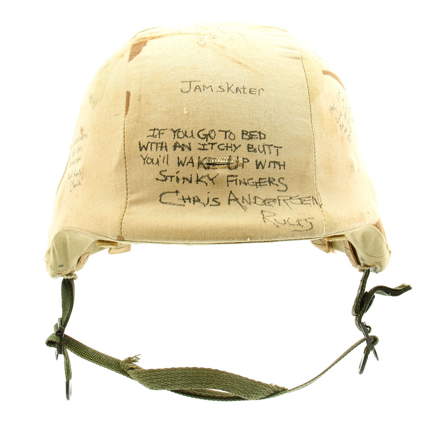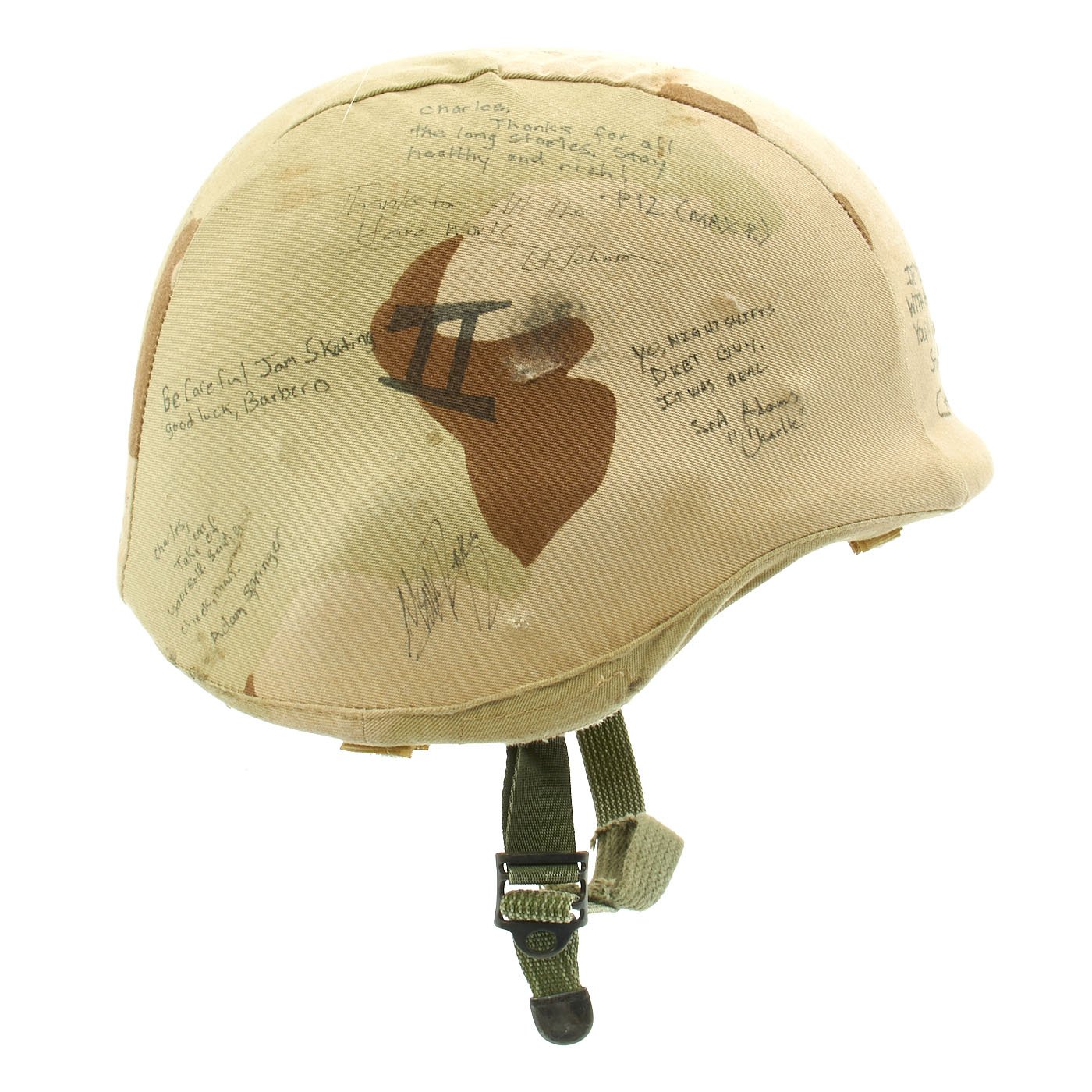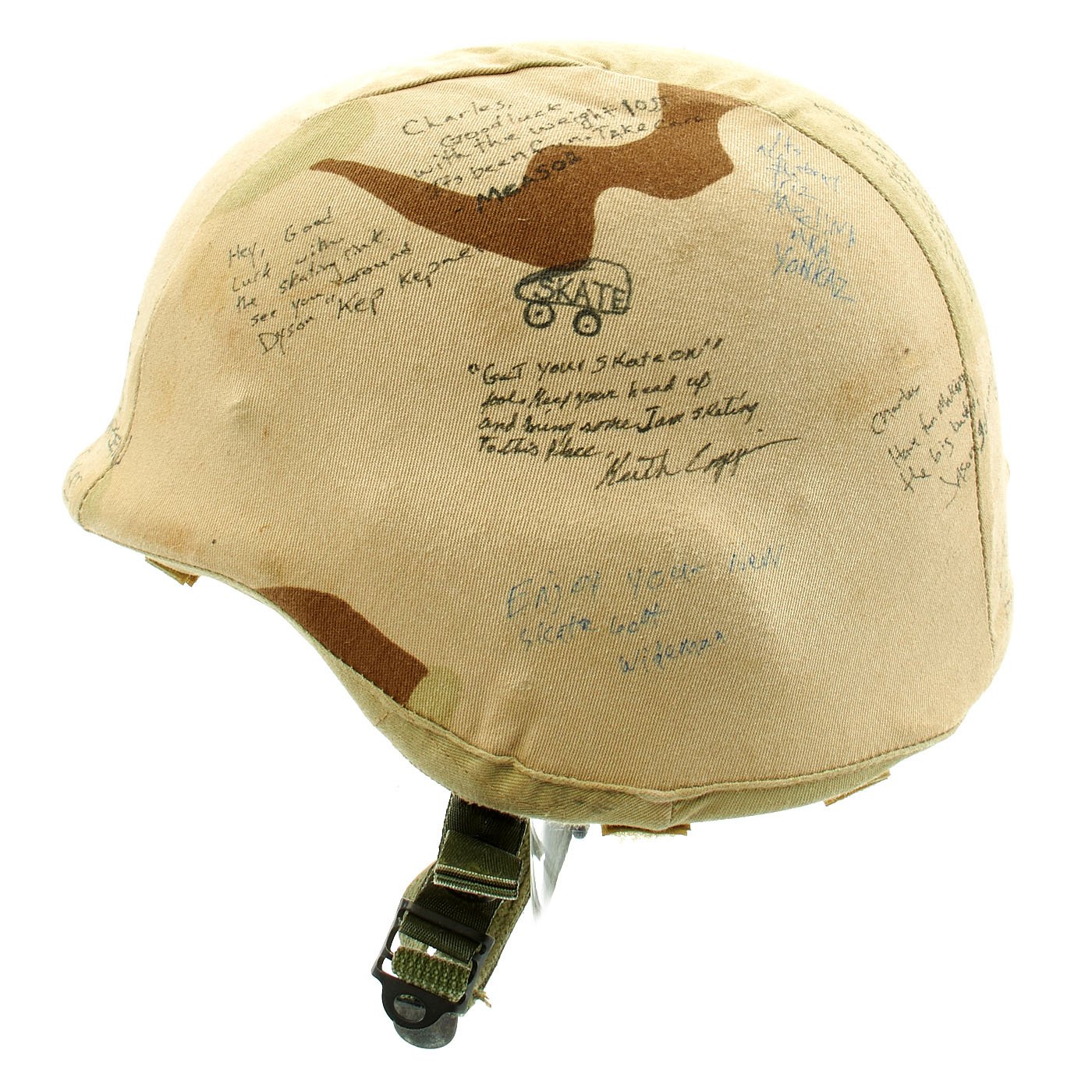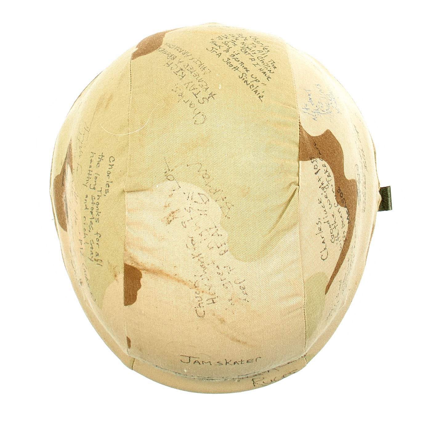 Original Item: Only One Available. Obtained directly from a veteran of Operation Iraqi Freedom named "Charles Skate". The desert helmet cover is signed by his fellow soldiers as a good bye memento. His nickname was skater. This example is in excellent complete condition and is a size small (6 3/4 US).