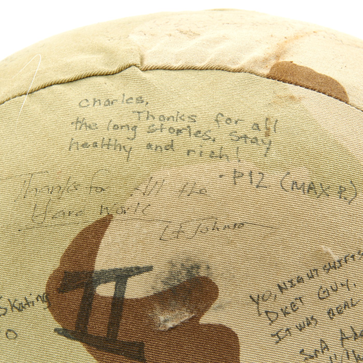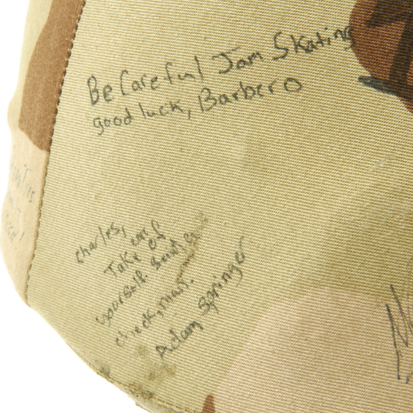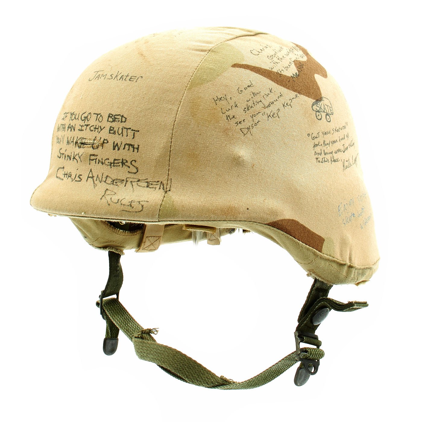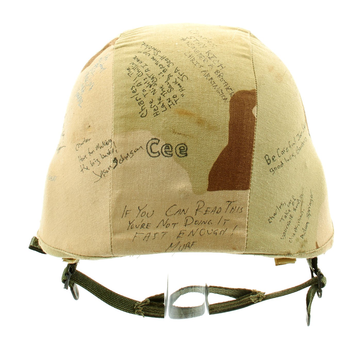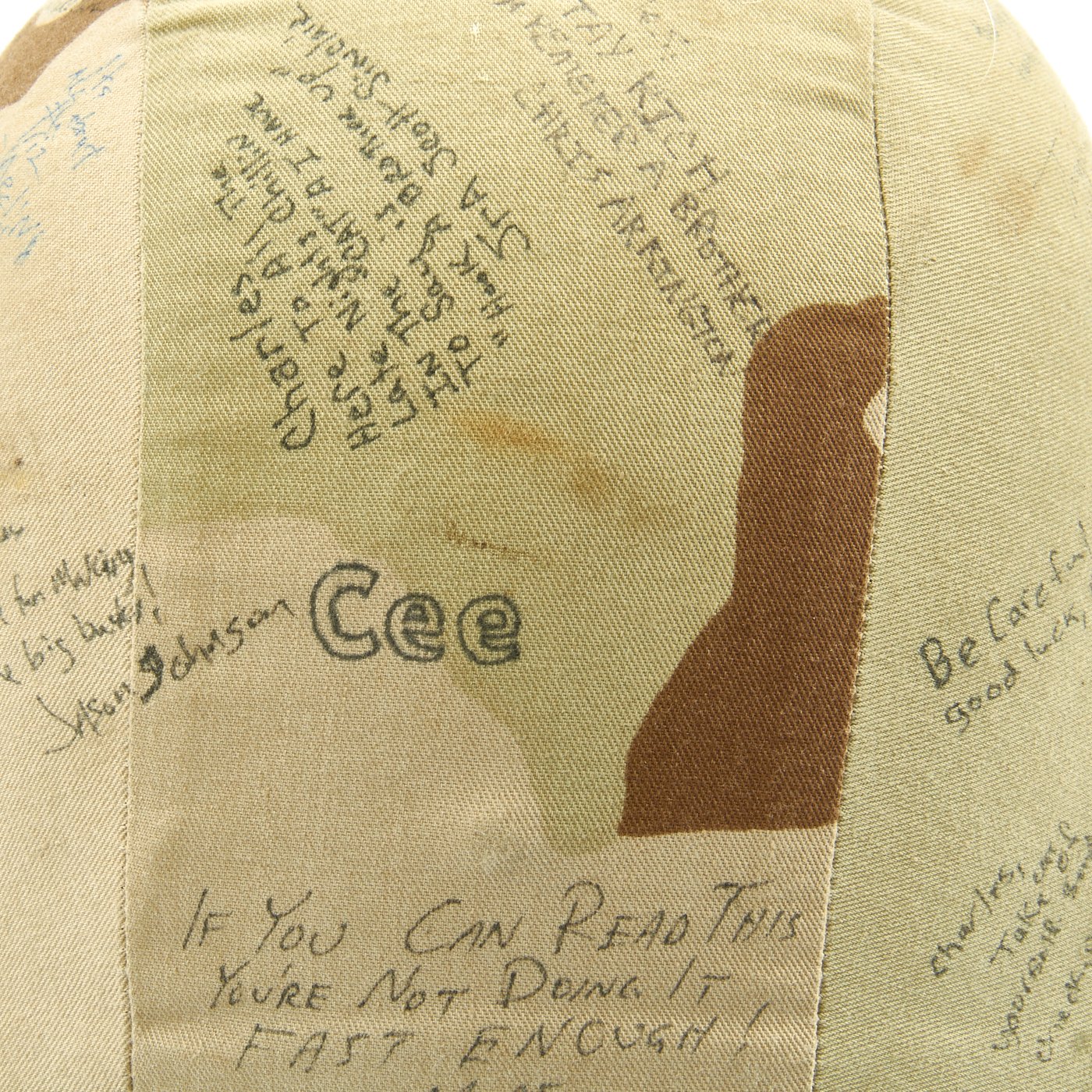 Original Item: Only One Available. Obtained directly from a veteran of Operation Iraqi Freedom named "Charles Skate". The desert helmet cover is signed by his fellow soldiers as a good bye memento. His nickname was skater. This example is in excellent complete condition and is a size small (6 3/4 US).