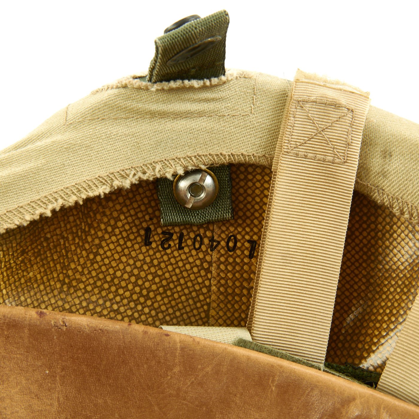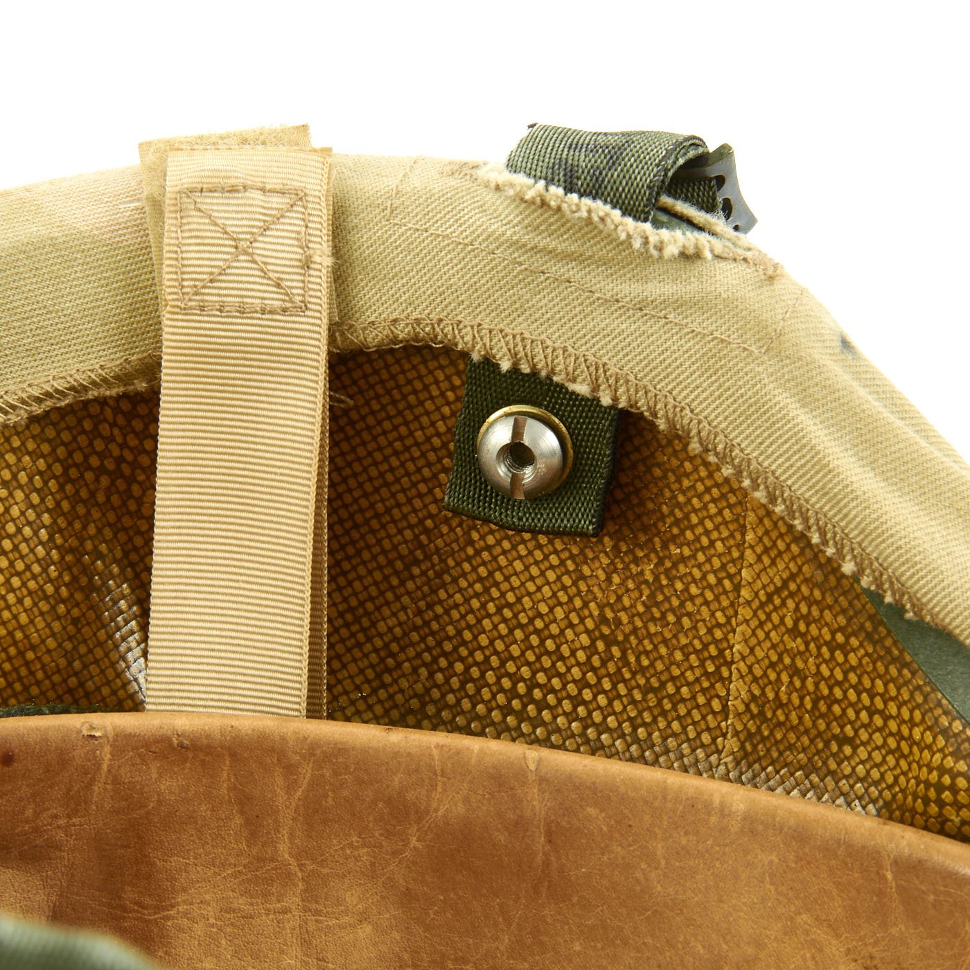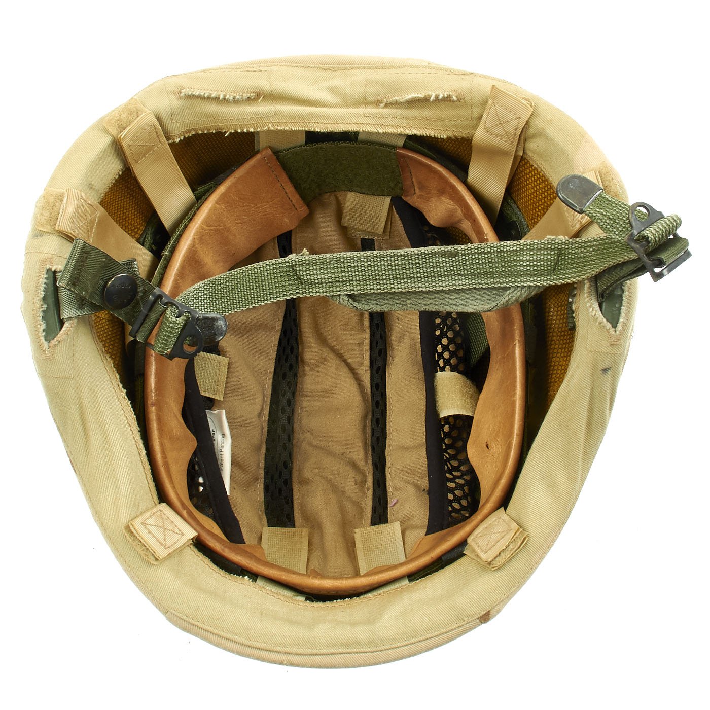 The nylon webbing inside the Kevlar helmet is functional but not comfortable. There is a foam helmet insert, a "comfort pad" or "donut", used by most soldiers. The inner web suspension system, including a sweatband, is olive drab in color but outer components such as the chin strap or cover and cover band are issued in camouflage pattern cloth or camo-compatible colors such as olive drab or desert tan. The photo at top shows a camo cloth cover with an olive drab band and chinstrap. Unit patches and rank insignia are attached to the cover. Each helmet has its size molded into the unit and nomenclature, contract, NSN information printed near the inside rim.