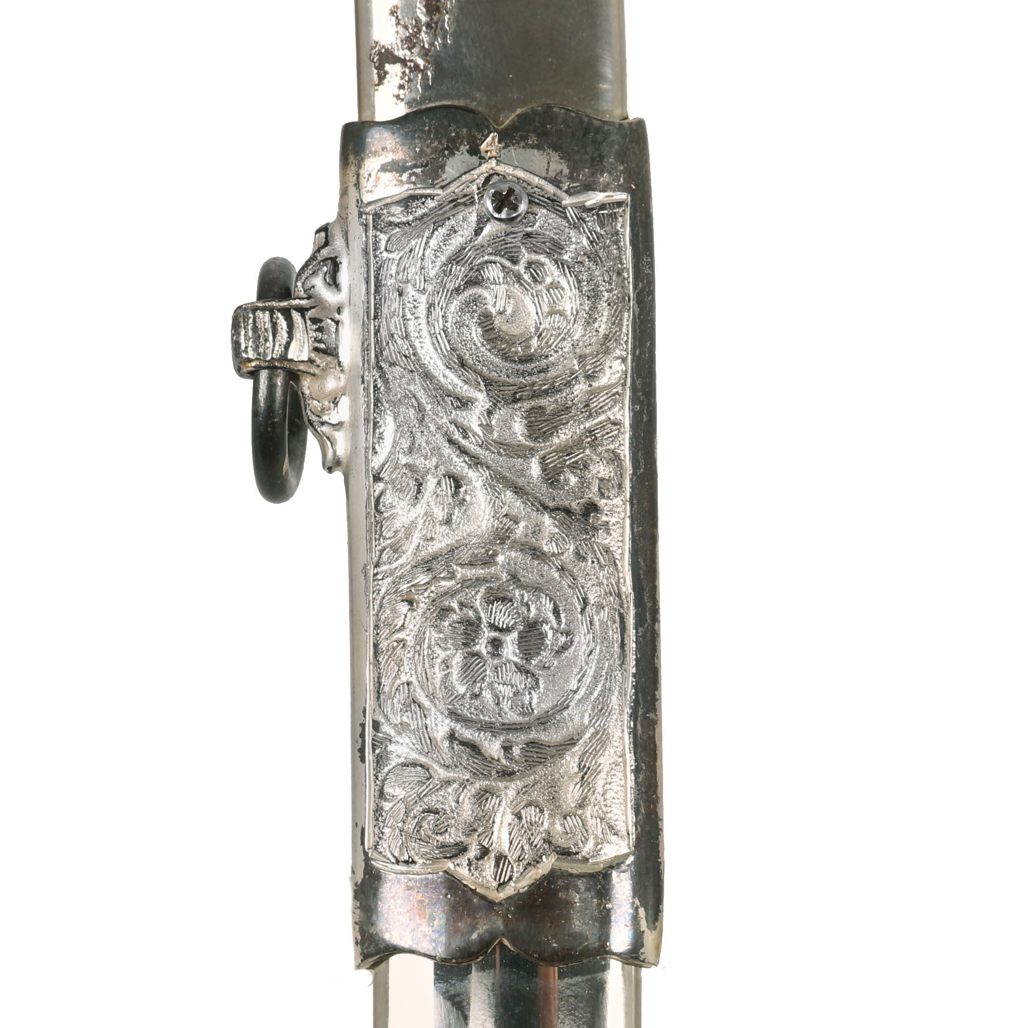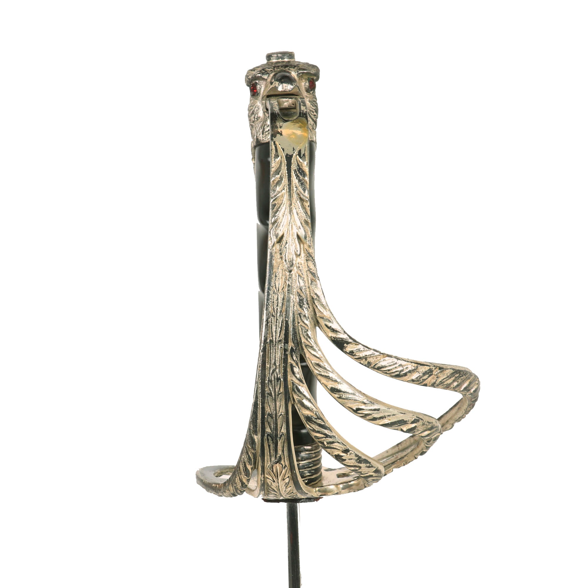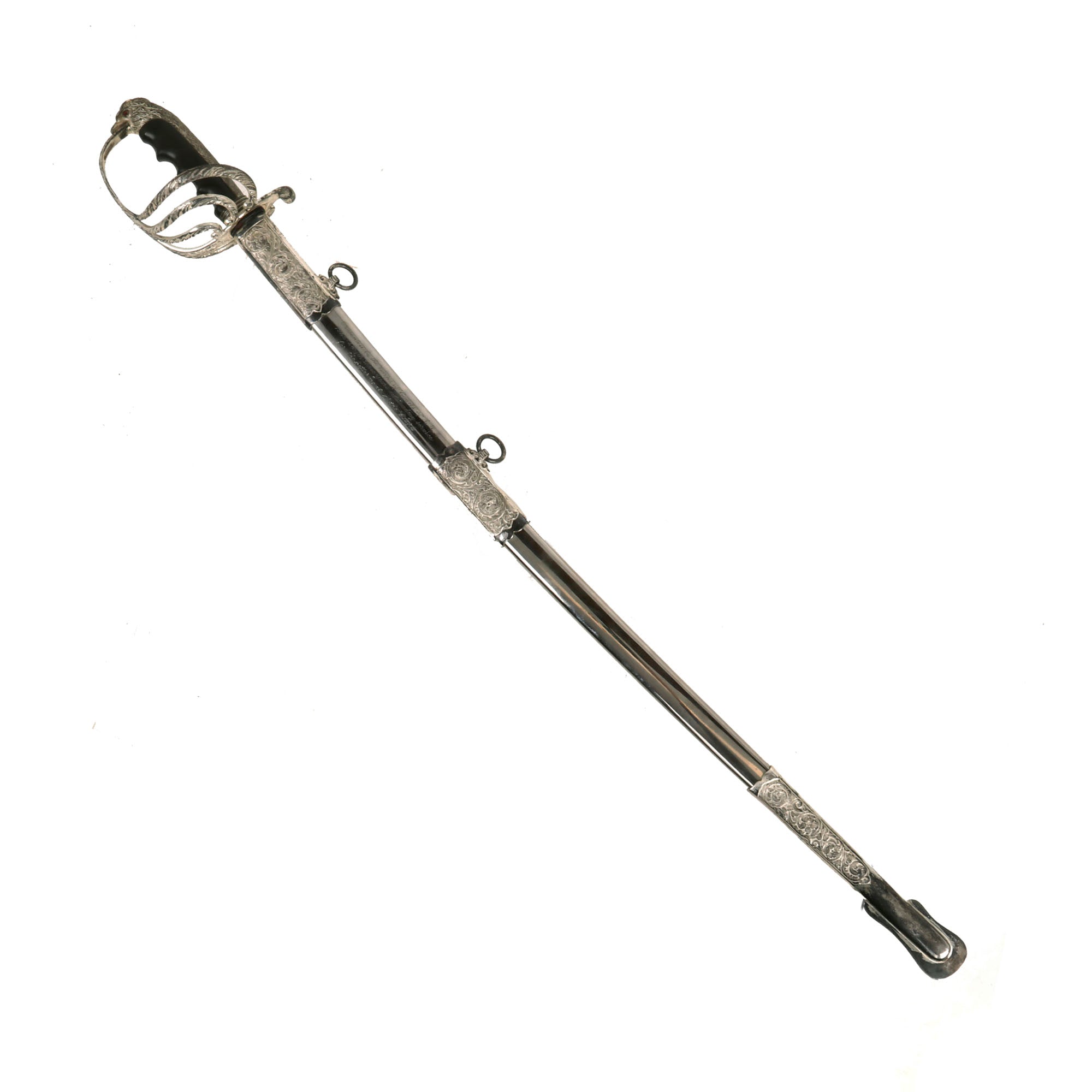 This is actually an incredibly ornate presentation sword with a lovely “ruby” eyed Eagle pommel. The sword is 36 inches in overall length, with a 29 1/2 inch blade. Condition is very good, with almost all of the nickel/silver plating intact, and comes complete with its matching very ornate scabbard Scabbard.