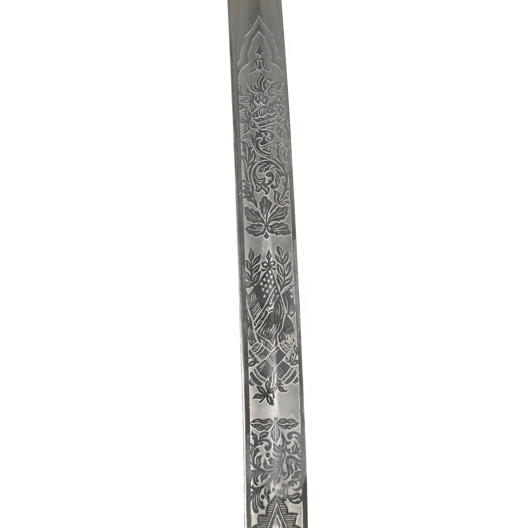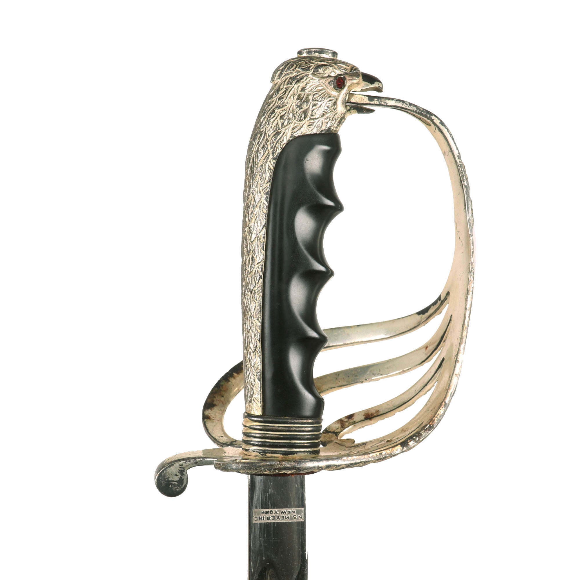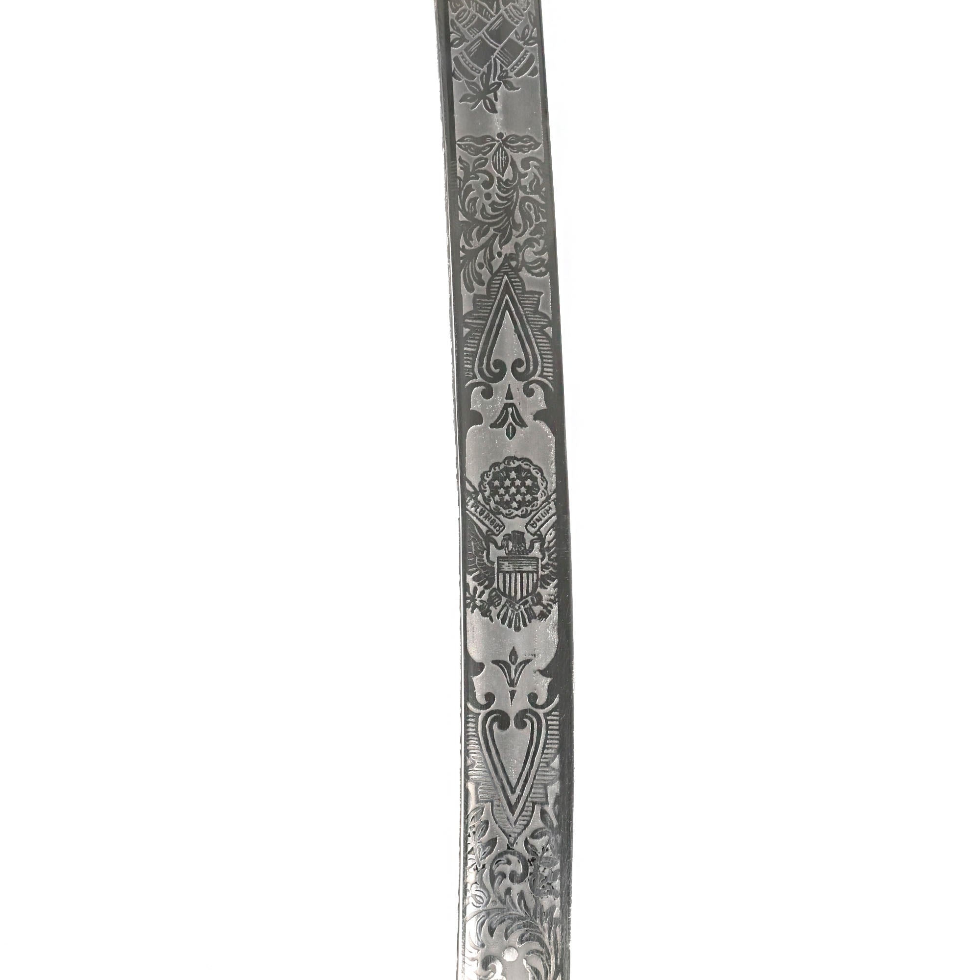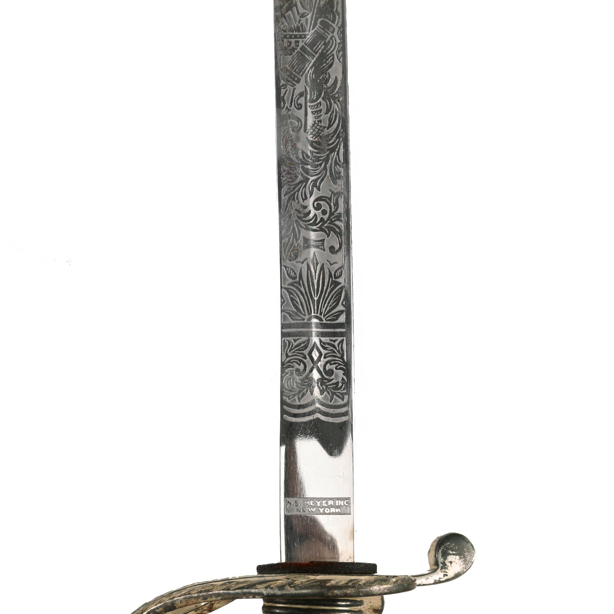 Original Item: Only-One-Available. This is the official U.S. Army Officer's Sword, introduced in the early 1900's (M-1902). It has a four bar nickel plated hand guard, black plastic finger grooved grip, slim slightly curved fully etched and nickel-plated blade. The etched design has typical United States Military emblems, including the Federal Eagle, crossed cannons, flags, and so forth. The ricasso is marked on both sides with U.S.A. MADE / N.S. MEYER / NEW YORK.