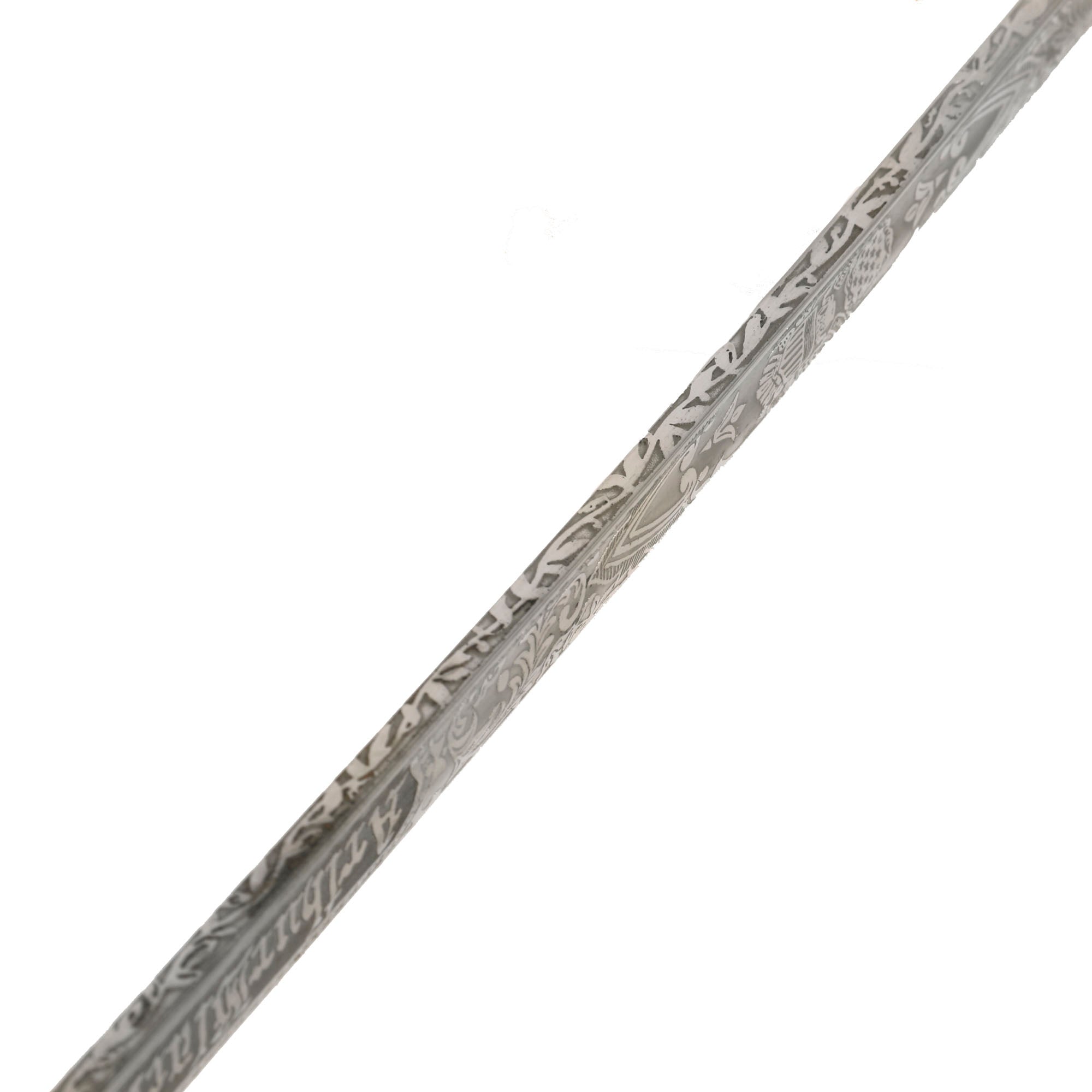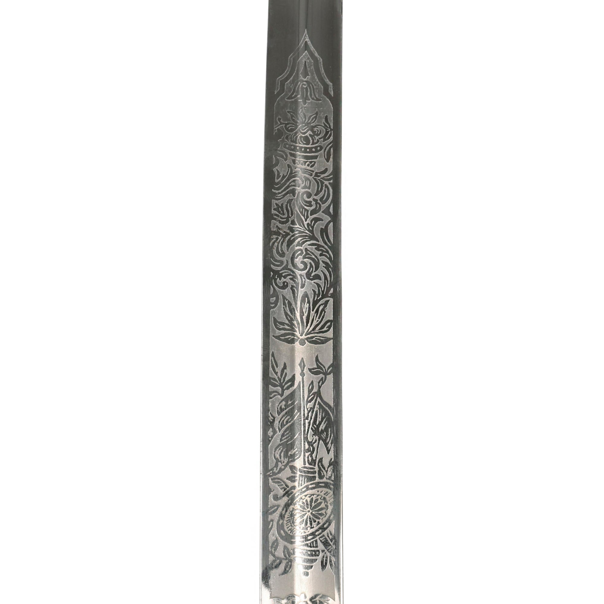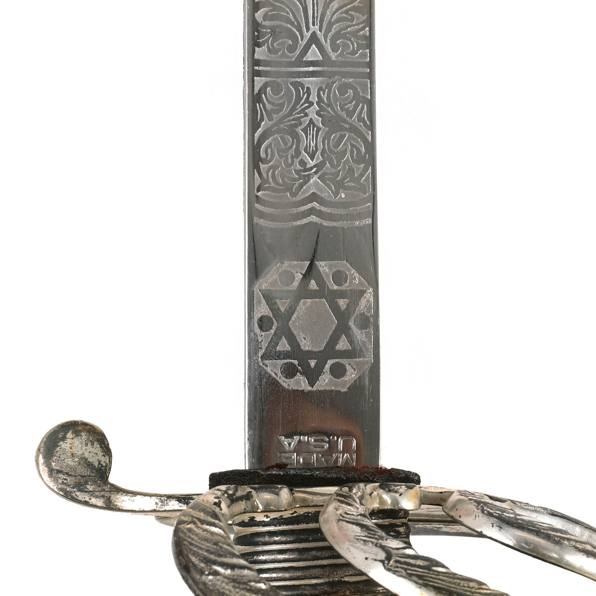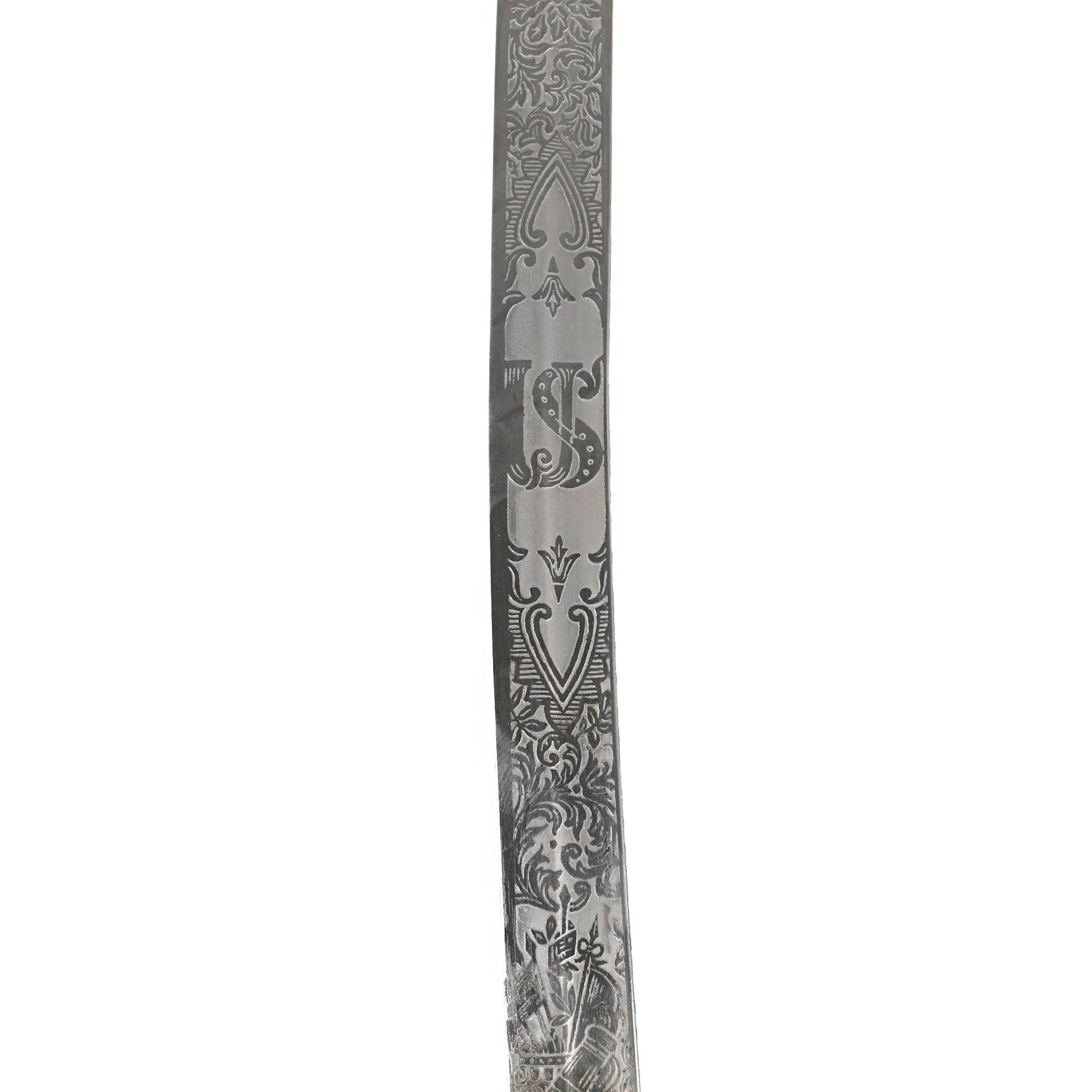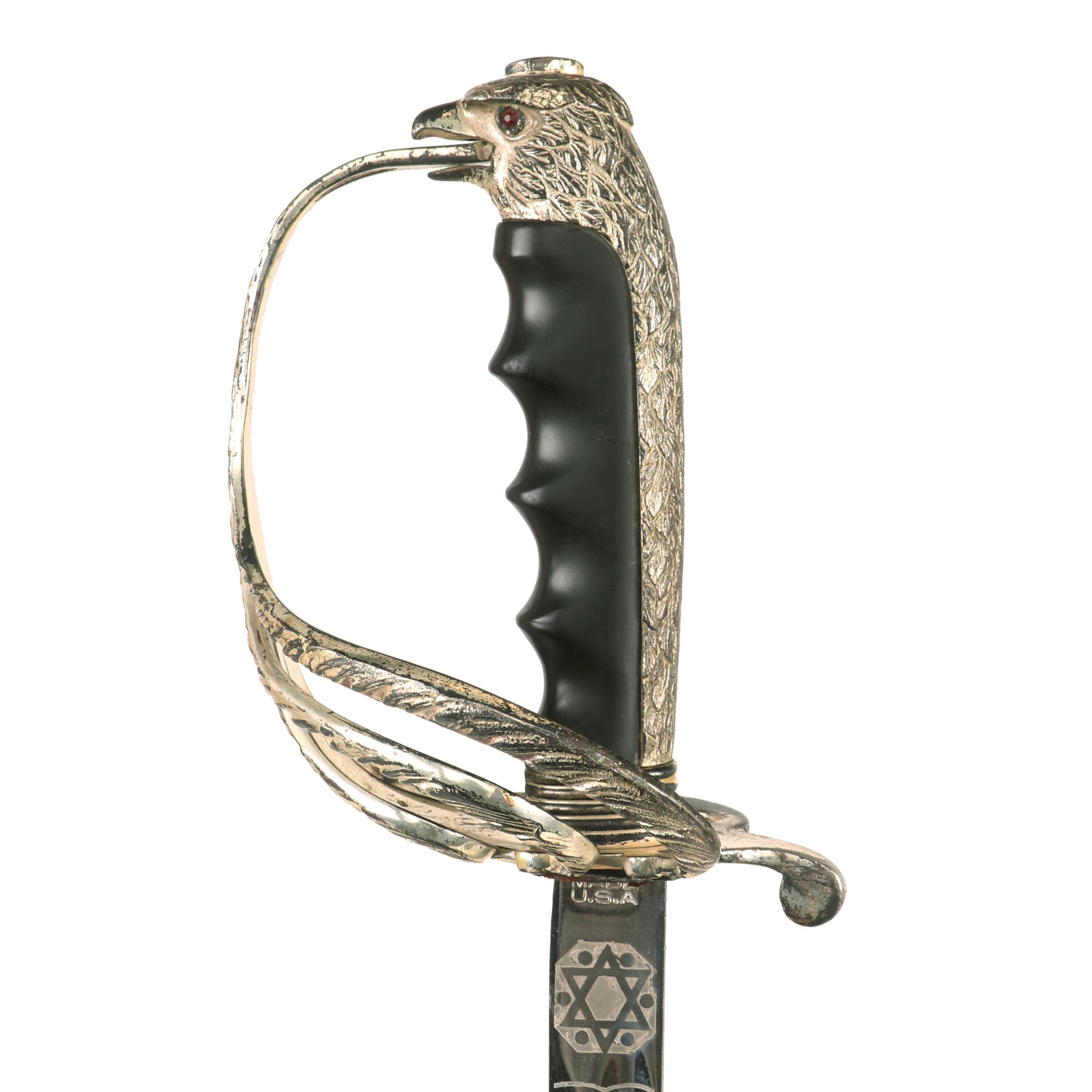Original Item: Only-One-Available. This is the official U.S. Army Officer's Sword, introduced in the early 1900's (M-1902). It has a four bar nickel plated hand guard, black plastic finger grooved grip, slim slightly curved fully etched and nickel-plated blade. The etched design has typical United States Military emblems, including the Federal Eagle, crossed cannons, flags, and so forth. The ricasso is marked on both sides with U.S.A. MADE / N.S. MEYER / NEW YORK.