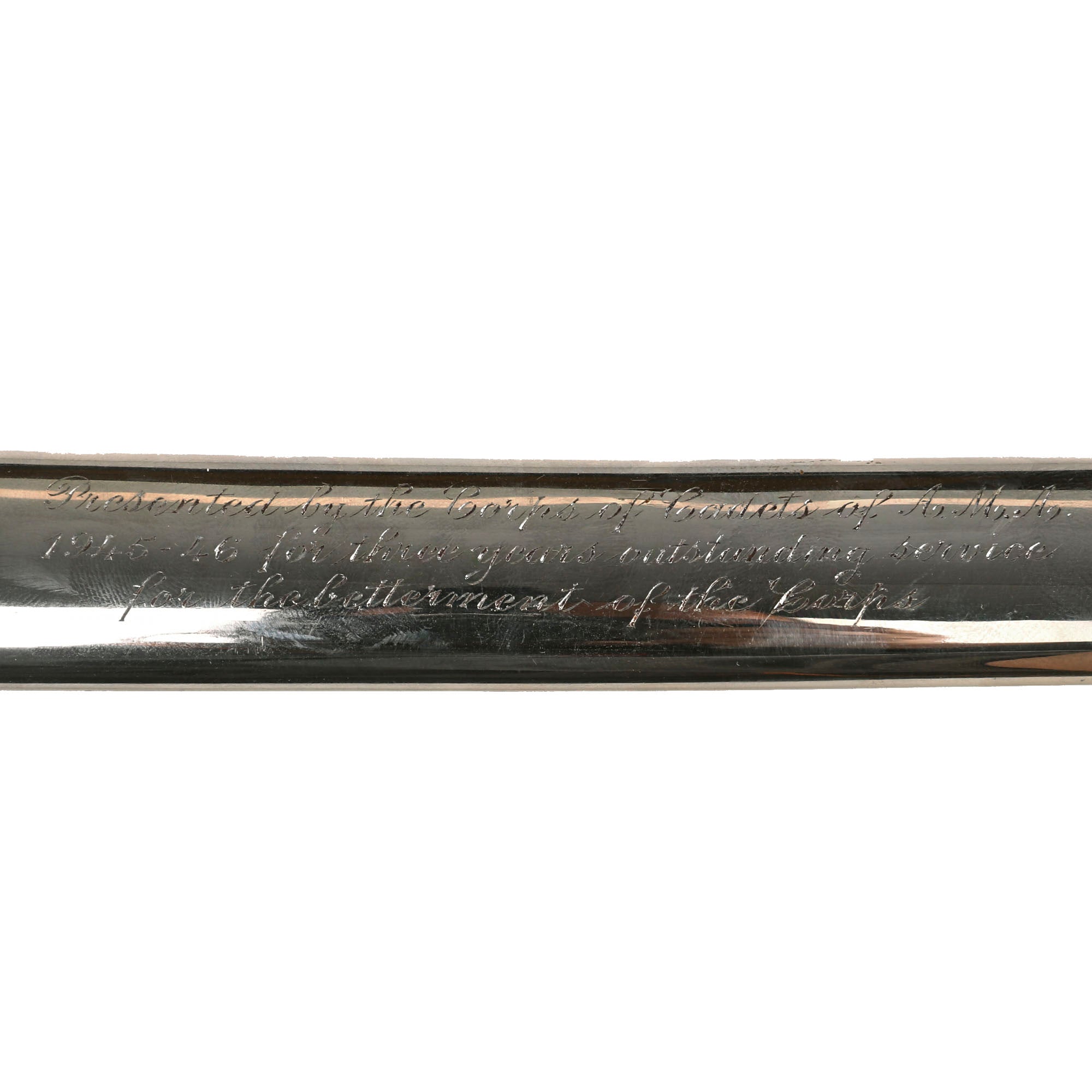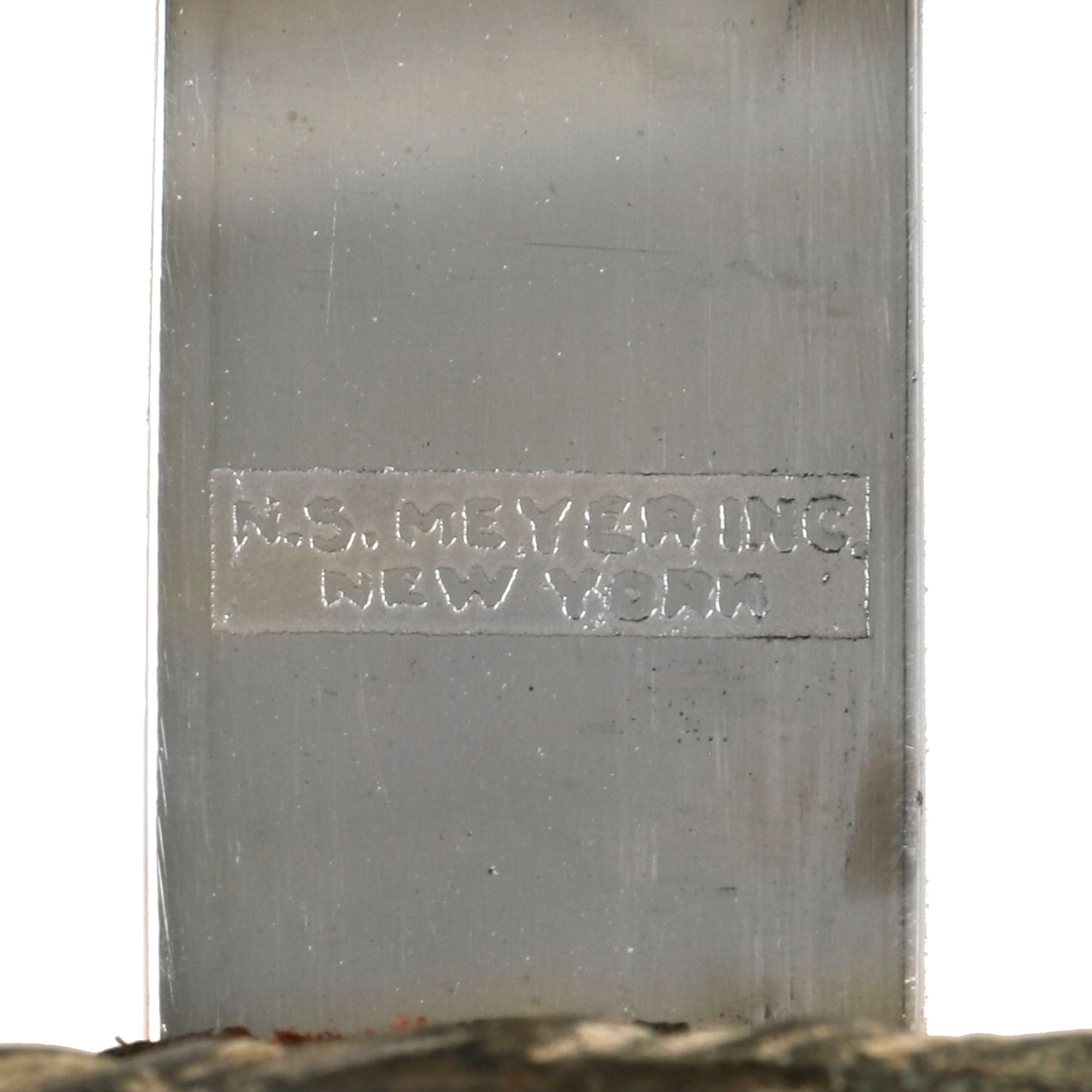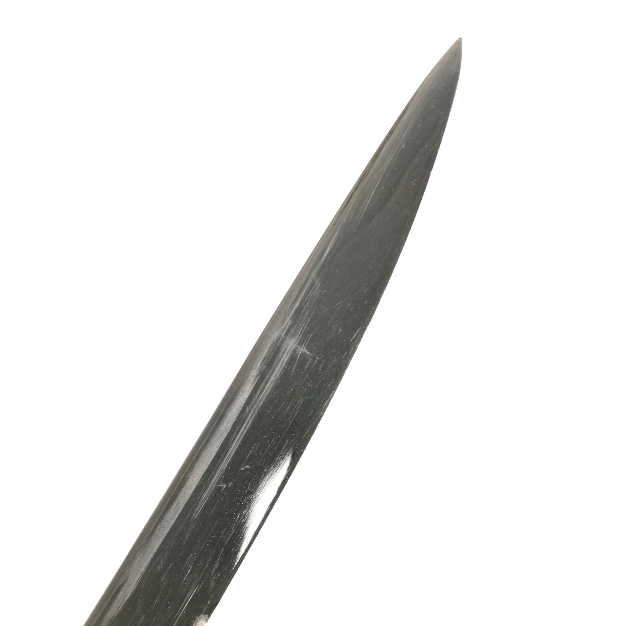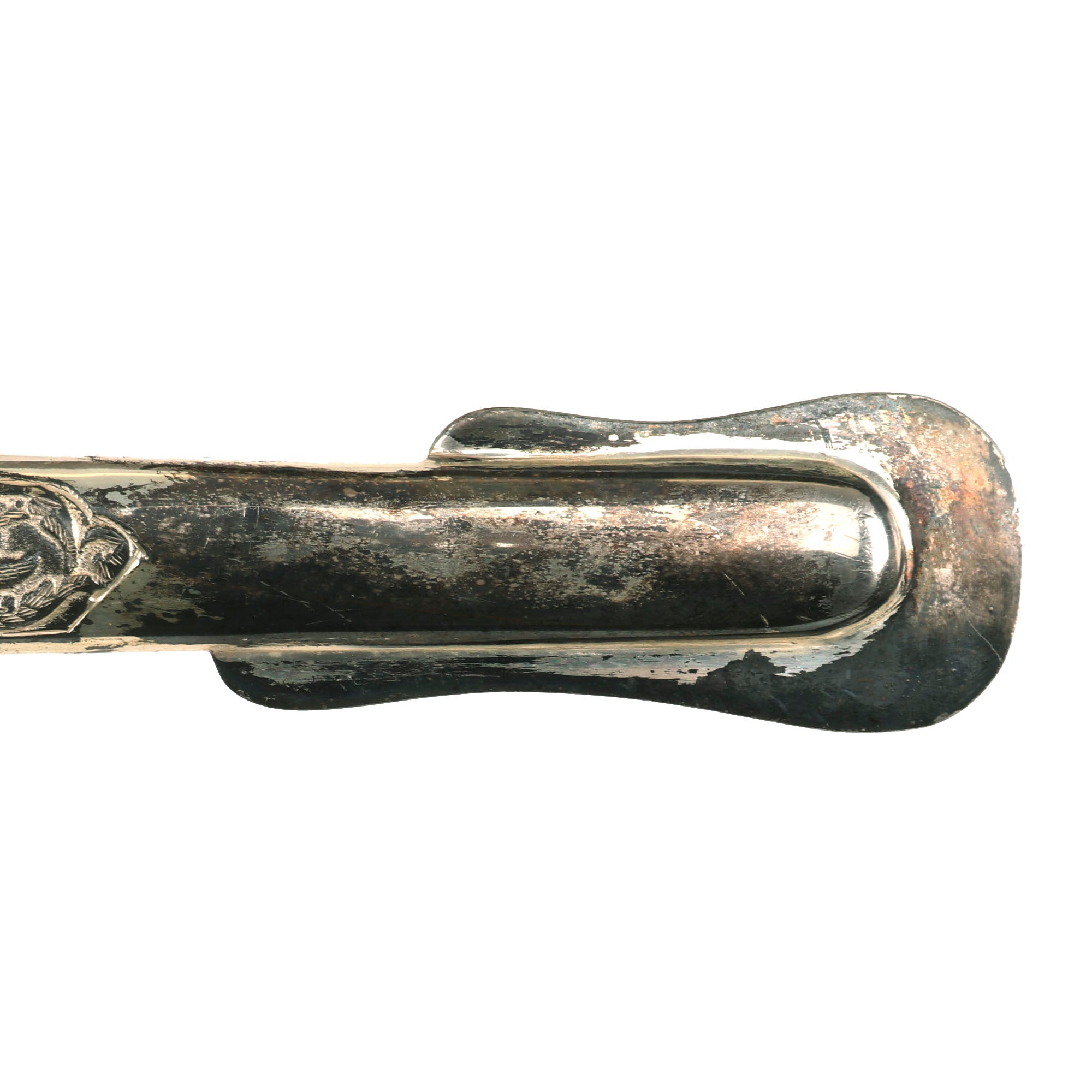 Original Item: Only-One-Available. This is the official U.S. Army Officer's Sword, introduced in the early 1900's (M-1902). It has a four bar nickel plated hand guard, black plastic finger grooved grip, slim slightly curved fully etched and nickel-plated blade. The etched design has typical United States Military emblems, including the Federal Eagle, crossed cannons, flags, and so forth. The ricasso is marked on both sides with U.S.A. MADE / N.S. MEYER / NEW YORK.