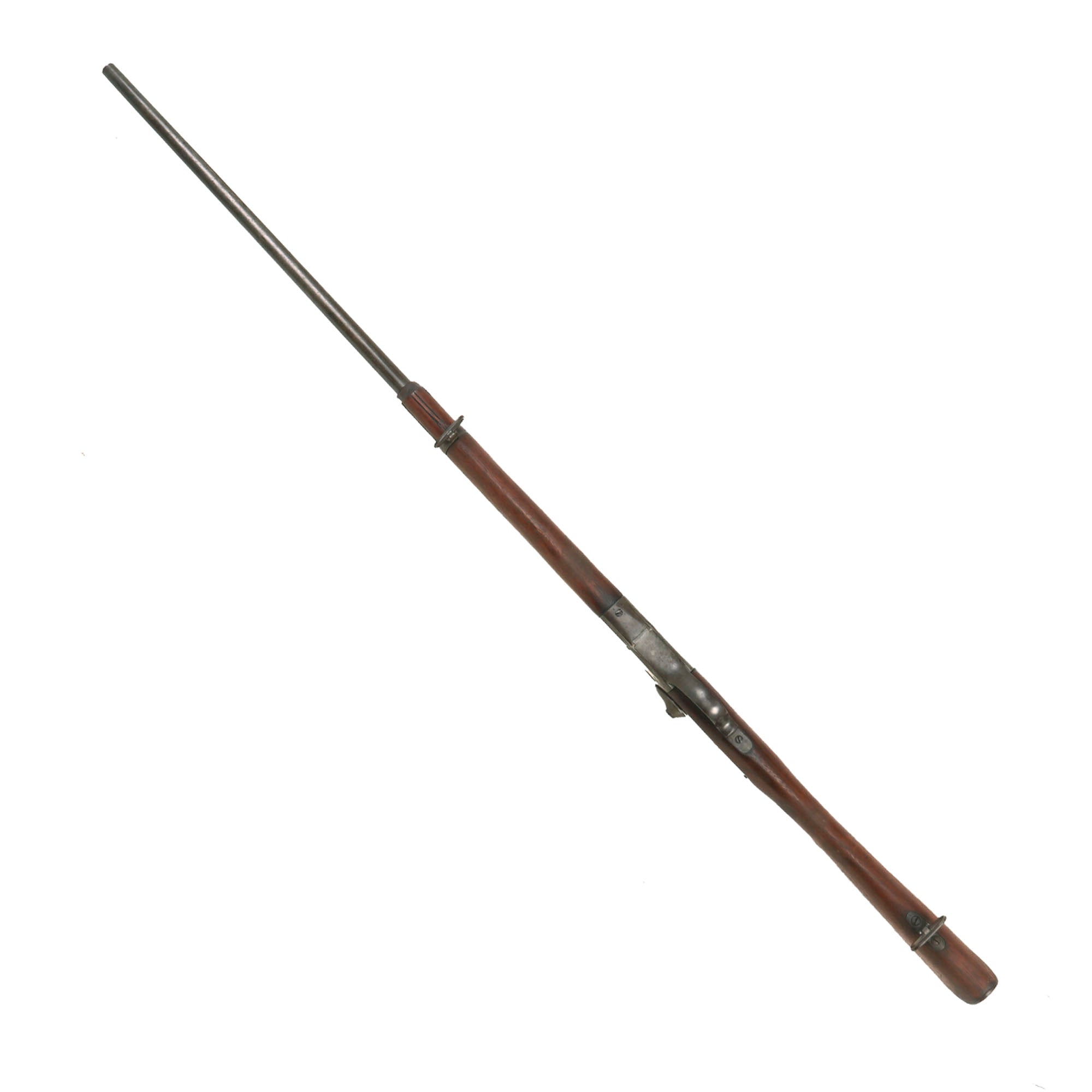 This originally had the rear sight, but it was at some point ground off, leaving just some of the base in the dovetail. The fore stock was cut back to about 3 inches past the lower barrel band, and the barrel was bored out from .45" to about .53", or 32 gauge. We assume this was done to convert the rifle to a single shot sporting gun, for use in shooting sports or for the hunting of small game. The sling swivels were left intact, and the bevel on the front of the stock is not exactly professionally done, so we do not believe that all of this was an arsenal level modification.