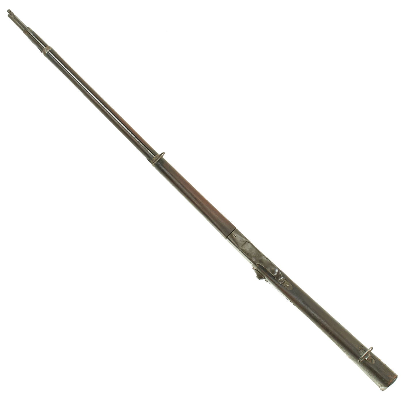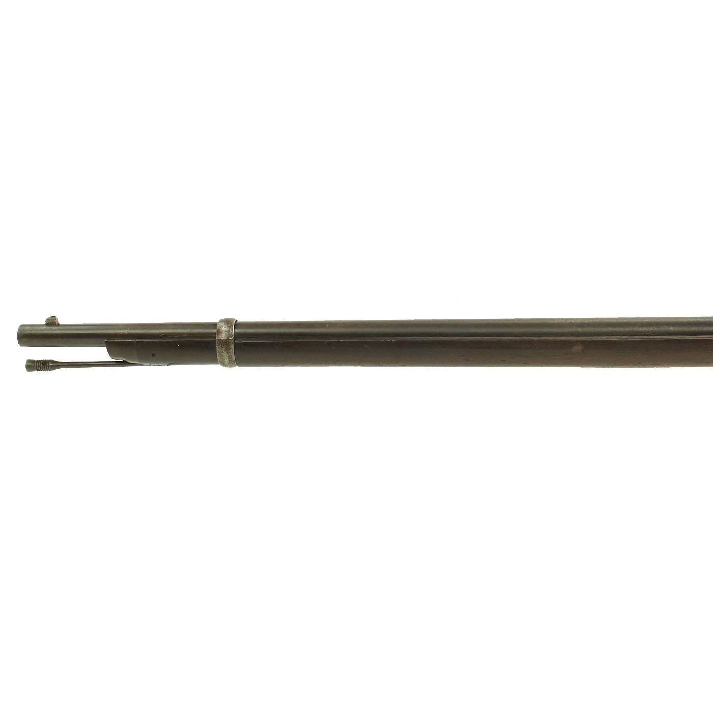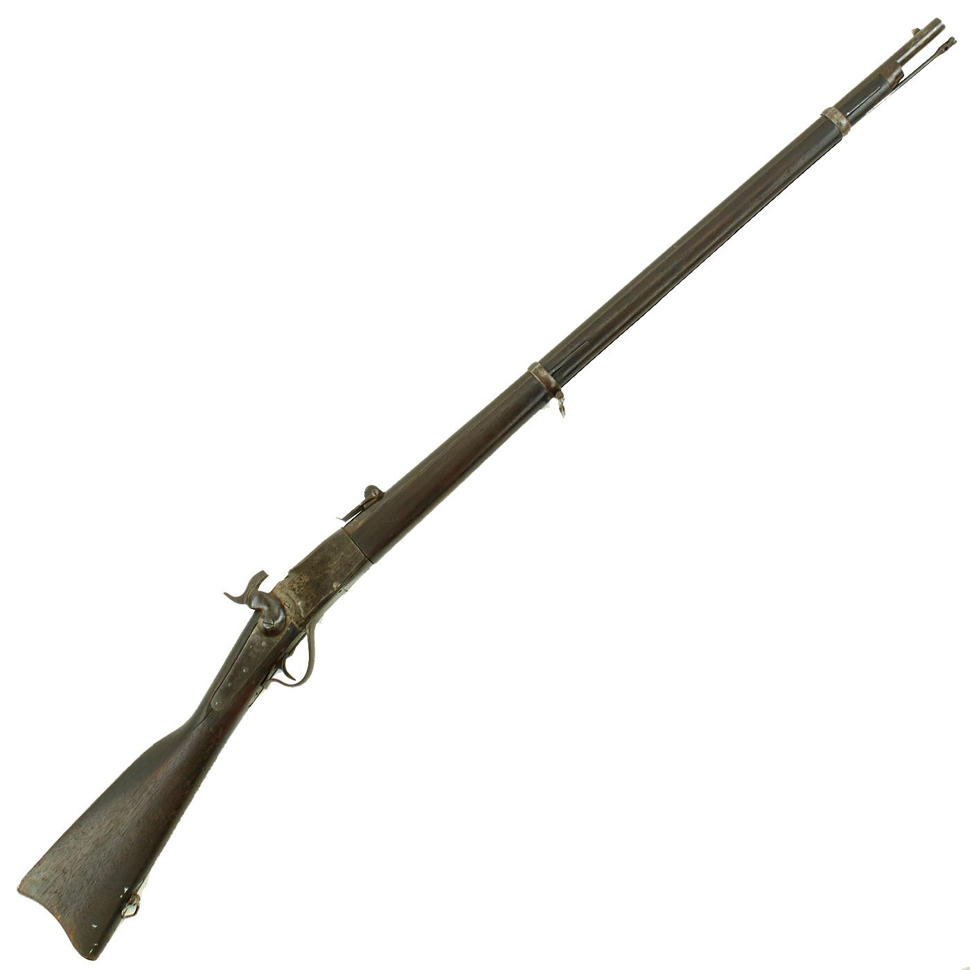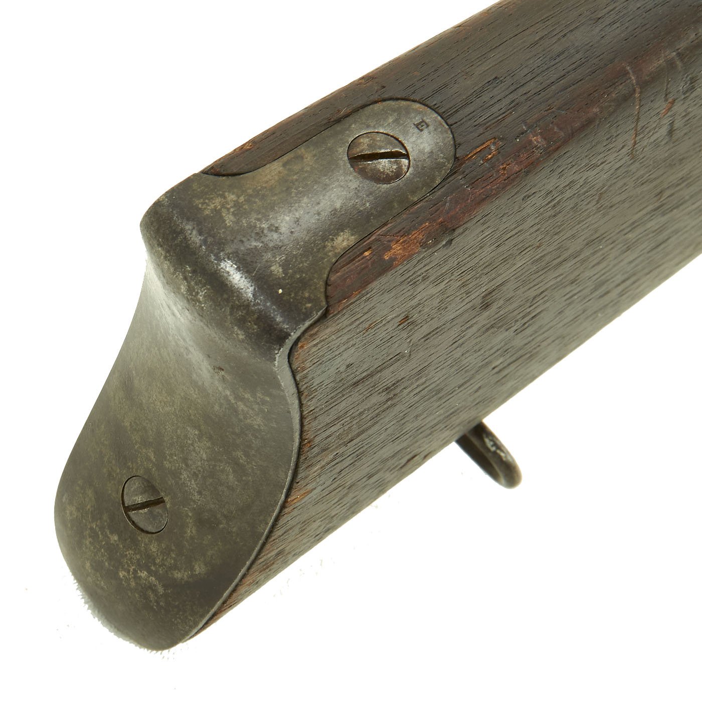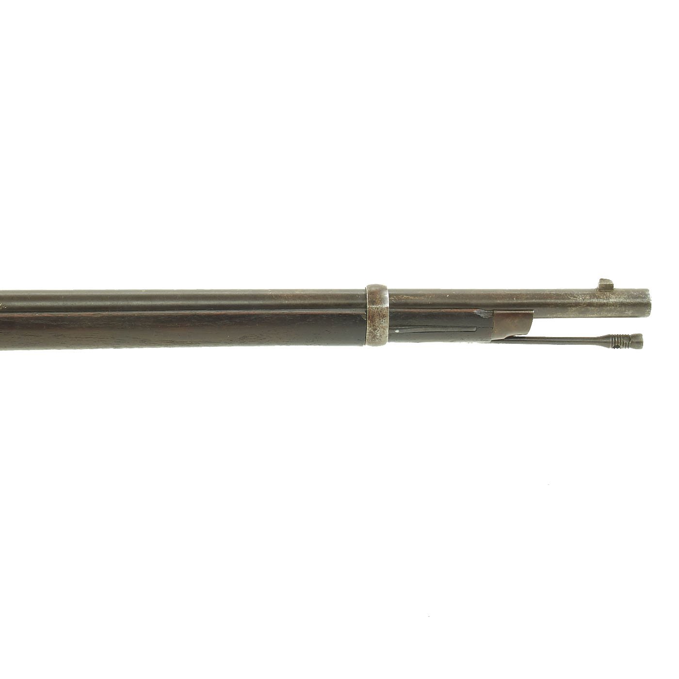 This gun is in very good condition, especially considering that it is close to 150 years in age. The wood stock has the lovely brown red color of aged walnut, though it does have some dents and wear, as expected on an old service rifle. The metalwork has a lovely gray patina, with few spots of peppering. There is however some past pitting on the right side of the receiver.