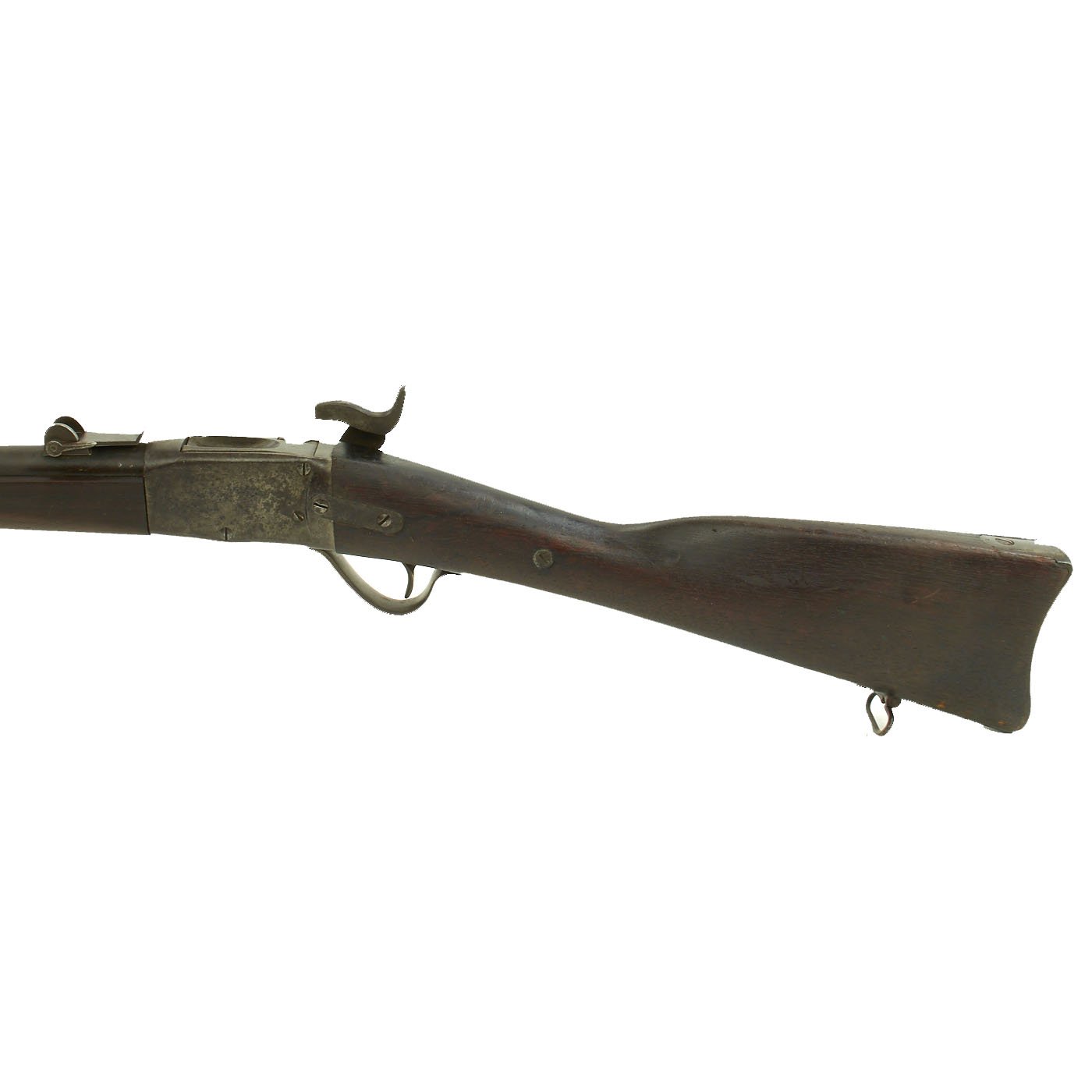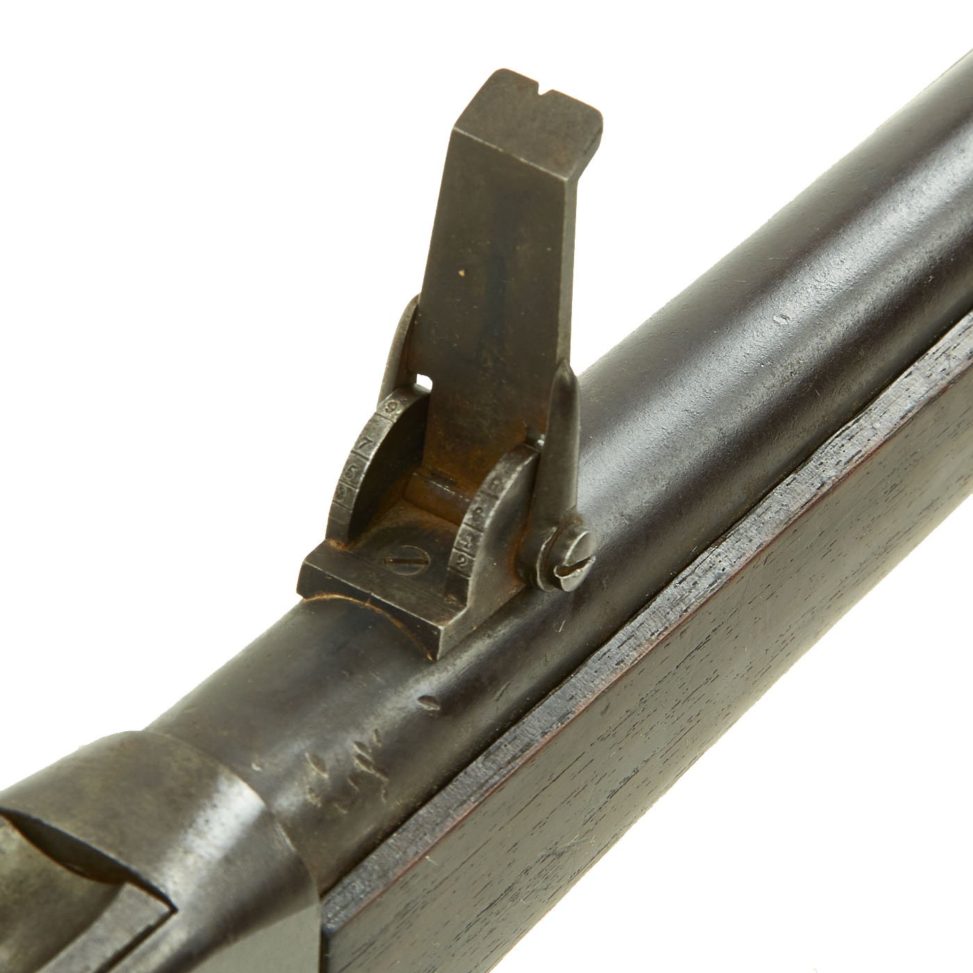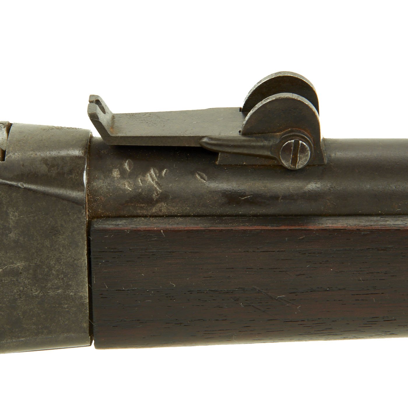 Providence was however able to acquire many foreign contracts, one of which was to supply Romania. These were chambered in .45 Romanian 11.43mm x 49mmR, which many believe to be a slightly necked out .43 Spanish Cartridge. These rifles look identical externally to most of the other types, however they have a unique rear single leaf pivot sight. The leaf reaches all the way back to the end of the receiver, and has a sight notch slightly off to the left. We recently received this fine example from a private collector.