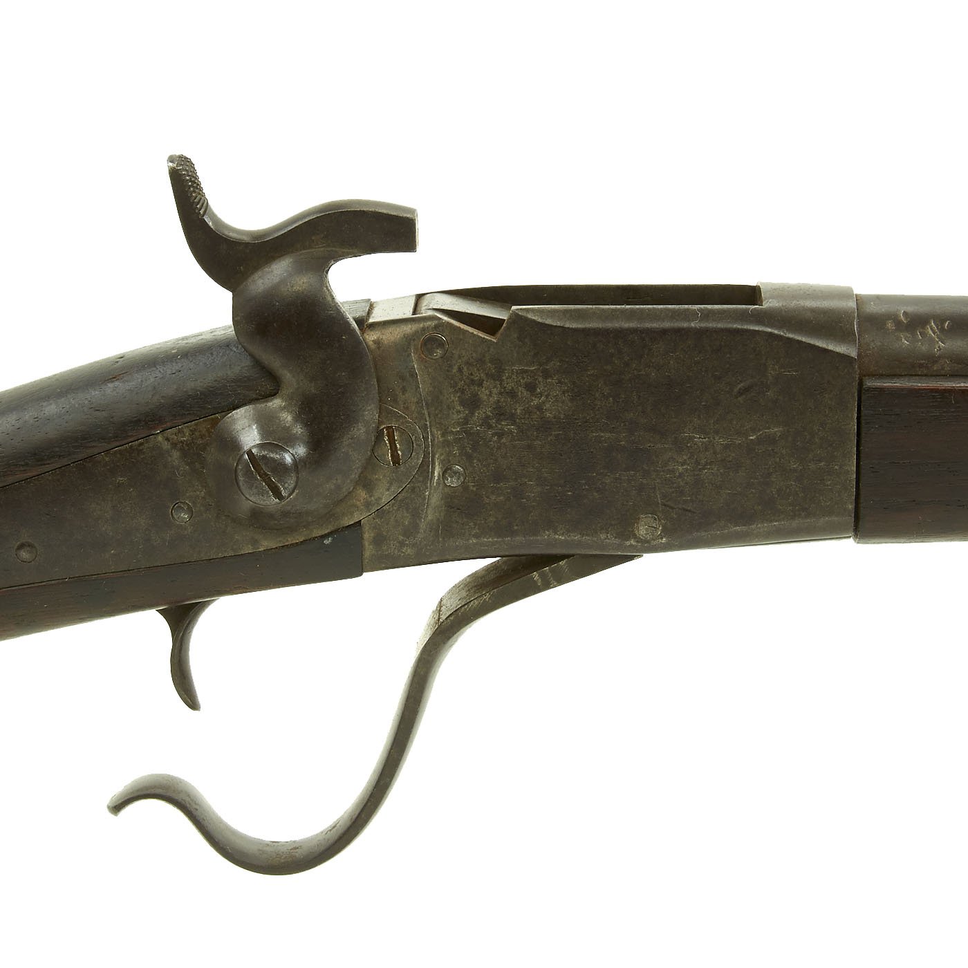 In 1862 Peabody patented a breech-loading rifle but was unable to perfect it in time to play a major role in the American Civil War (1860-1865). His basic design was based upon a pivoting breechblock, the front of which pivoted down on a transverse pin fixed through both the upper rear of the breechblock and the upper rear of the box-like receiver. As the breechblock was lowered, it exposed the barrel chamber and permitted the insertion of a cartridge. The rifle was fired by means of a musket-style outside hammer whose lockwork was inletted into the buttstock behind the receiver.