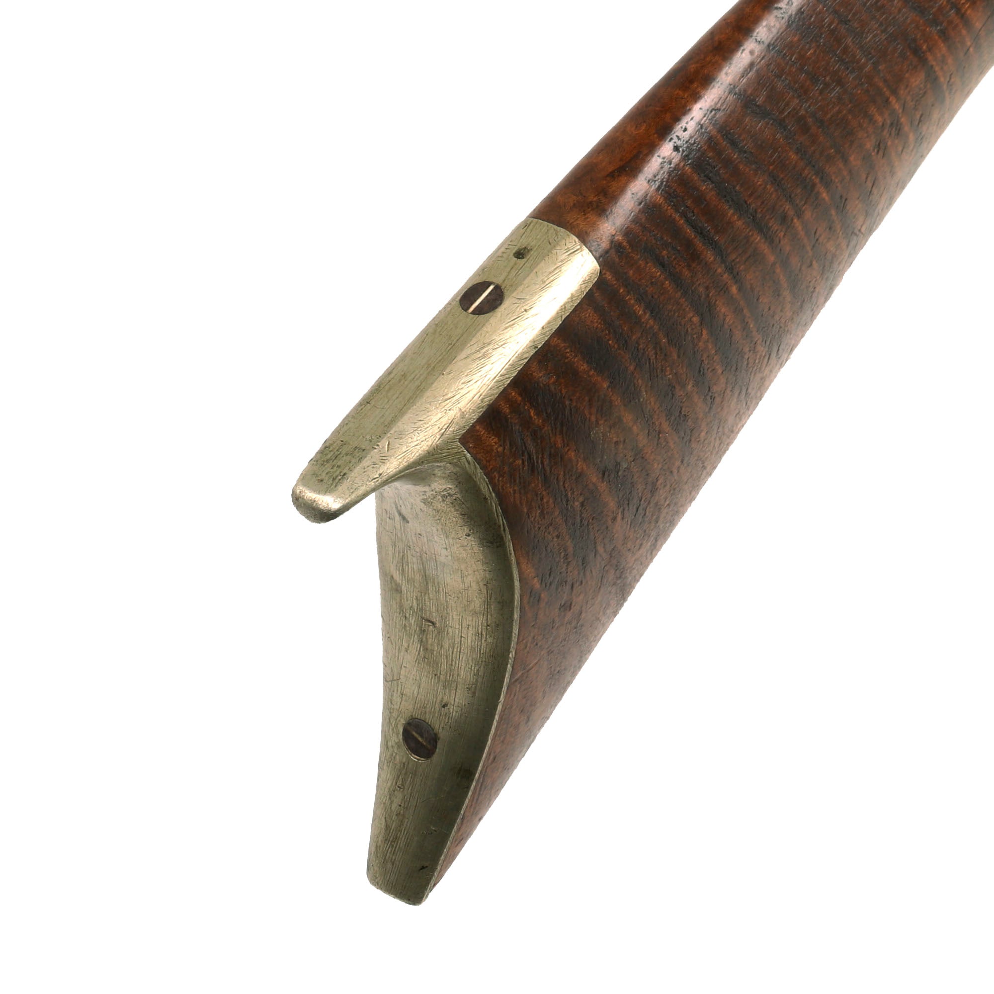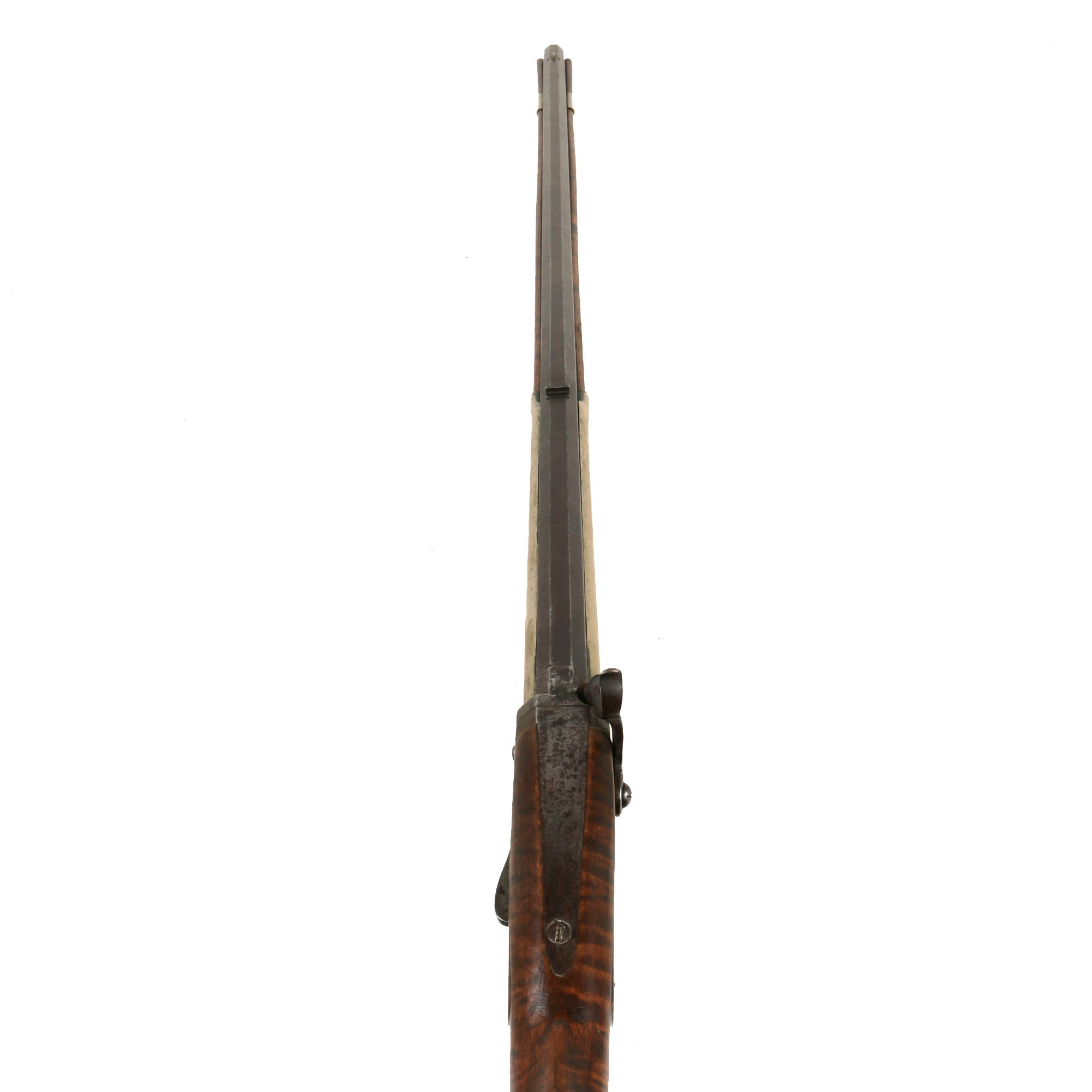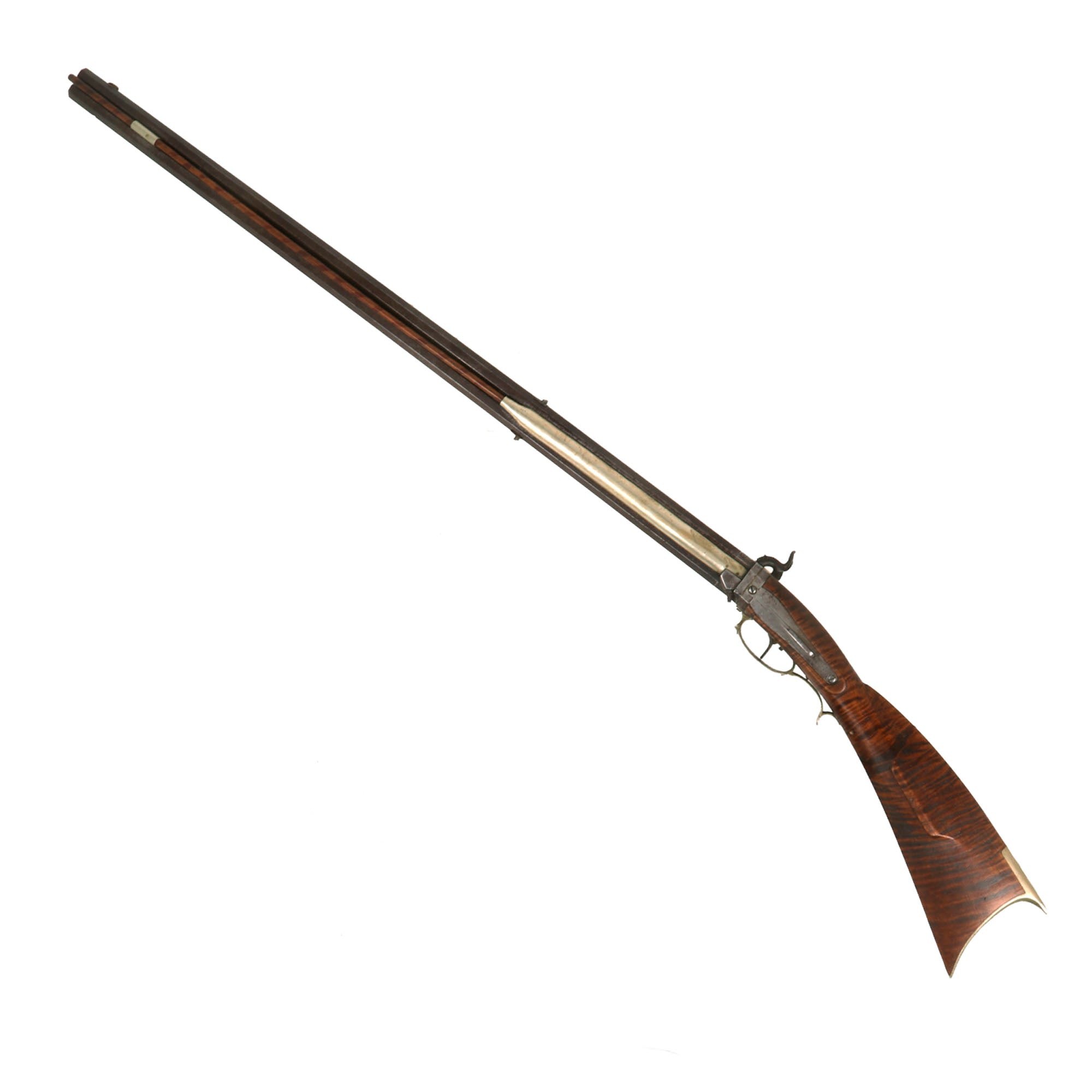 This is too small to be any kind of "combination" gun with a rifle and shotgun barrel, so we assume that the smooth barrel is for close range, while the rifled barrel is for long range. Rifling was more prone to wear and fouling, so it was probably preferable to use the smooth barrel when applicable. The rifle is definitely a high grade example, which is quite the looker due to the lovely "Tiger Flame" maple half stock. It is all "German Silver" mounted, and the rifle features a 36 1/4 inch long octagonal double barrel assembly, and an overall length of 52 3/4 inches. With two barrels in front, it is definitely quite heavy, almost as heavy as "bench rest" rifles of the day.