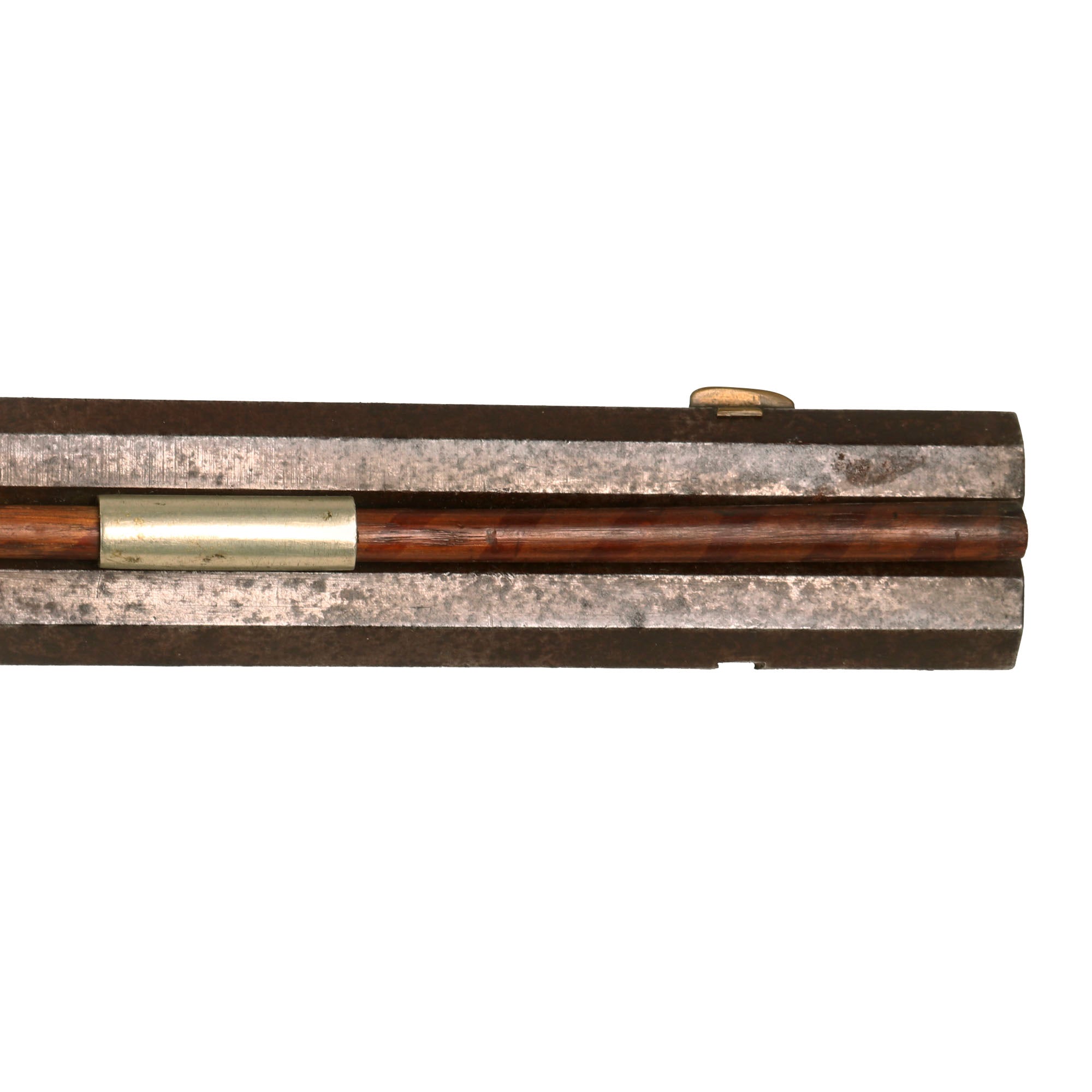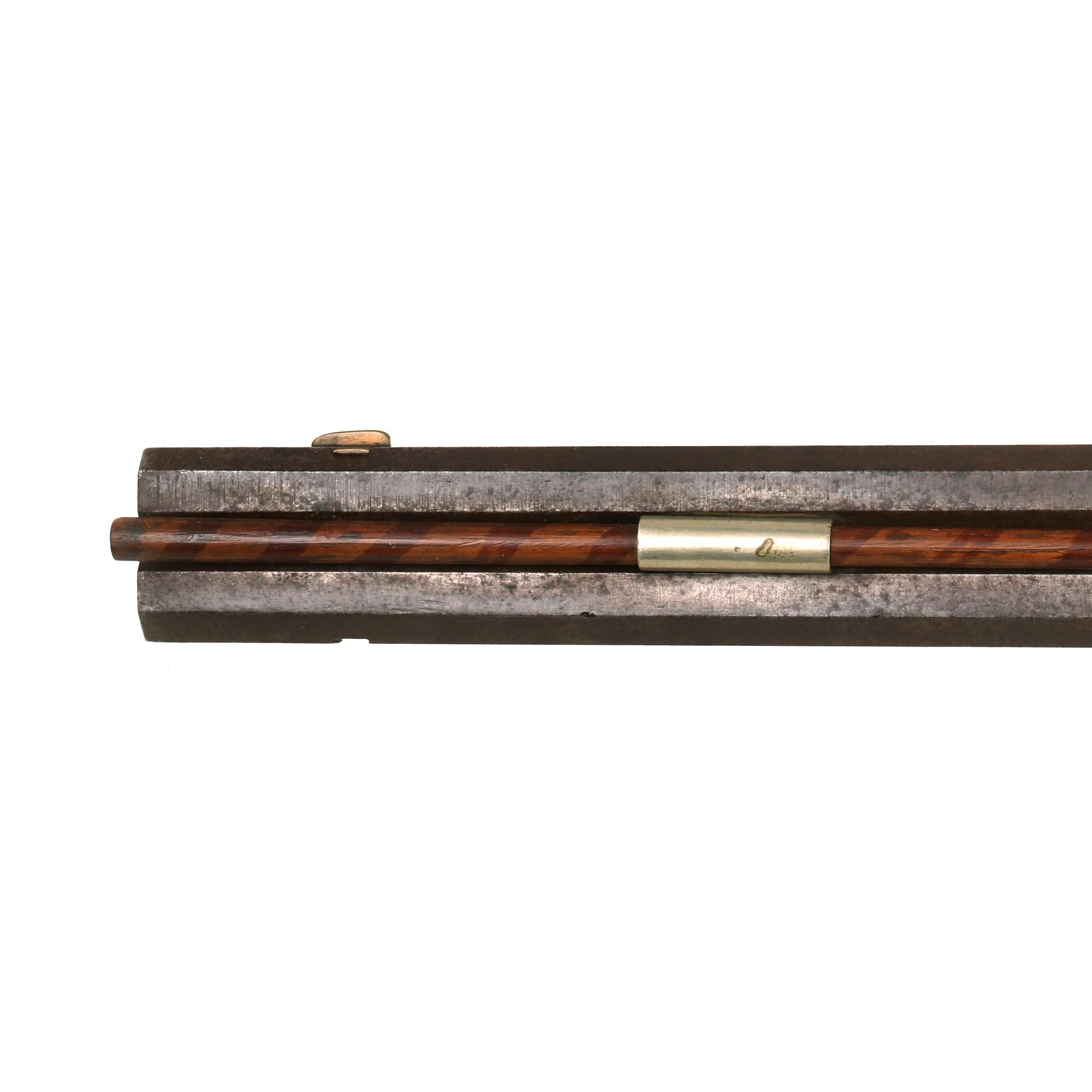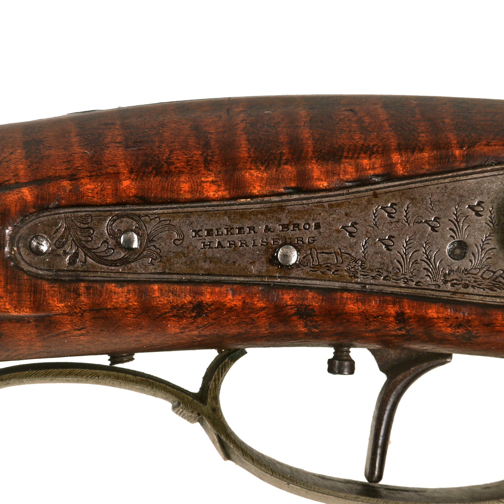 Kelker & Bros was a known maker located at 17 South 2nd St, Harrisburg, Dauphin County, Pennsylvania. There is a lock plate on the left side, but it is actually the latch for the "turnover" swivel joint in the barrel. This mechanism still works very well, though as with most the lock must be cocked to swivel the barrels so that the hammer is not in the way. We checked the lock, and it holds securely at full cock, and does not appear to have any provision for a half cock position. We checked both bores, and they are clear and mostly clean, with some fouling in the 7 groove rifling on the rifled side. Both sides have a rear sight, however the front sight on the rifled side is missing. There are ramrods fitted into long German silver fittings on both sides of the barrel assembly, one of which has a threaded steel fitting on the end.