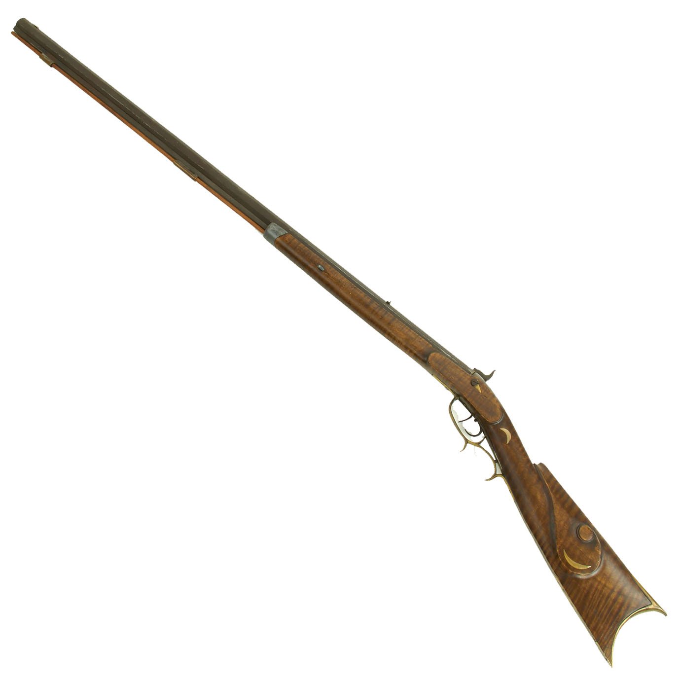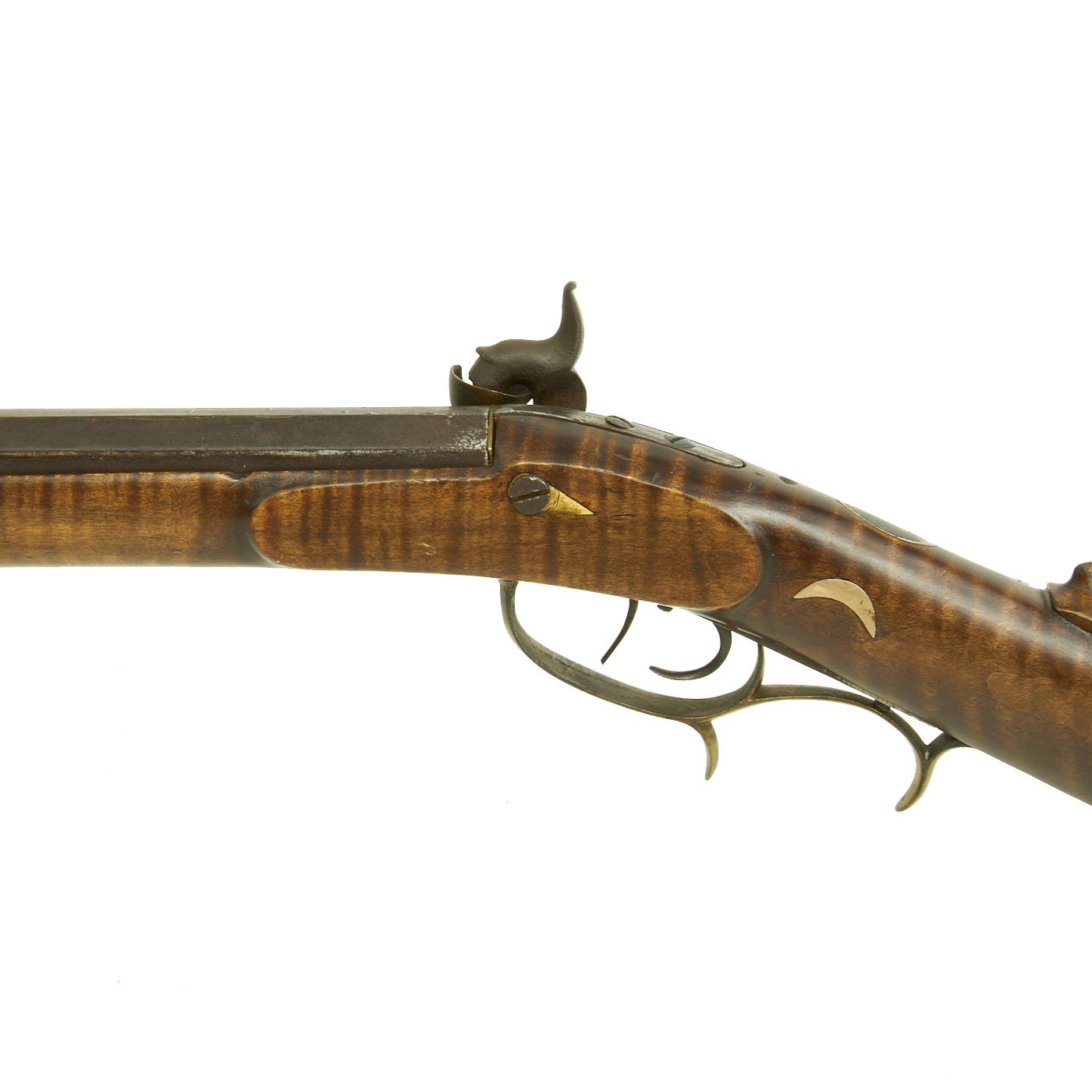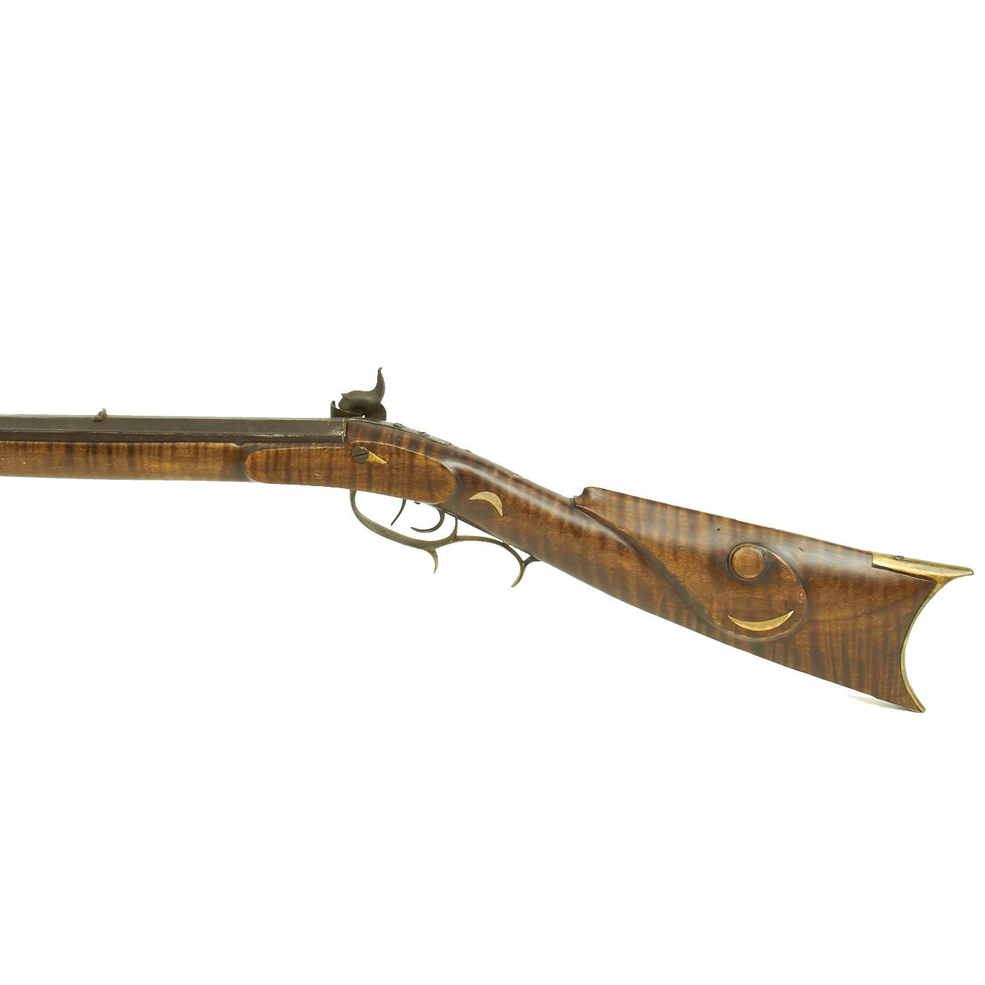 We estimate that this octagonal barrel rifle was made about 1840, and it features all brass mounts except for the white metal nose cap. The half length stock is made of very highly figured "Tiger" or "Flamed" maple, and has a lovely carved "scroll" on both sides of the buttstock. There are also some moon inlays and other metal decorations set into the wood.
