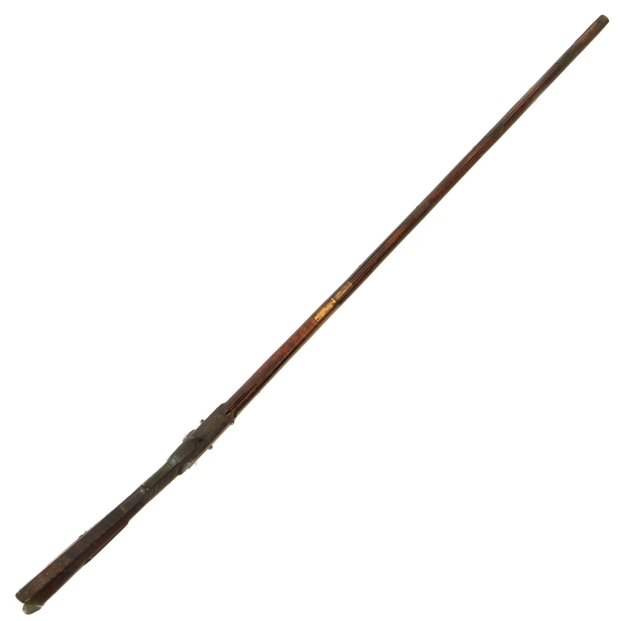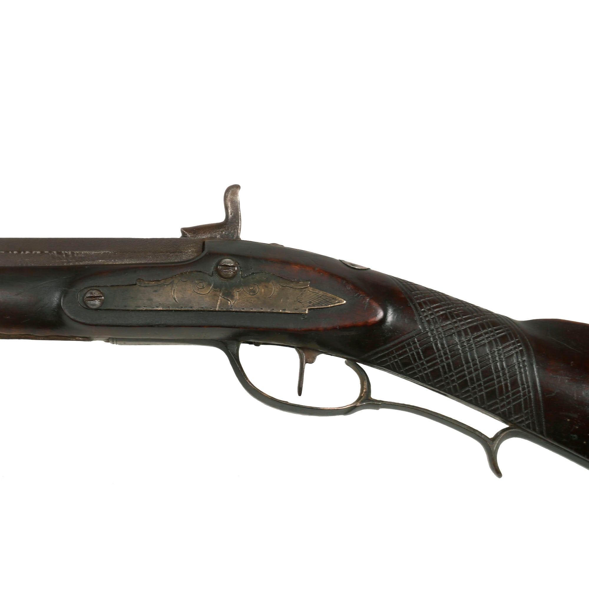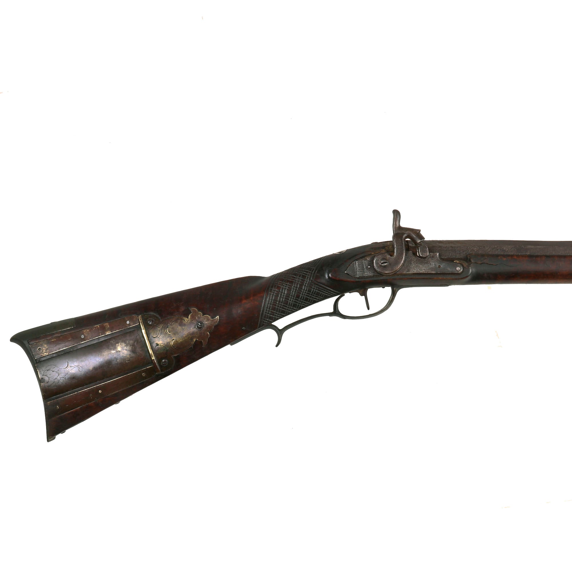 Original Item: Only One Available. Just purchased at a recent military auction! This is a very nice "Pennsylvania" percussion hunting rifle, often referred to as a "Kentucky" rifle. The design developed in Pennsylvania, and then spread down the Ohio River Valley to Kentucky, where it was very popular. This is a nice well-used example, with a lovely "Flame" figured full stock and patinated all brass mounts. The rifle features a 45 3/4 inch long octagonal barrel with 6 groove rifling and a bore of .51", one of the larger sizes seen for Pennsylvania rifles. It does look to have been bored out or just worn out a lot, and we can no longer see any rifling on the interior. Overall length is 61 1/4" and the barrel is octagonal for about a third of the length closest to the breech, with the rest being round to keep the weight down.