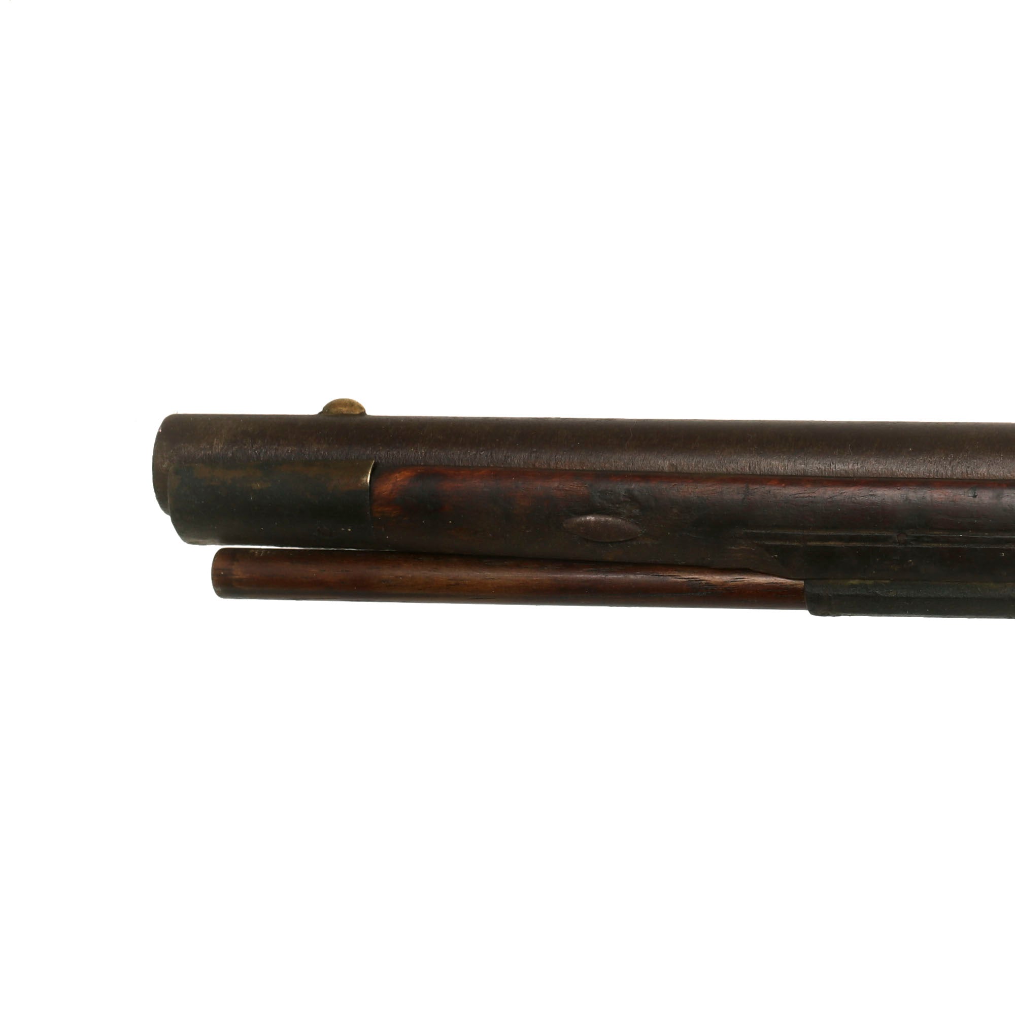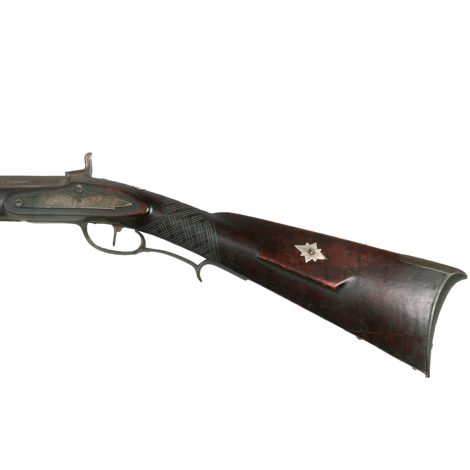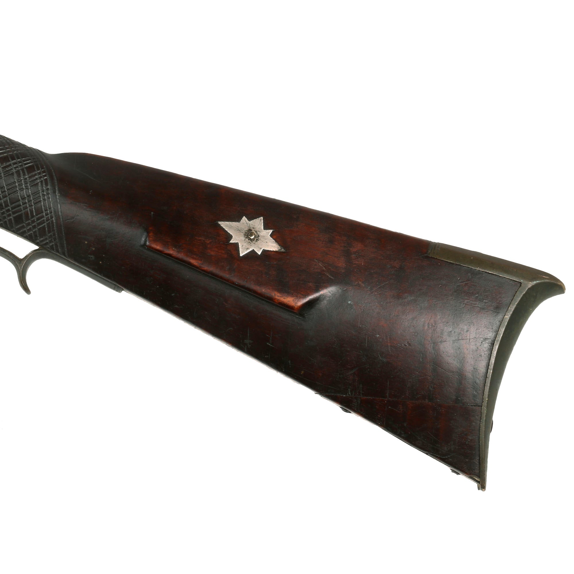 Original Item: Only One Available. Just purchased at a recent military auction! This is a very nice "Pennsylvania" percussion hunting rifle, often referred to as a "Kentucky" rifle. The design developed in Pennsylvania, and then spread down the Ohio River Valley to Kentucky, where it was very popular. This is a nice well-used example, with a lovely "Flame" figured full stock and patinated all brass mounts. The rifle features a 45 3/4 inch long octagonal barrel with 6 groove rifling and a bore of .51", one of the larger sizes seen for Pennsylvania rifles. It does look to have been bored out or just worn out a lot, and we can no longer see any rifling on the interior. Overall length is 61 1/4" and the barrel is octagonal for about a third of the length closest to the breech, with the rest being round to keep the weight down.