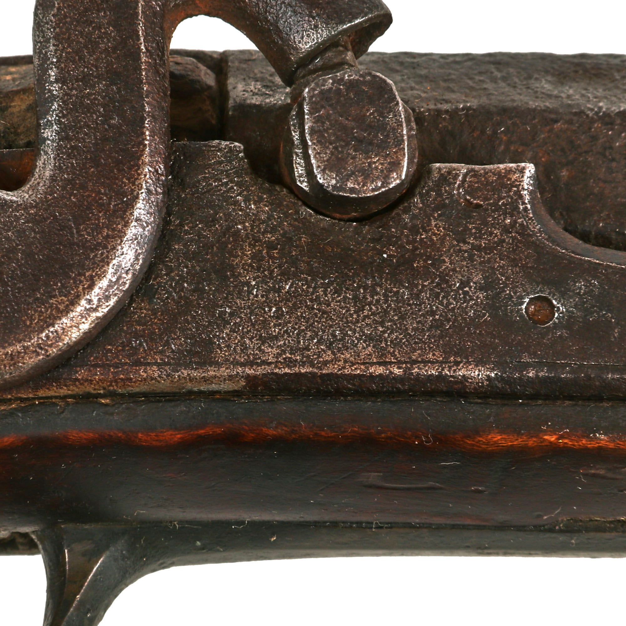 The rifle is in overall very good condition, with wear commensurate with age and service. It features a simple rear notch sight with a front brass blade sight, with no signs of the sights having been replaced. We checked the lock and it is functional, however it does not hold at half cock. Close examination shows that the lock was originally flintlock, with a frizzen, spring, and pan, but it was converted to take percussion caps by installing a new hammer. The barrel was fitted with a "barrel" style bolster on the right side. We checked the bore, and it definitely looks to have been smoothbored to use as a fowling piece. It has light rust overall, and definitely saw extensive use.
