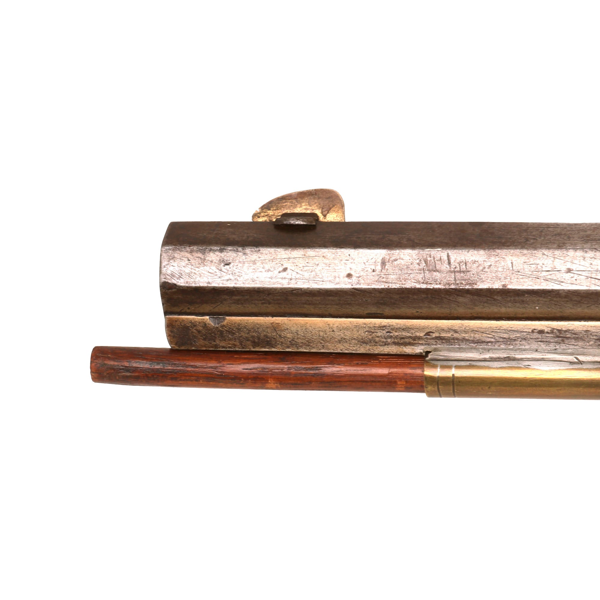 This is a great example, with a lovely "Tiger" flamed maple half length stock, which has a beautiful dark finish and features "German Silver" and brass mountings except for the white metal nose cap. It definitely looks to have been in service for a long time, so it may have had further decorations added as time went on. The rifle features a 35 1/4 inch long octagonal barrel with a bore of about 0.39", very common for these rifles, cut with six groove rifling. Overall length is 51 inches, and the barrel is very heavy for accurate shooting, much like "bench rest" rifles of the day.
