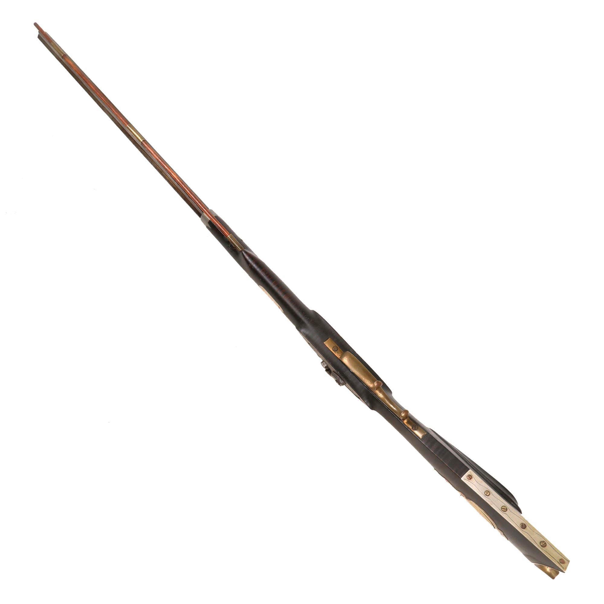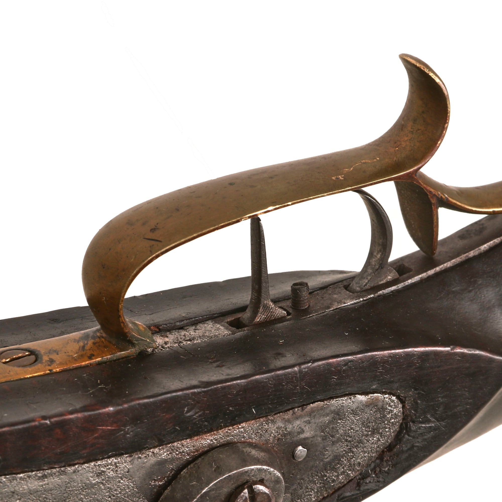 Overall condition is very good, with a lovely look and no major issues. The stock is lovely, showing the "Tiger Flame" figuring clearly throughout its length. There is no major damage that we can see, though there is some damage from rust expansion around the ramrod pipe securing pin. The cleaning rod is a display replacement.