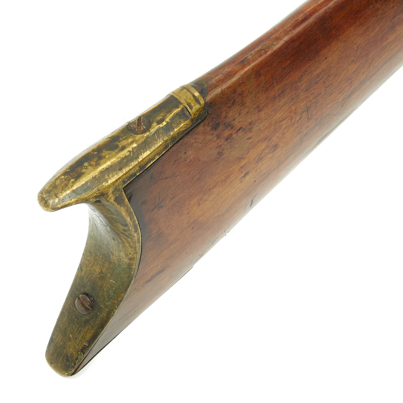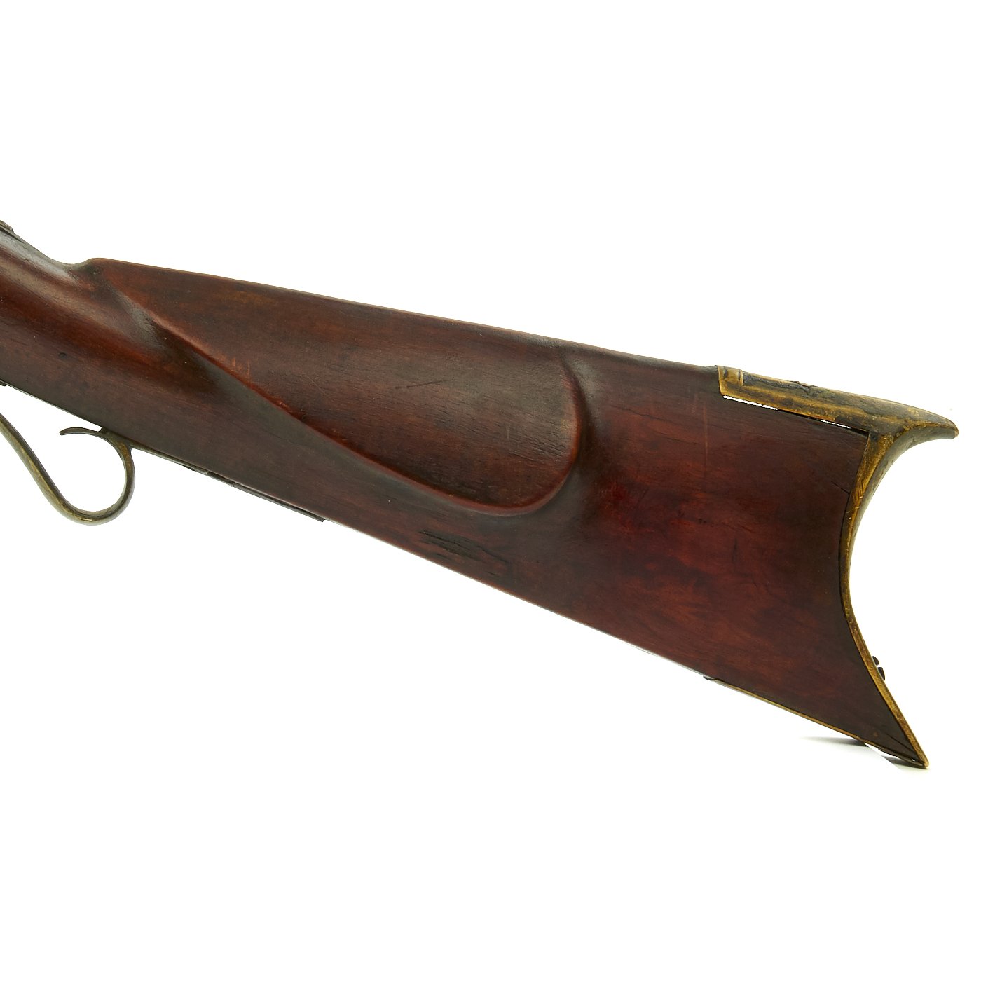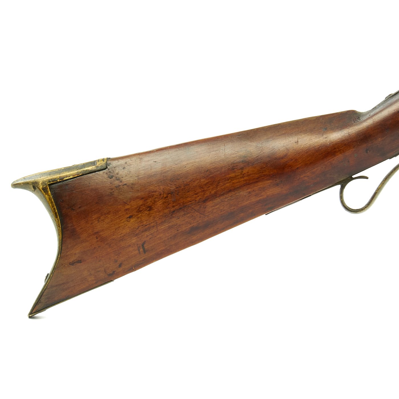 It features all brass mounts except for the nose cap, which is German Silver, and is half stocked. The very heavy octagonal barrel is 38 inches in length and has a .39" bore, a common size for these rifles, and it has 7 groove rifling. The overall length is 54 inches. The Rifle also is equipped with a double set trigger. The lock, as discussed above, is of British make, and is marked JOS'H GOLCHER.