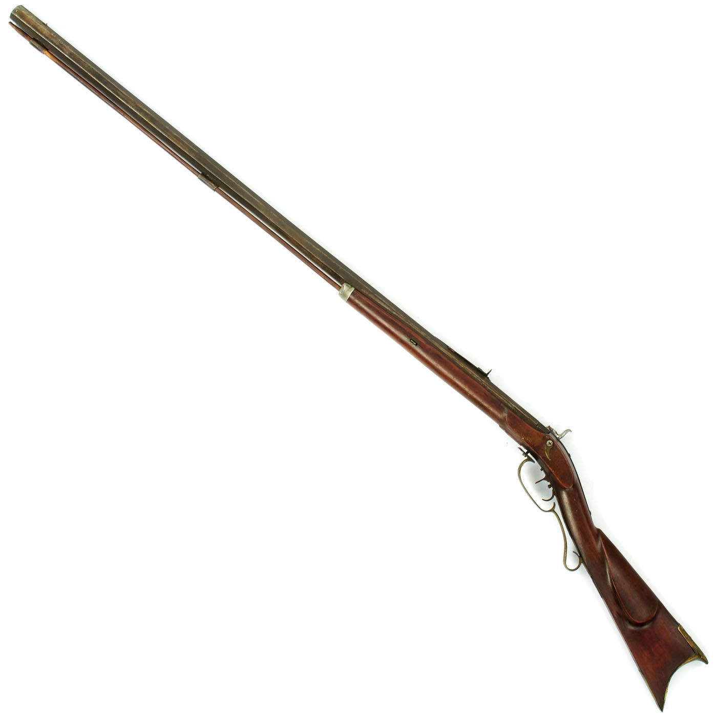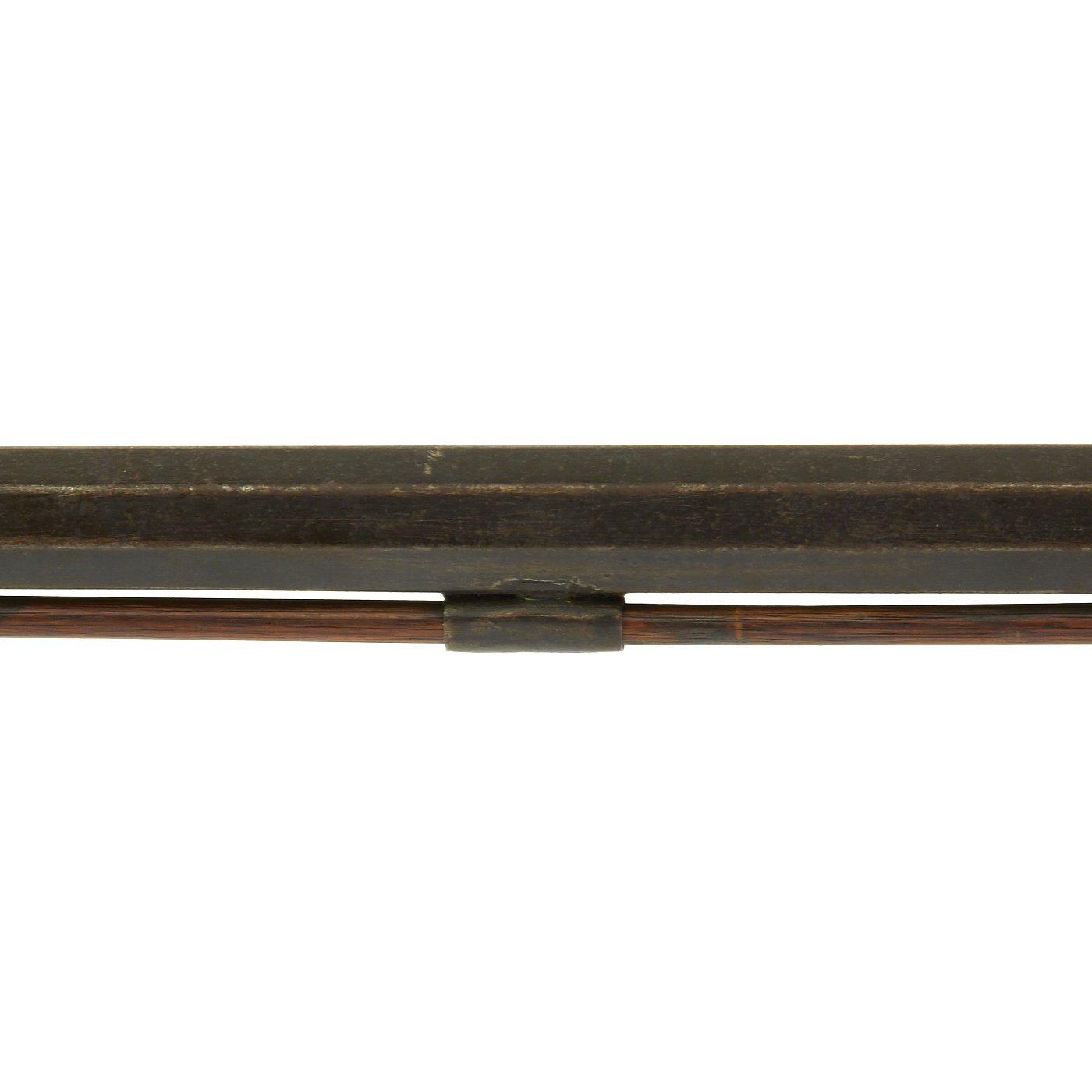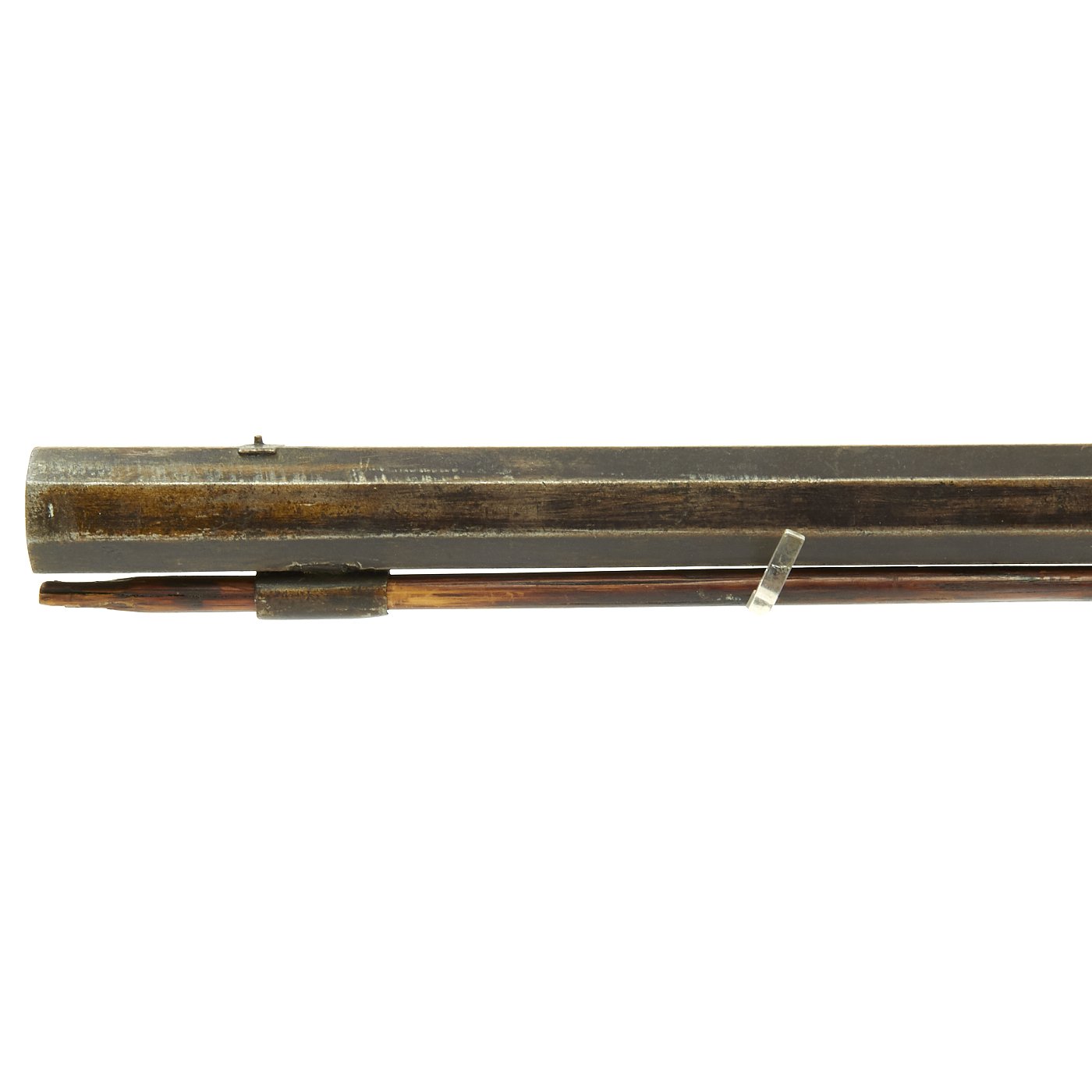 It features all brass mounts except for the nose cap, which is German Silver, and is half stocked. The very heavy octagonal barrel is 38 inches in length and has a .39" bore, a common size for these rifles, and it has 7 groove rifling. The overall length is 54 inches. The Rifle also is equipped with a double set trigger. The lock, as discussed above, is of British make, and is marked JOS'H GOLCHER.