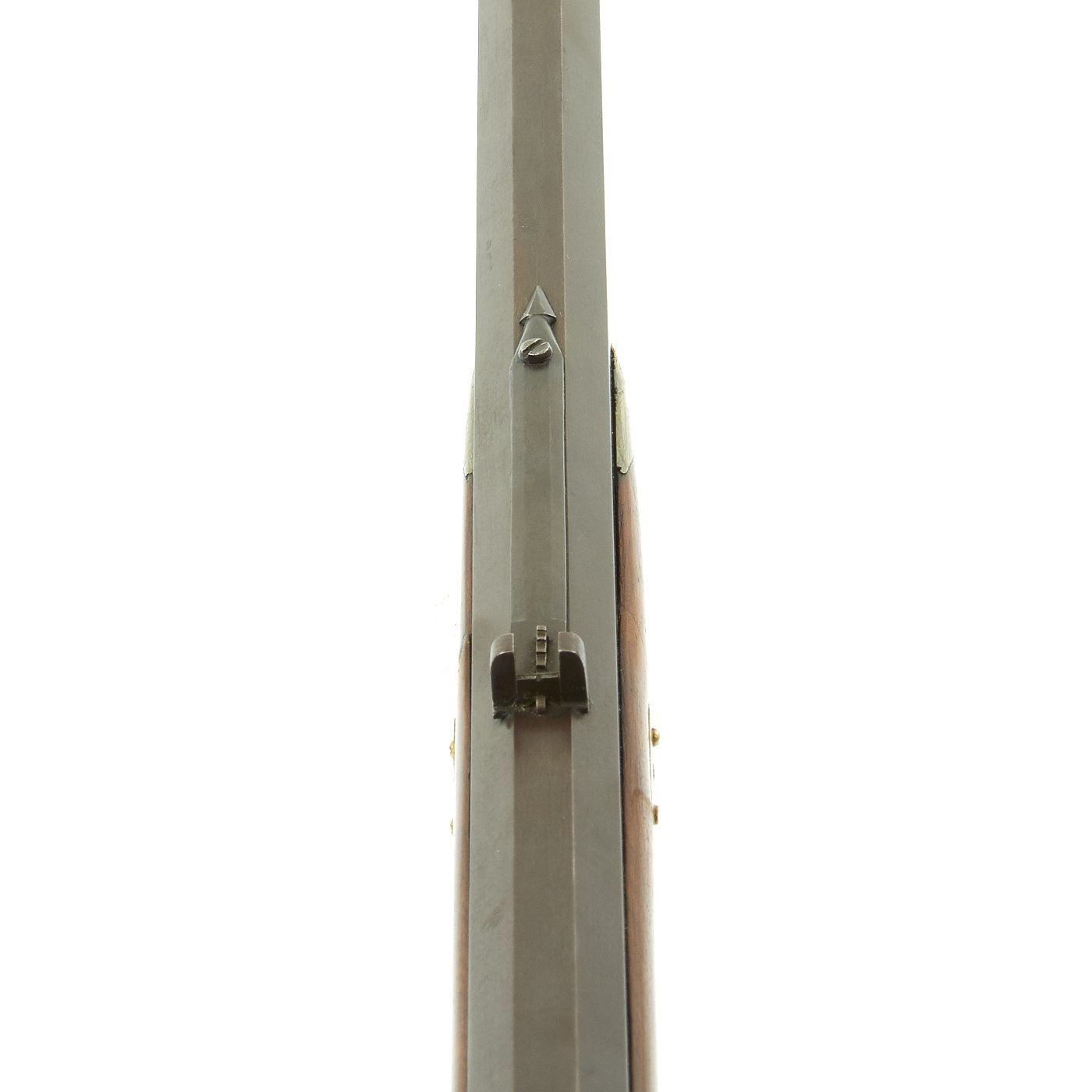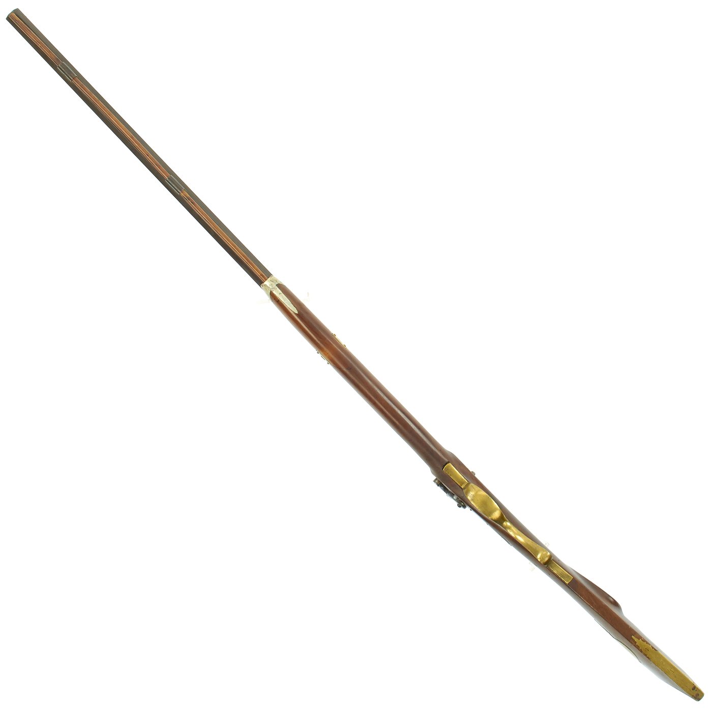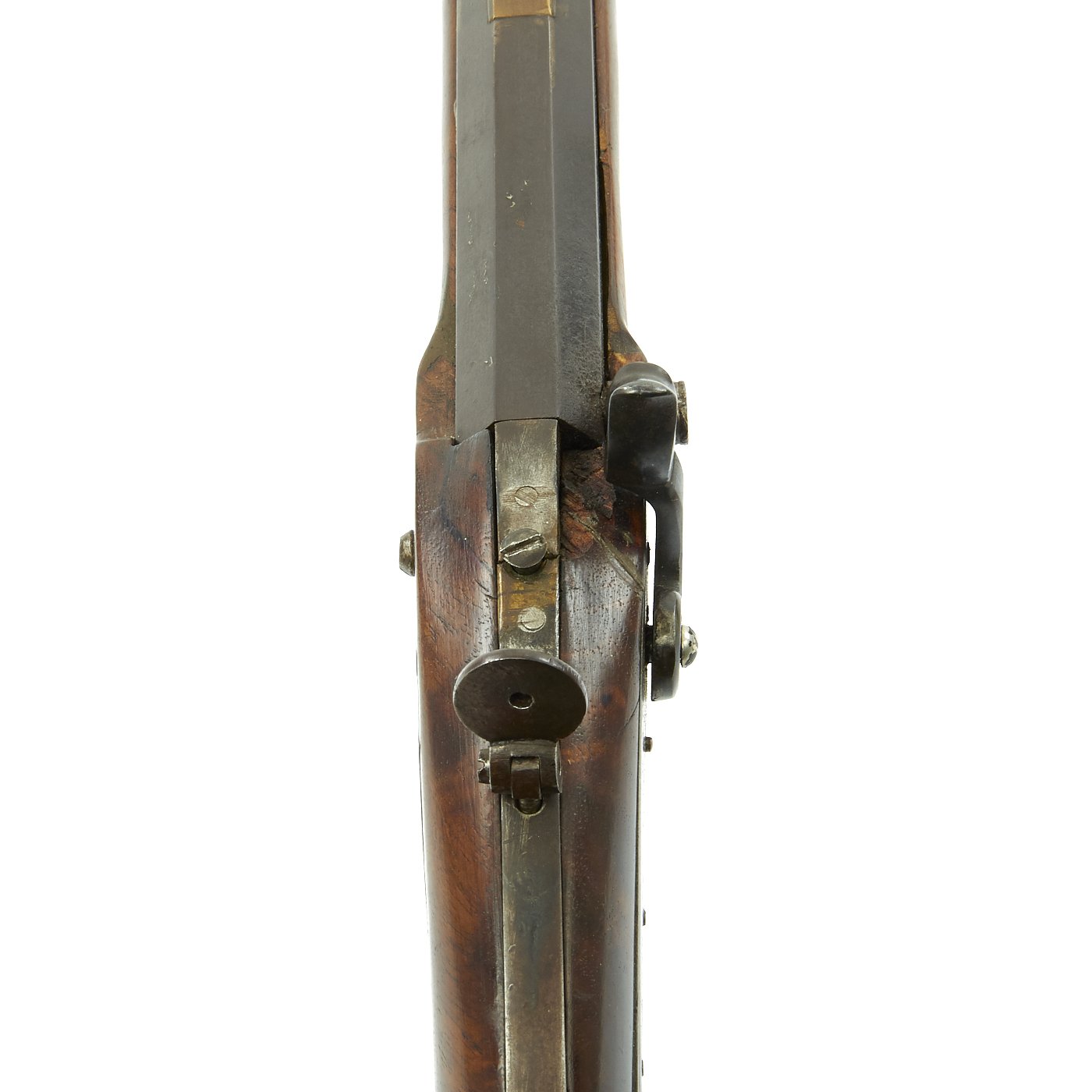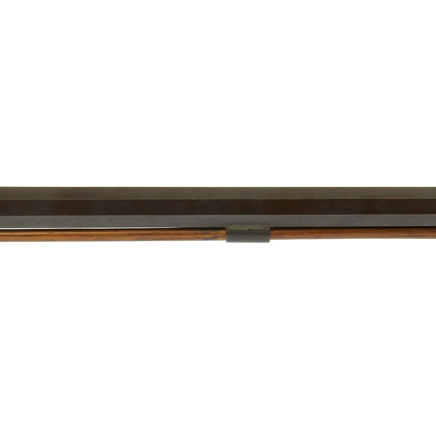 The rifle has a 33" octagonal Barrel in about .39 Caliber, the usual bore size that these are found in. It is 49" in overall length and has a brass patch box on the right hand side of the stock, the left hand side has a cheek piece. The hook butt plate, trigger guard and small side plate are also of brass.