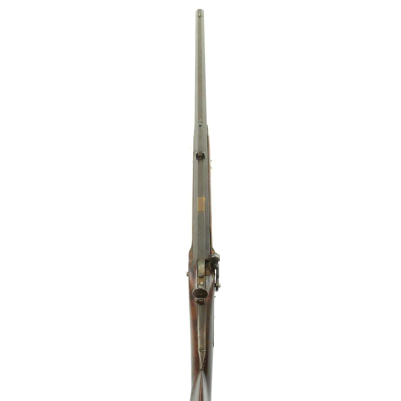 The Rifle is fitted with a "SET TRIGGER" and is in really fine condition. The barrel has a "buckhorn" type back sight and ALSO a circular type folding quarter coin sized "peep" sight mounted on the barrel tang. There is a repair to the fore end around the area if the barrel wedge which may need regluing.