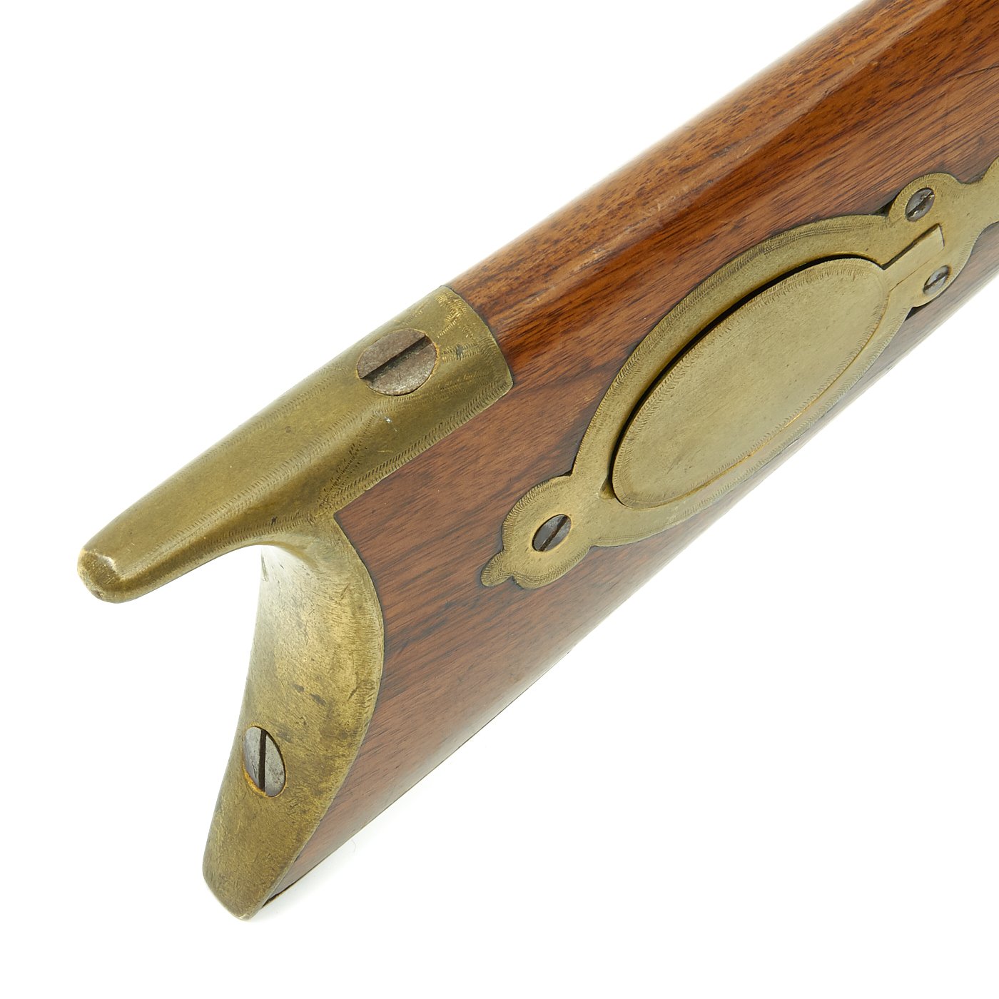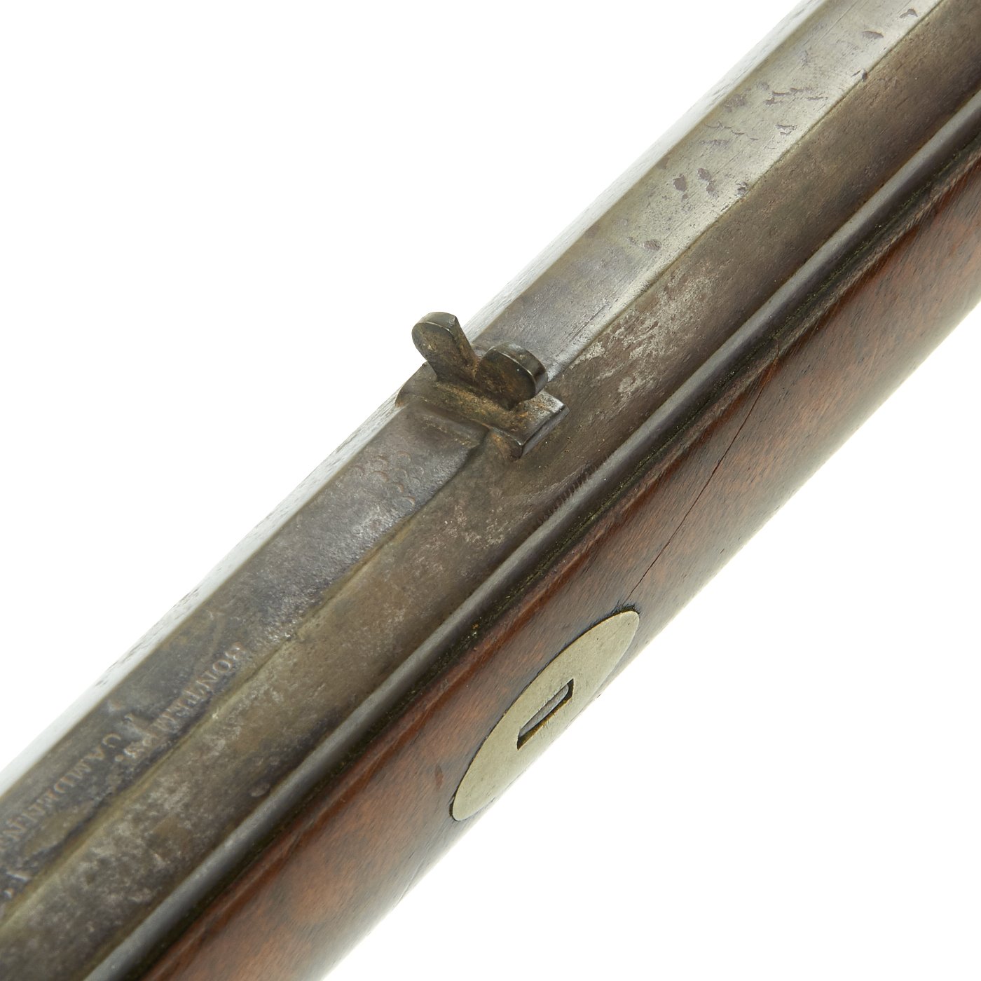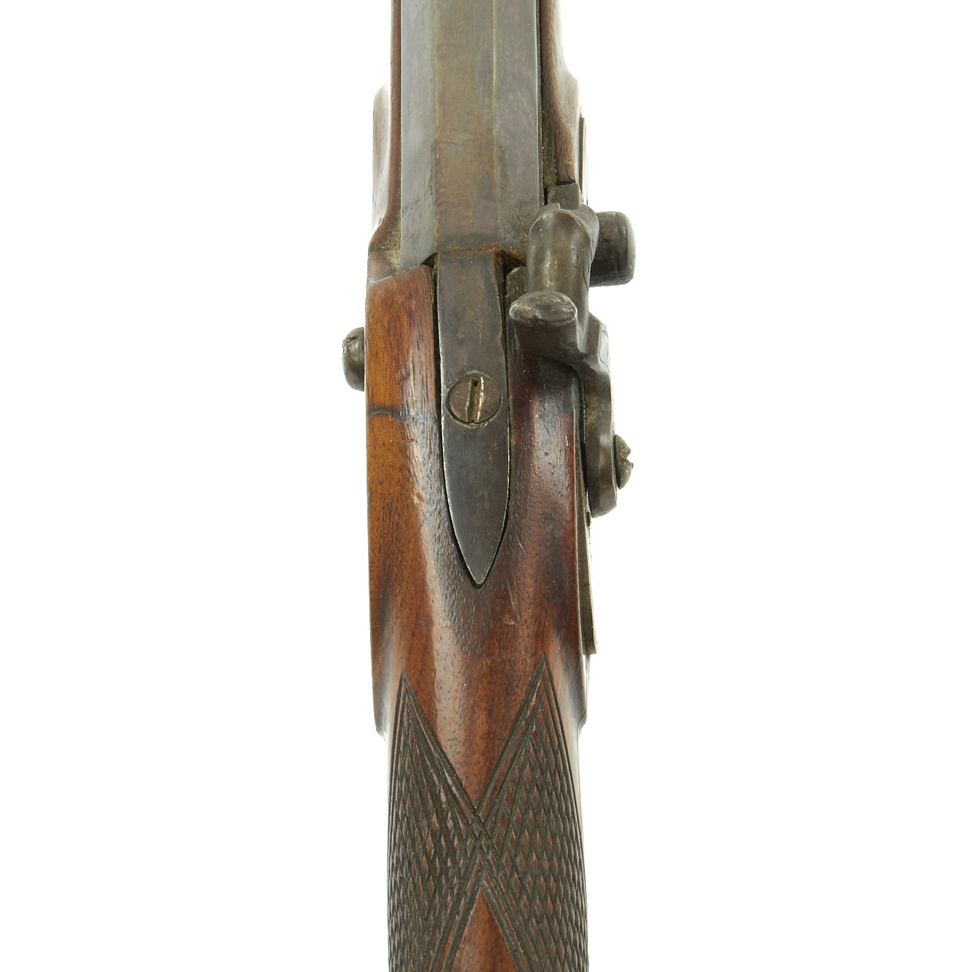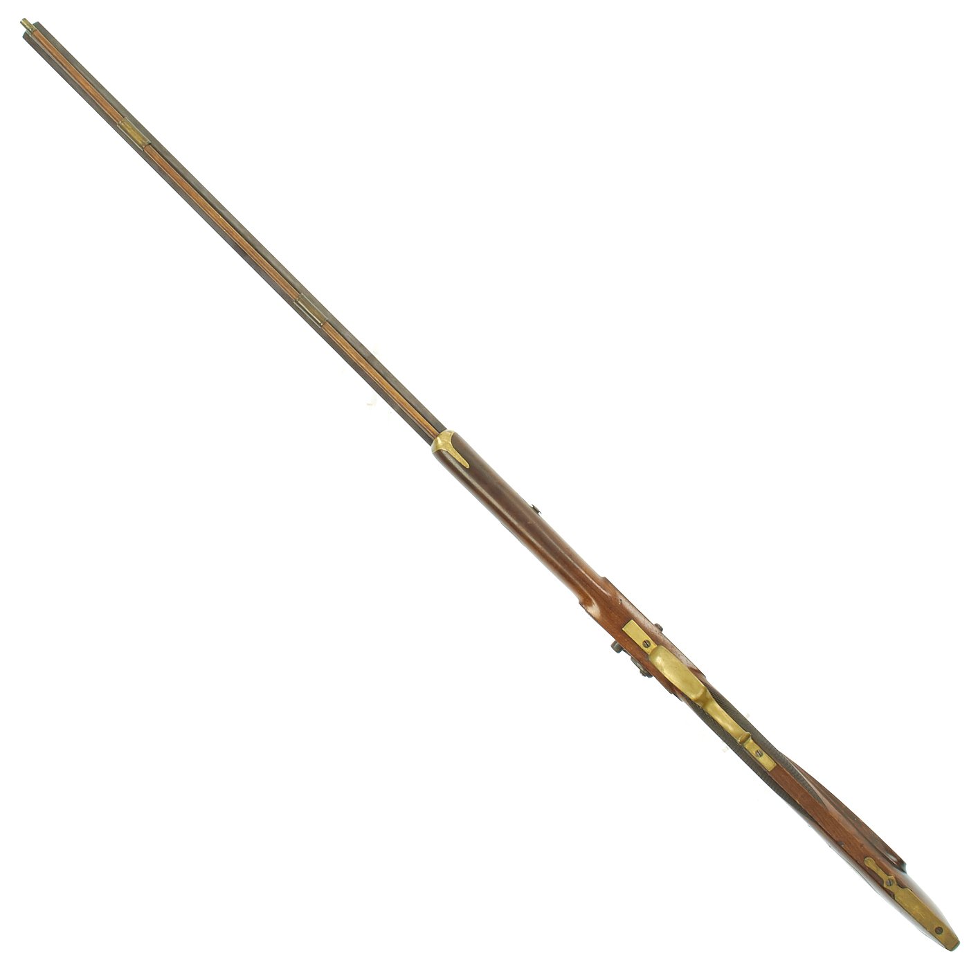 The barrel shows nice 8 groove rifling, though it is a bit worn, so this is a rifle that did not just stay inside all day. Complete with brass tipped wooden ramrod. The wrist of the stock very nicely checkered. There is a small crack on the left fore stock, which starts at the barrel wedge escutcheon, as well as a stress crack to the rear of the lock.