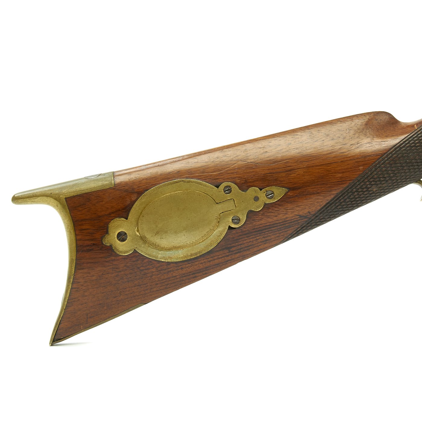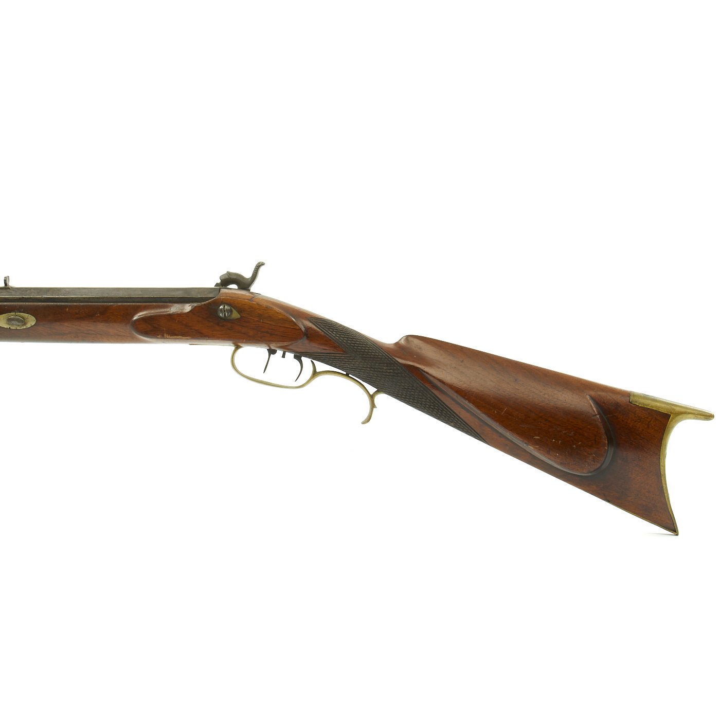 The rifle has a brass patch box on the right hand side of the stock, the left hand side has a cheek piece. The hook butt plate, trigger guard and small side plate are also of brass. The Rifle is fitted with a "SET TRIGGER" and is in really fine condition. The barrel has a small deer antler type back sight and a small blade fore sight.