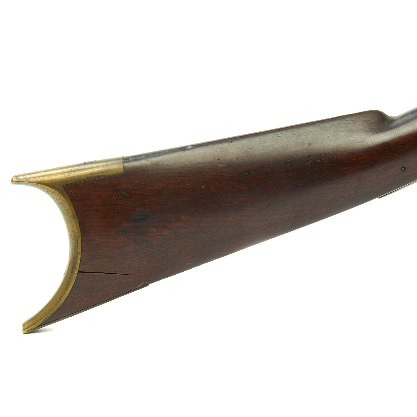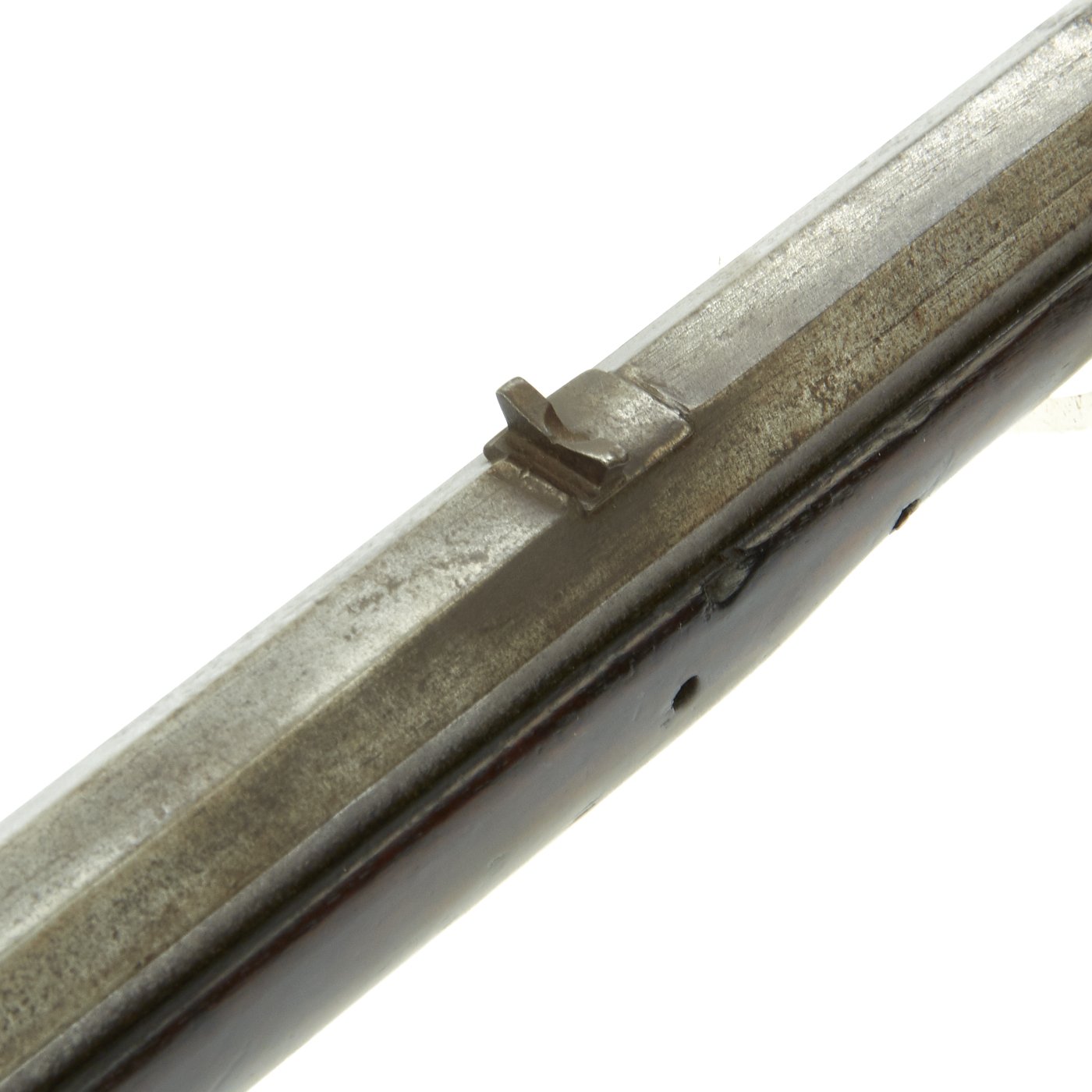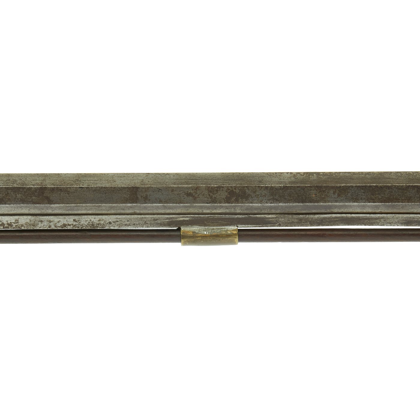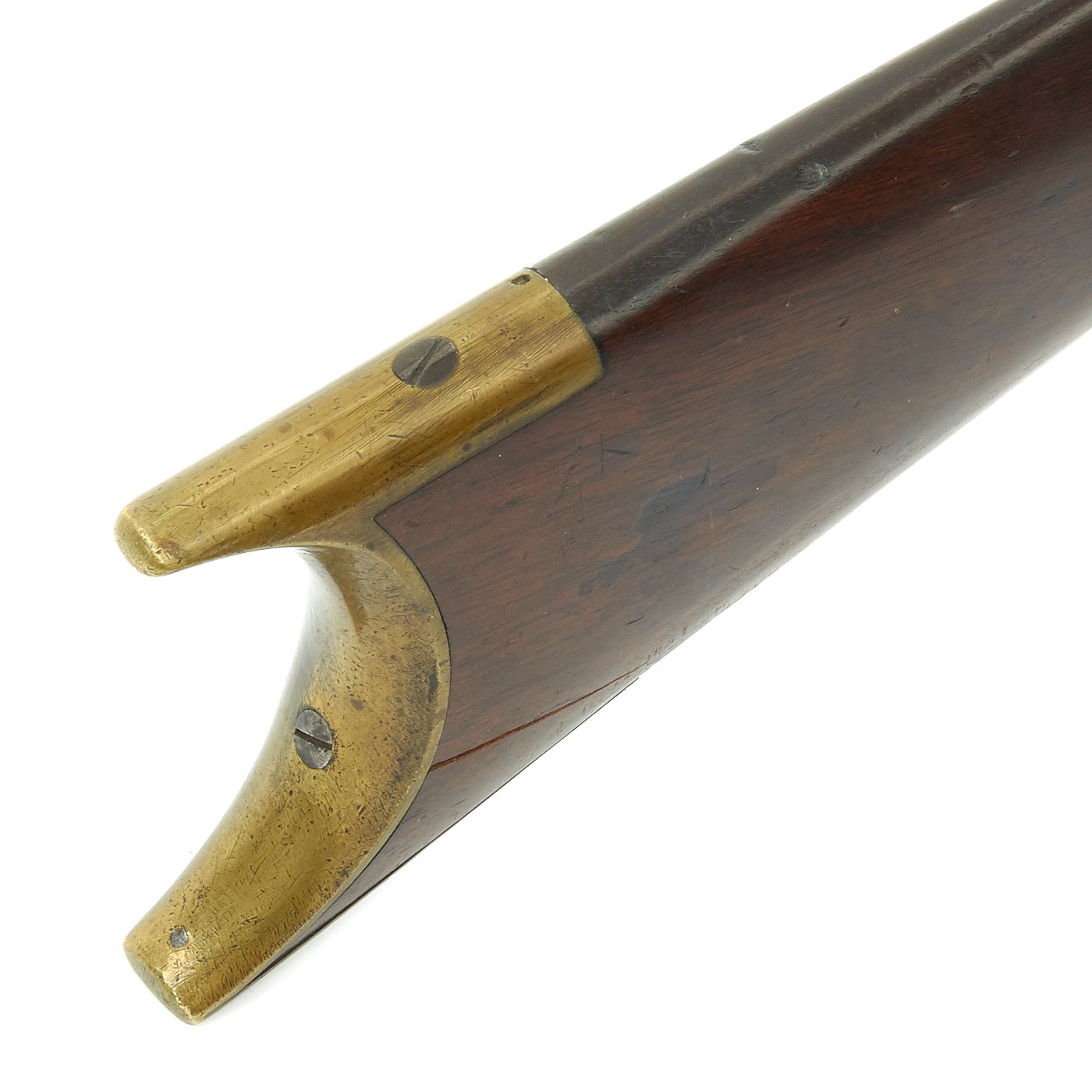 HENRY E LEMAN worked in Lancaster from 1812 until 1887, but we feel this rifle started life as a Percussion weapon, and not a conversion from Flintlock. Interestingly the rifle has been, since new, fitted with a "set trigger" depressing the rear trigger first until it clicks and just touching the front trigger discharges the weapon, hopefully with great accuracy. There is a minor split in the lower rear toe of the butt stock, easily repaired with a good glue and clamps. Also the fore stock retaining pin is missing, but could easily be replaced.