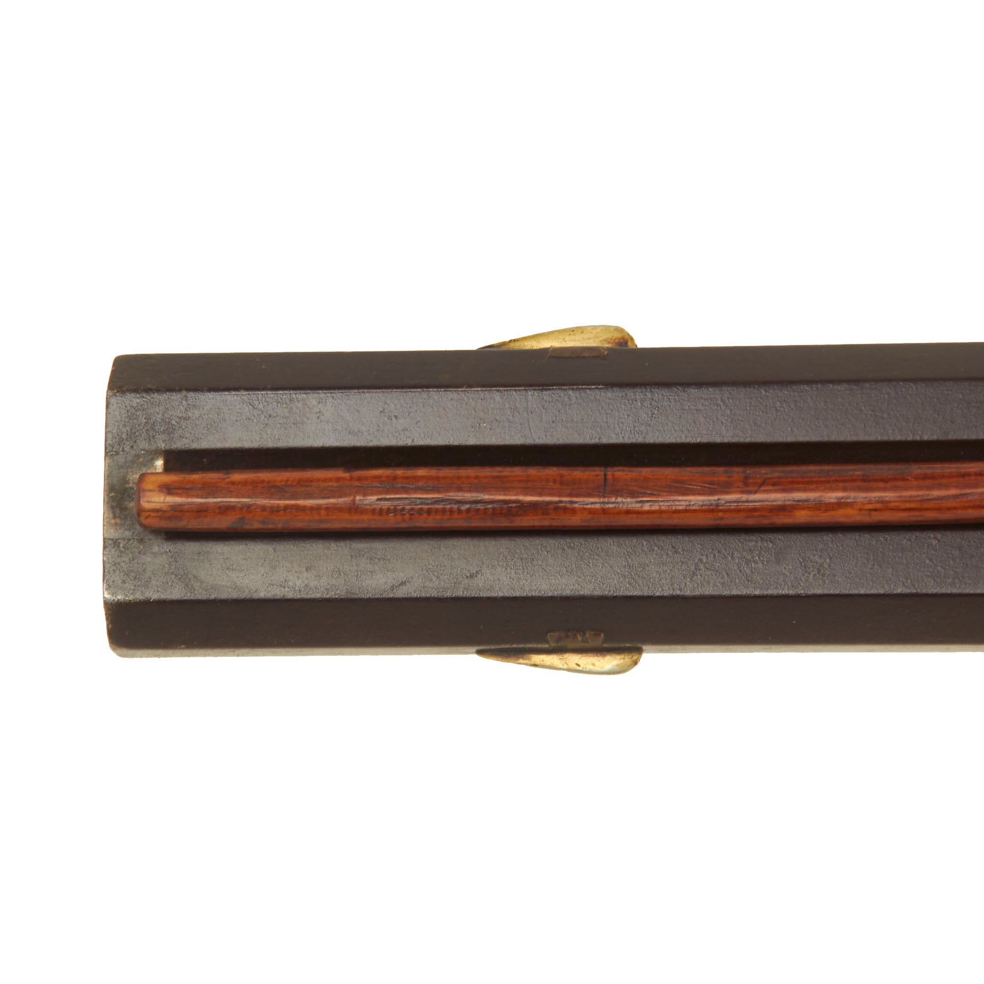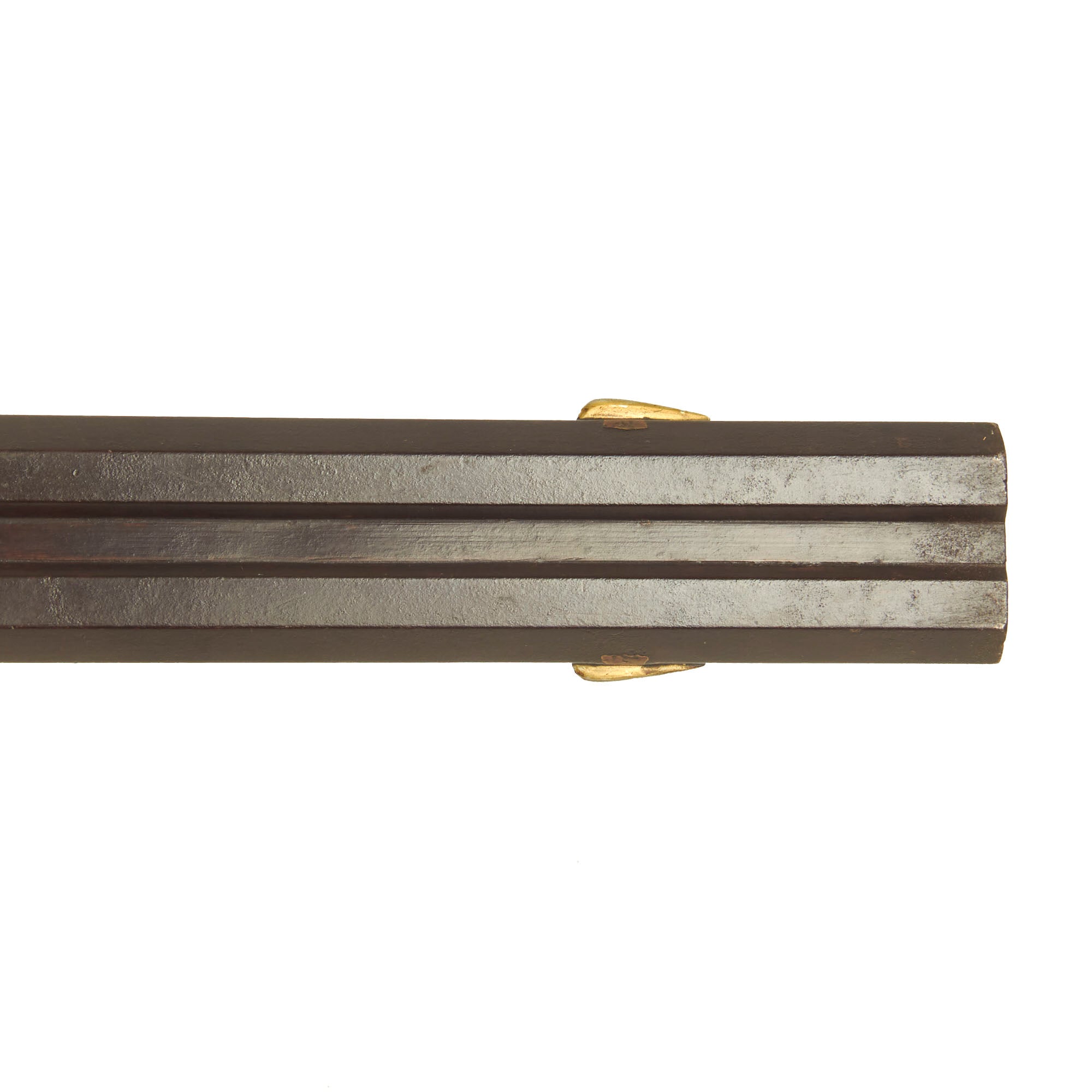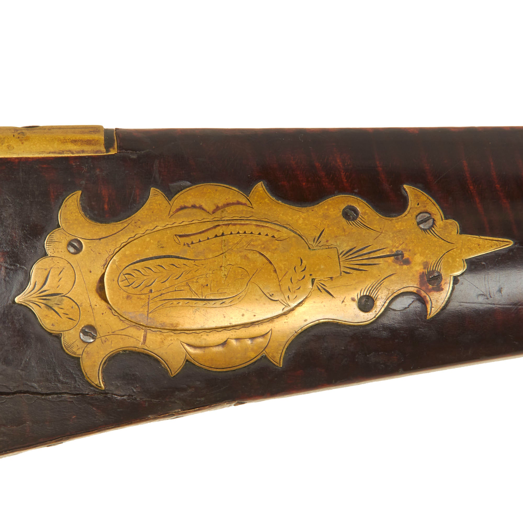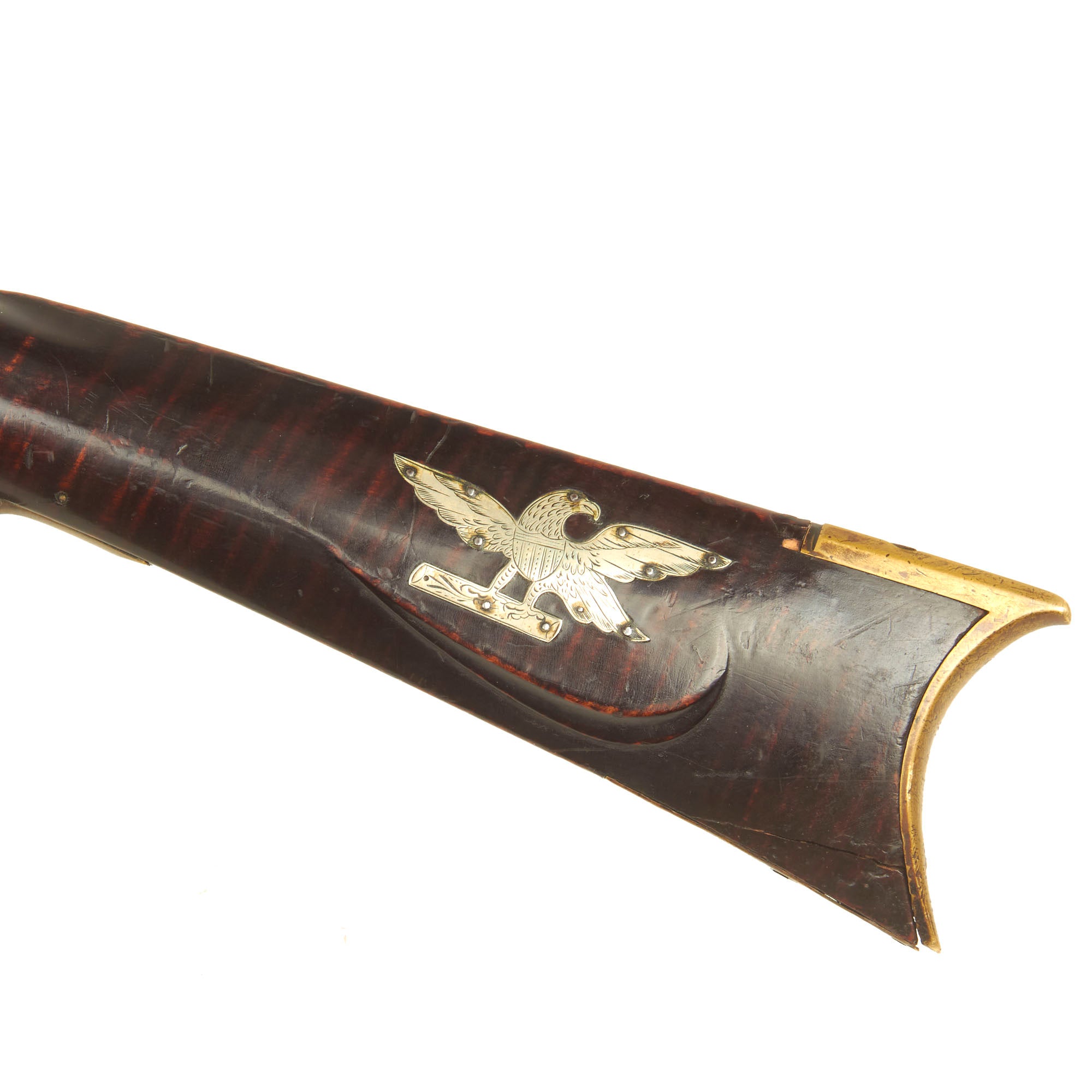 Original Item: Only One Available. Just purchased at a recent military auction! This is a lovely swivel breech double barreled "Pennsylvania" percussion hunting rifle, often referred to as a "Kentucky" rifle. The design developed in Pennsylvania, and then spread down the Ohio River Valley to Kentucky, where it was very popular. This is very good and interesting example example, with a lovely figured "Tiger Flame" maple rear stock and all brass mountings except for the beautiful engraved "Federal Eagle" on the right side of of the butt stock. This is made from "German Silver", very popular with these rifles.