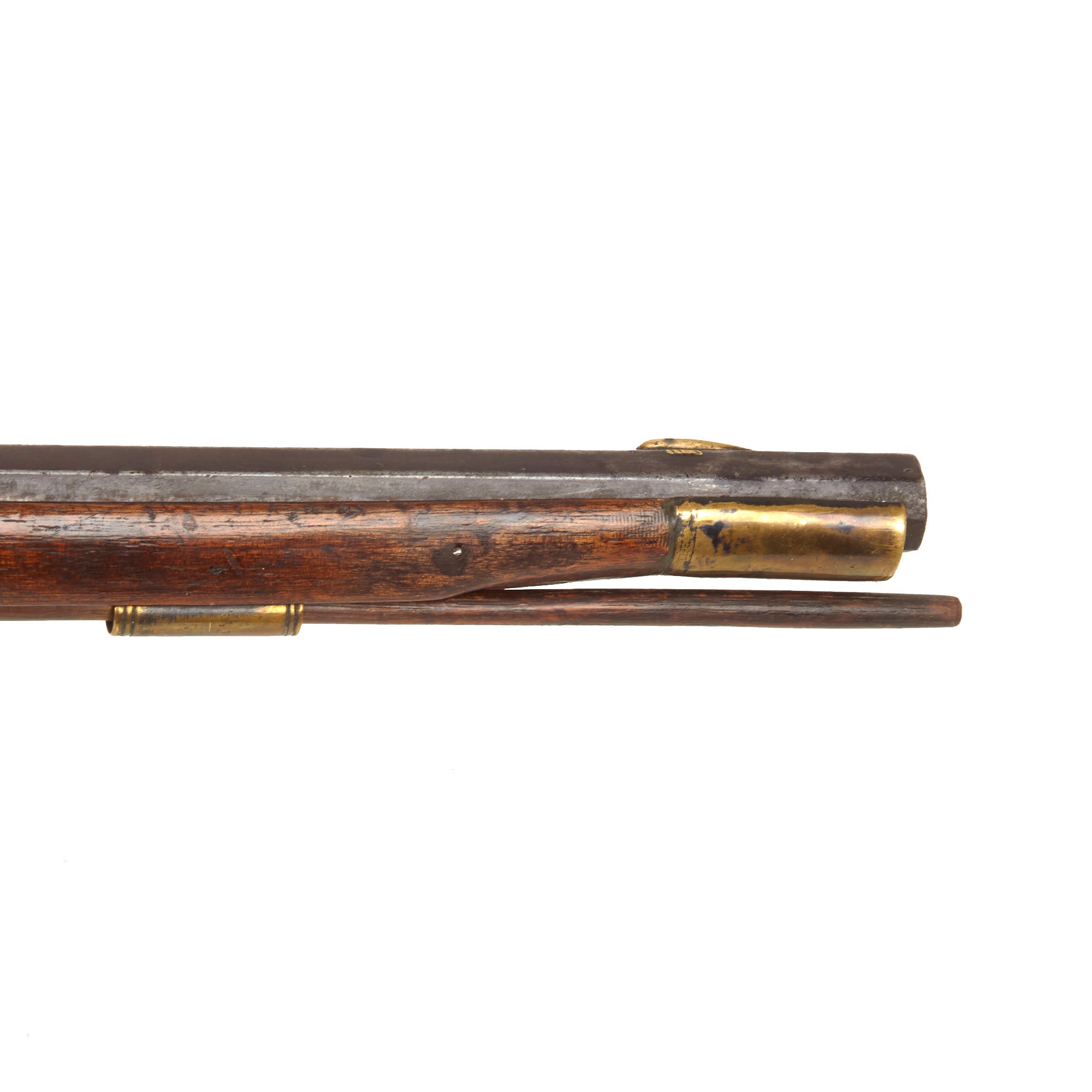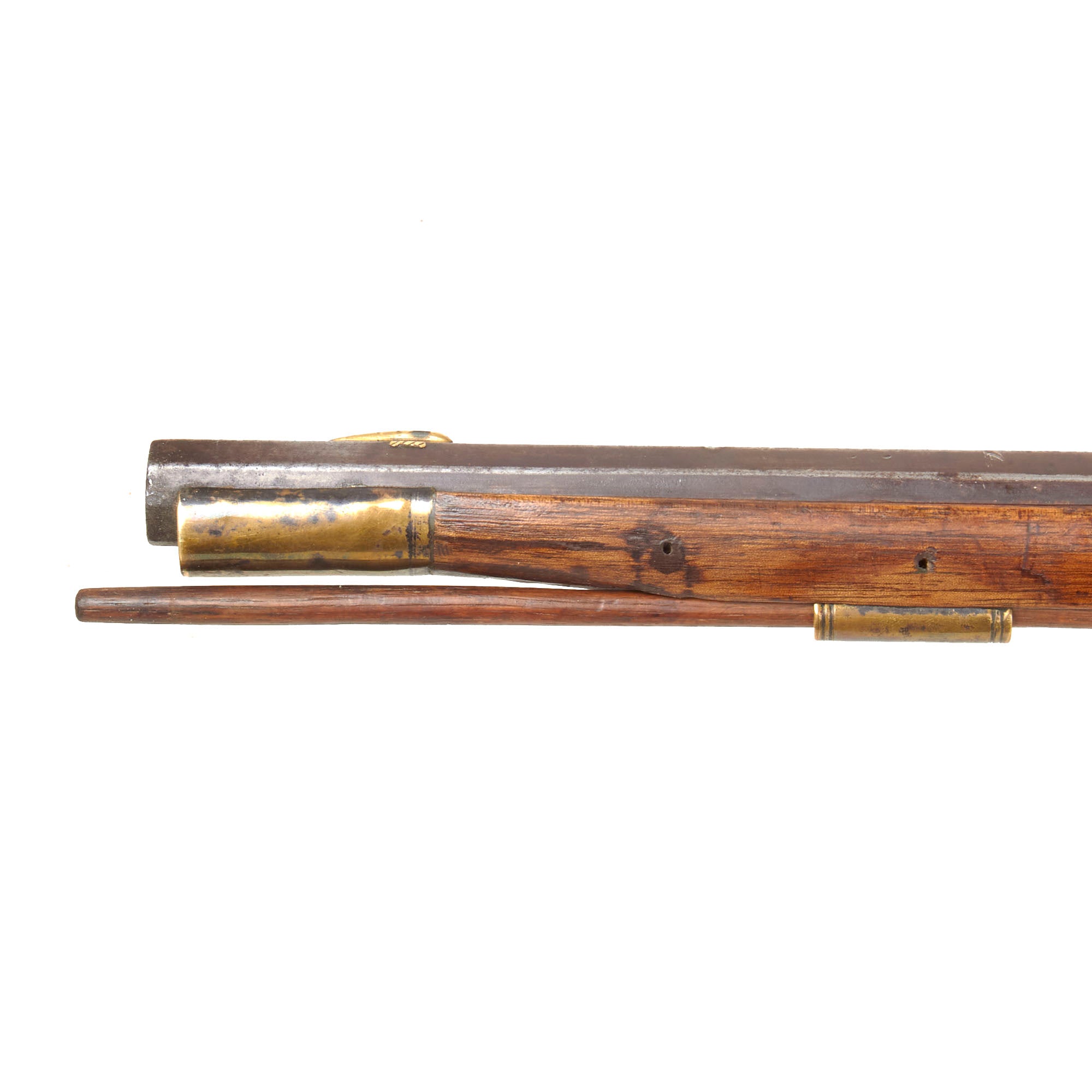 We estimate that this octagonal barrel rifle was made about 1850, and features all brass mounts with some minimal ornamentation. The full length stock is lovely, and looks to be made from American black walnut, a very popular and strong wood to use for stocks. The butt stock has a nice cheek piece on the left hand side. The stock does not show any major damage, just the usual wear from use. The breech area of the barrel shows extensive powder burn erosion, so it looks to have seen long use. We checked the lock, and it is functional, though it does not have any half cock position. The bore is in very good condition, with with clear rifling and a partly bright finish, though there is wear at the muzzle. There is a simple wooden cleaning rod installed, which is just for display.