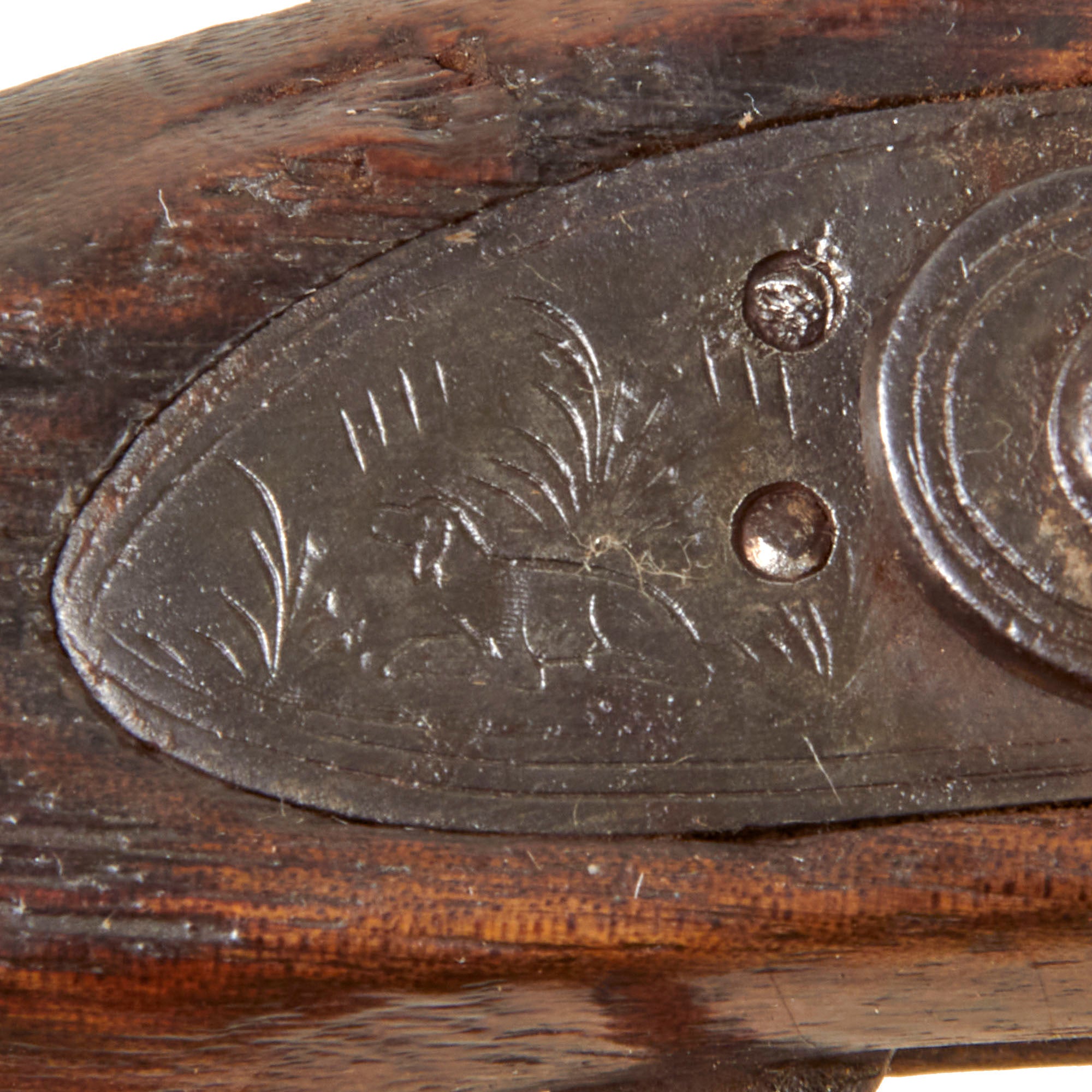 In this case however, it was made somewhat to the east in Maryland, and is marked on the top of the barrel by the maker J•MARKER. This is the marking of known maker James Marker (1808-1883), the third child of Golden Age master gunmaker Daniel Marker Sr. (1778-1854), who had learned the trade from his father George Marker Sr. (1753-1827). In 1833, James purchased lot number 160 in Sharpsburg, Maryland, from his uncle and took over his gunsmith business. His eldest son, Jacob, took over the shop from him in 1855, and many other members of their extended family were known makers.