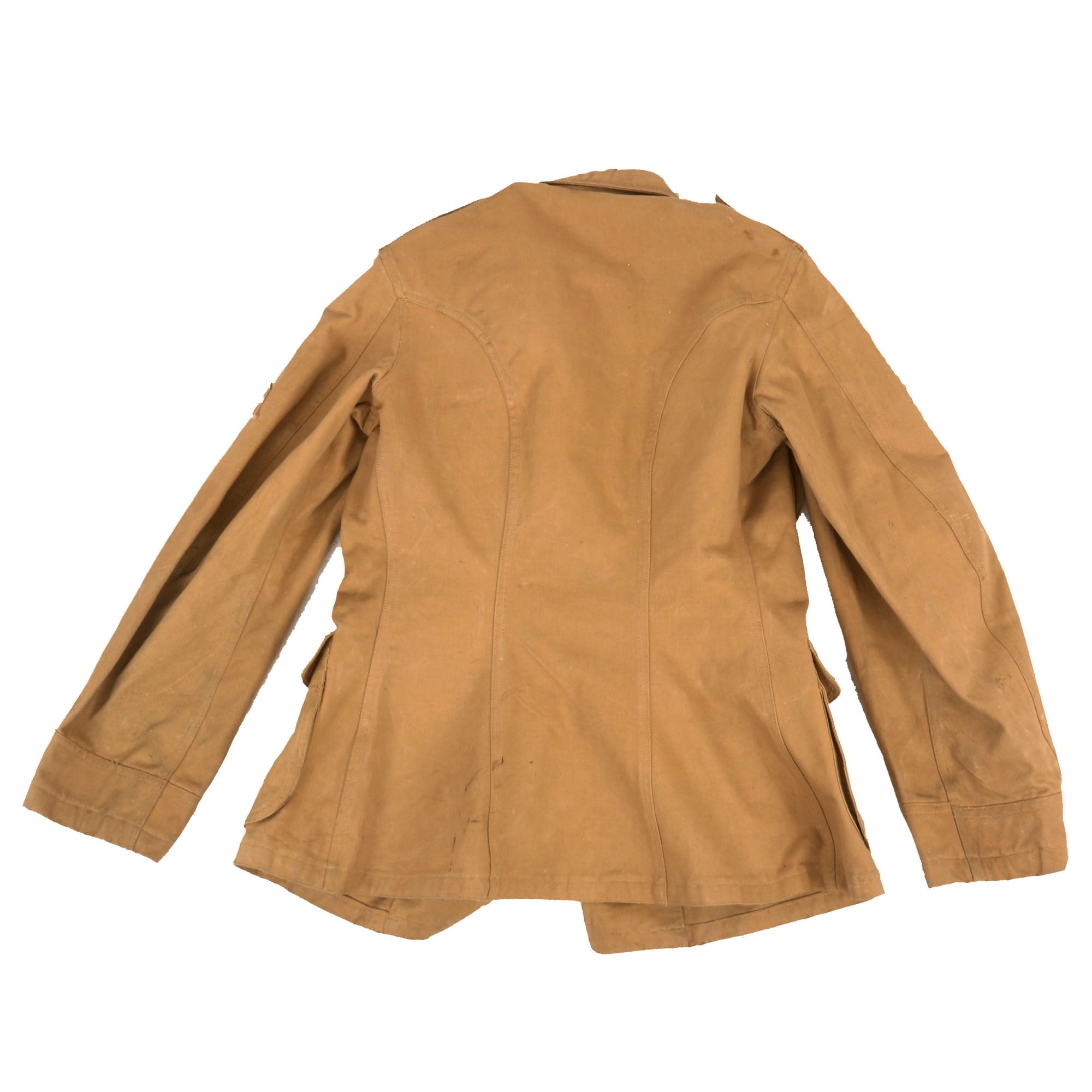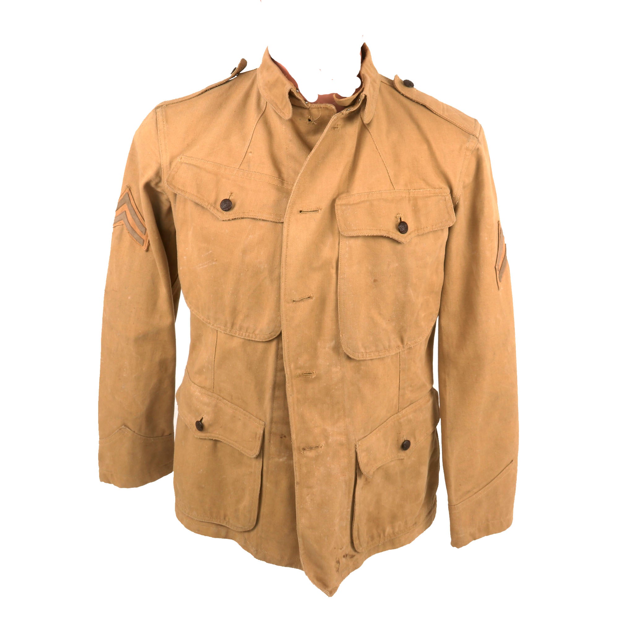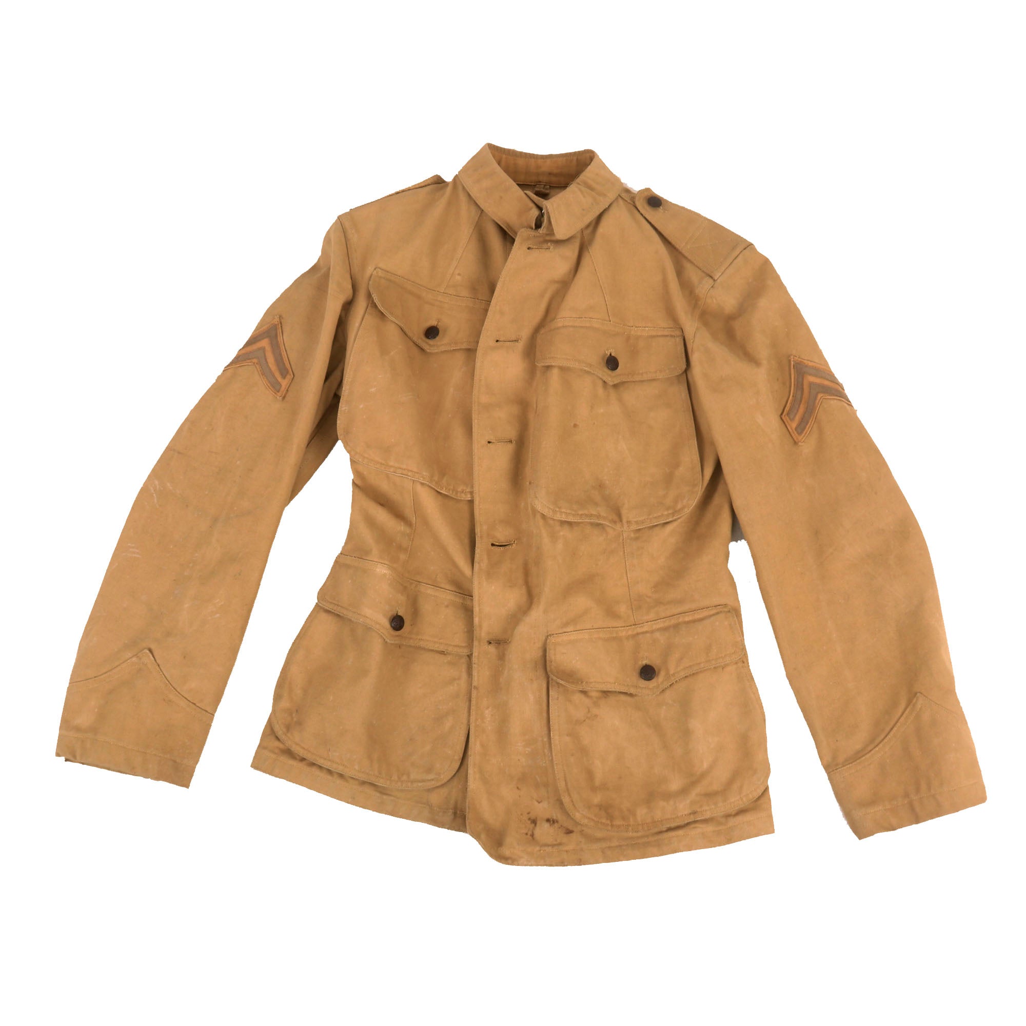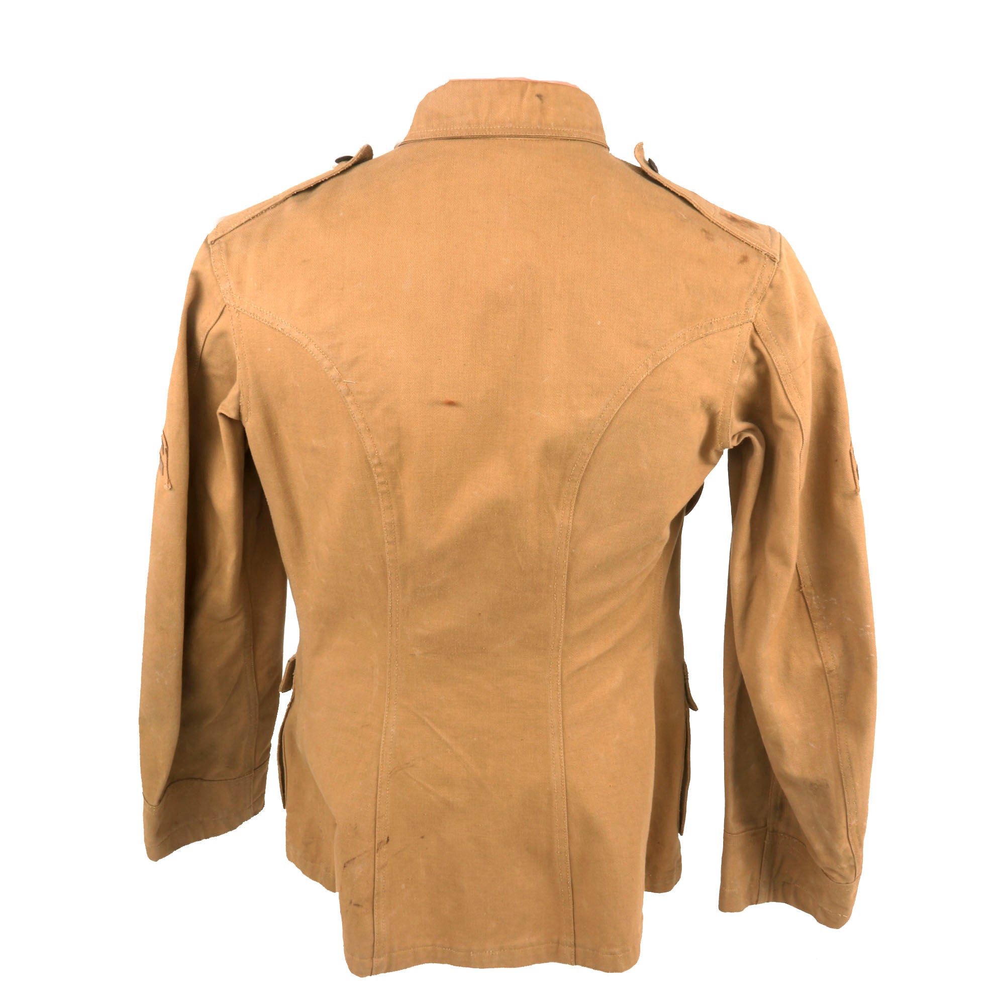 Original Items: Only One Set Available. Now this is a lovely early khaki uniform top! The brown cotton canvas fatigue uniform was similar to what was previously worn, but it now sported two lower patch pockets and a single breast pocket on the left side. In 1908 the brown canvas fatigue uniform began to be replaced with blue denim fatigue uniforms. However it would not be until 1919 that the changeover would be completed. This example is missing the 5 front buttons, but these are easily sourced, and due to the design of the uniform, the buttons were not stitched, but retained by a small metal ring.