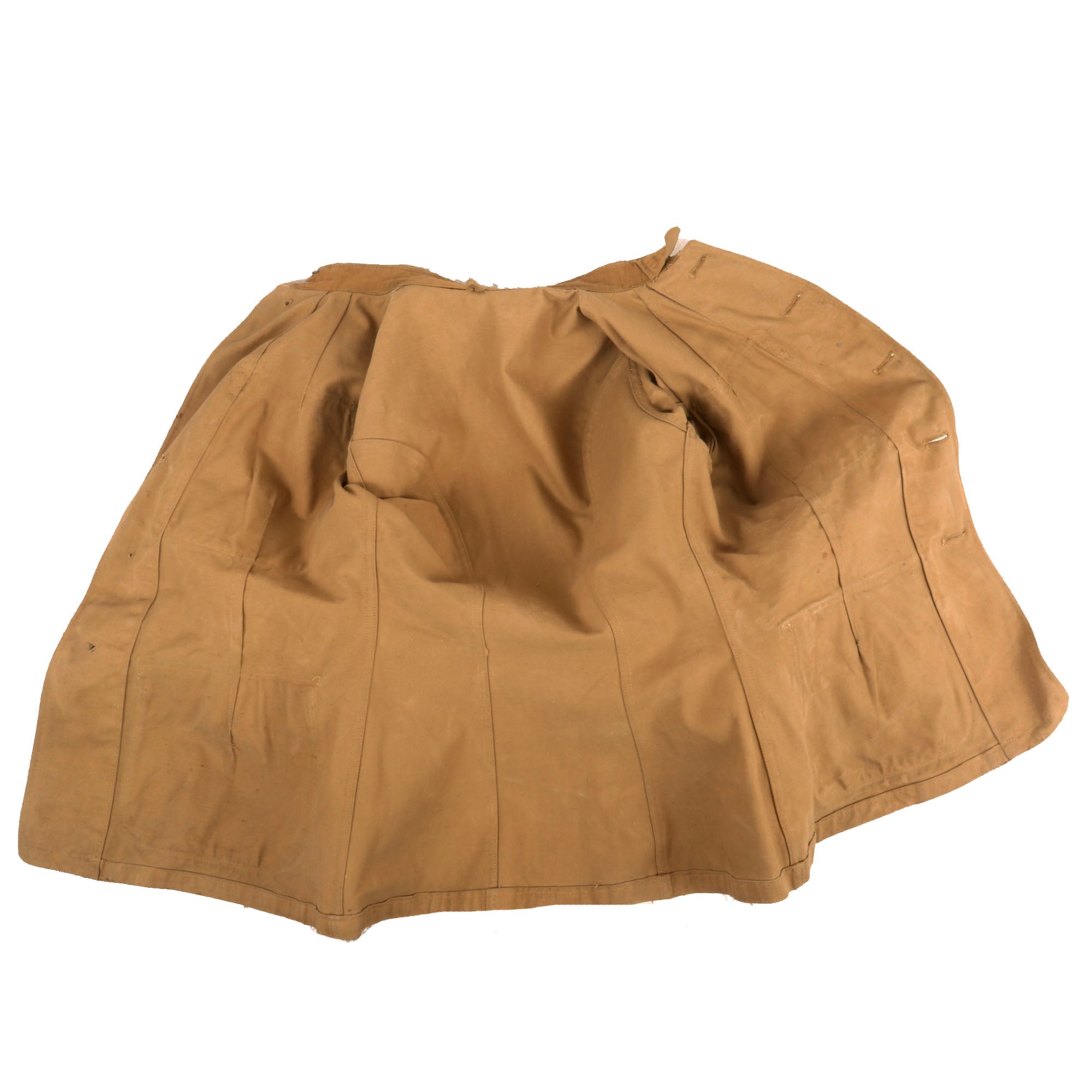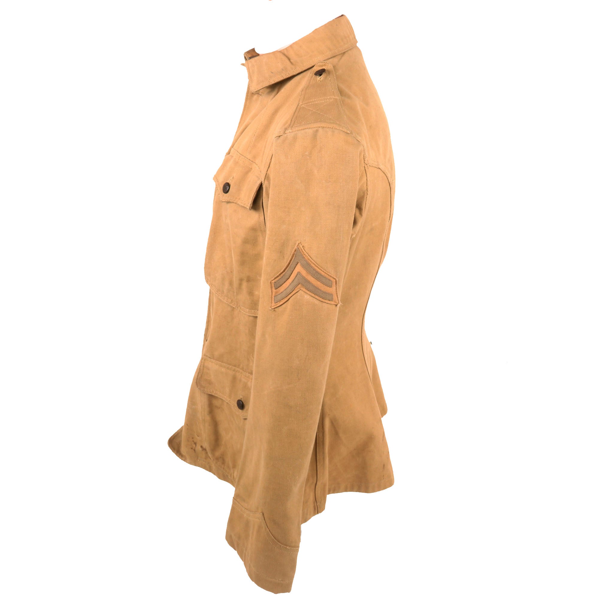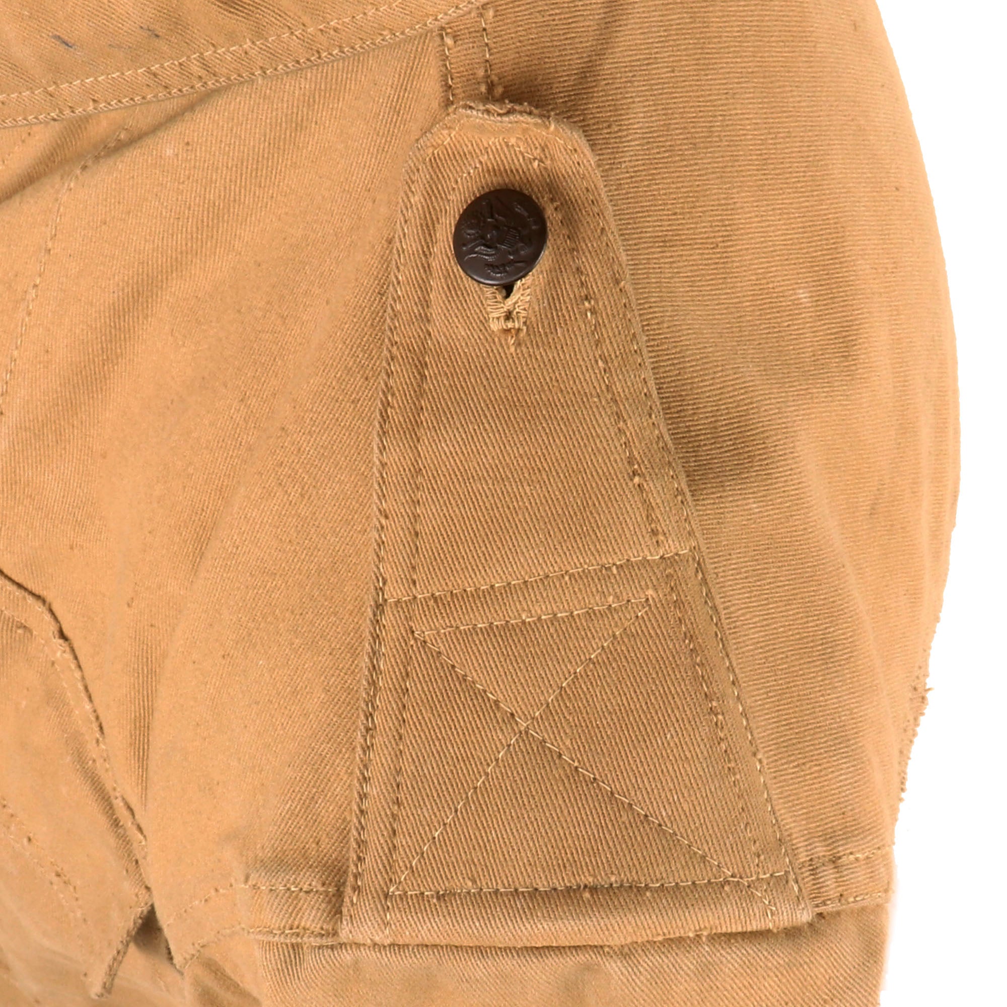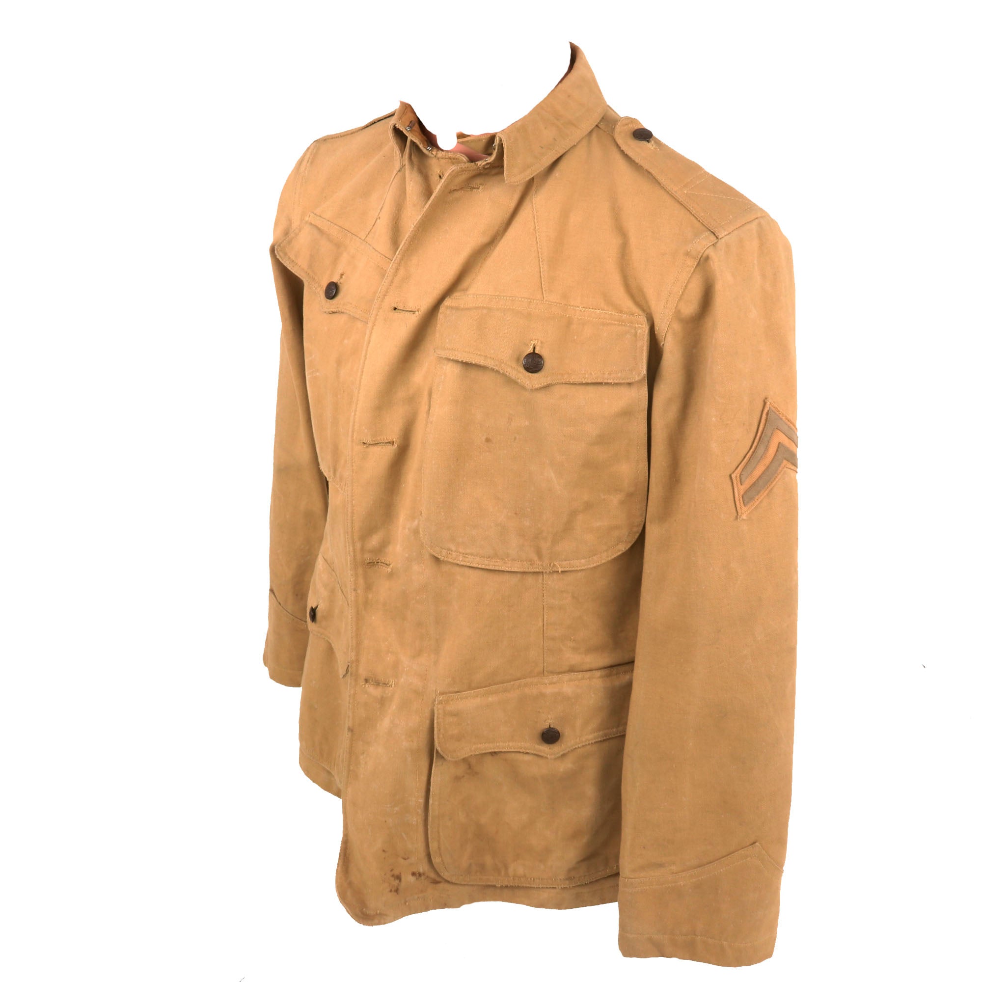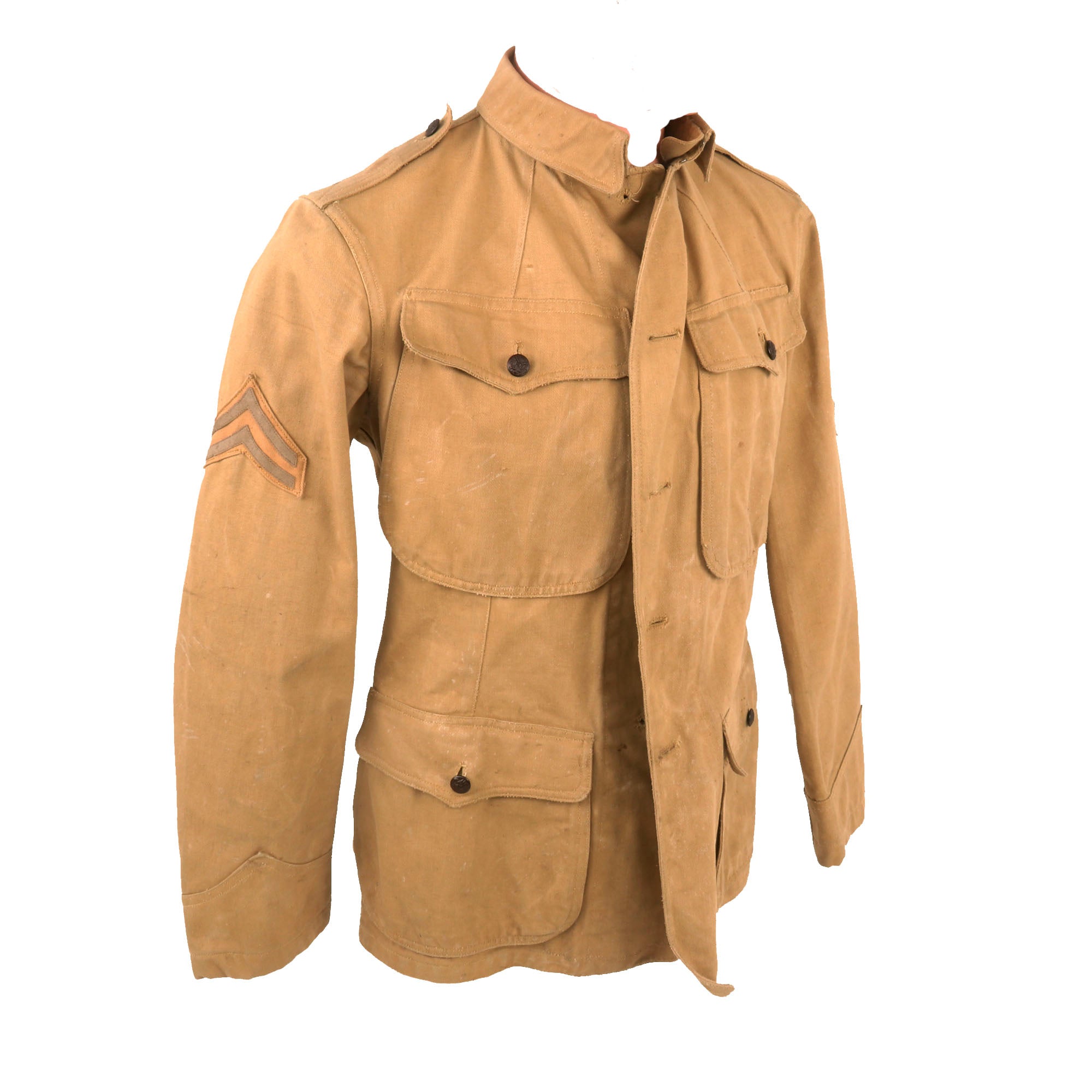 Original Items: Only One Set Available. Now this is a lovely early khaki uniform top! The brown cotton canvas fatigue uniform was similar to what was previously worn, but it now sported two lower patch pockets and a single breast pocket on the left side. In 1908 the brown canvas fatigue uniform began to be replaced with blue denim fatigue uniforms. However it would not be until 1919 that the changeover would be completed. This example is missing the 5 front buttons, but these are easily sourced, and due to the design of the uniform, the buttons were not stitched, but retained by a small metal ring.
