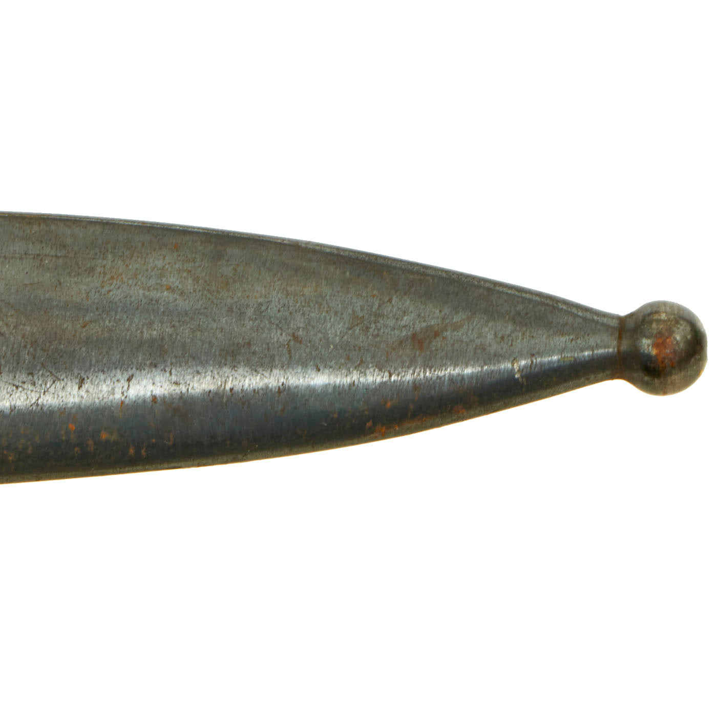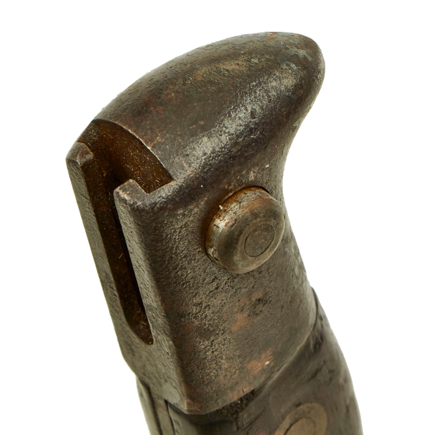 This example is in good condition, with the original bright finish oxidized to a gray coloration. Blade shows signs of sharpening, and of honest use, most likely in a tropical environment. The 1892 pattern "smooth" grips are in good condition with just a few dents and chips, and are held in place by ground flat domed rivets. The wood does show some wear and open grain.