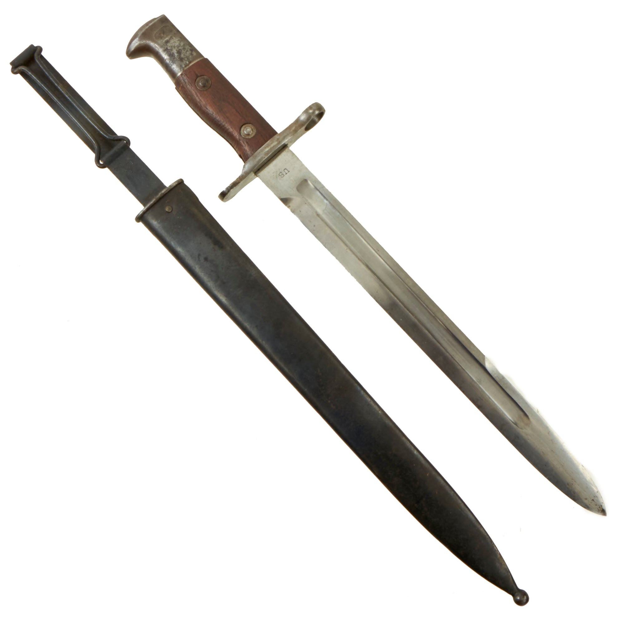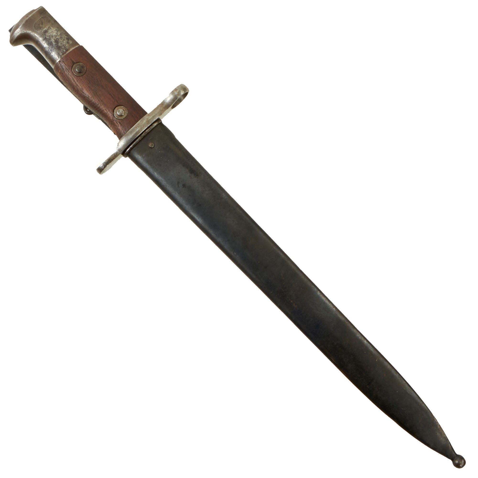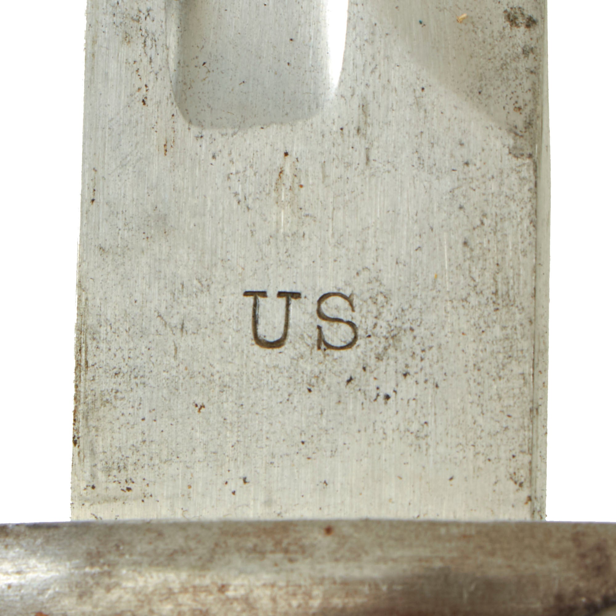 Original Item: Only One Available. These are something that we have only ever had very few of. It is a Pre WWI, Philippine-American War (1899-1902) dated U.S. M1892 bayonet, made for the Springfield Model 1892–99 Krag-Jørgensen rifles, some of which were still in use during WWI. It is fitted with its original all steel scabbard with a swivel belt loop on the back. These are very rarely seen on today's market, especially with the scabbard included and fully intact.