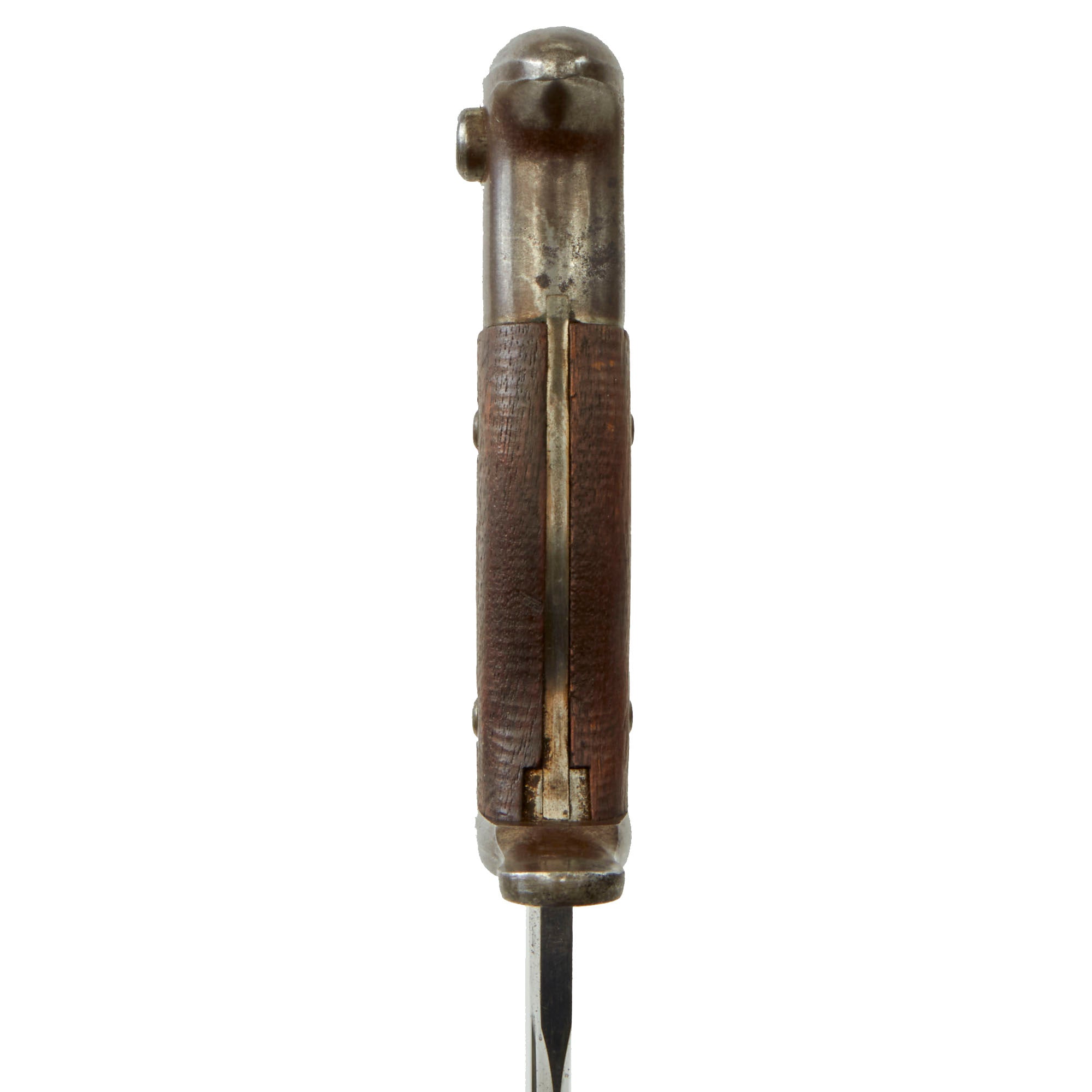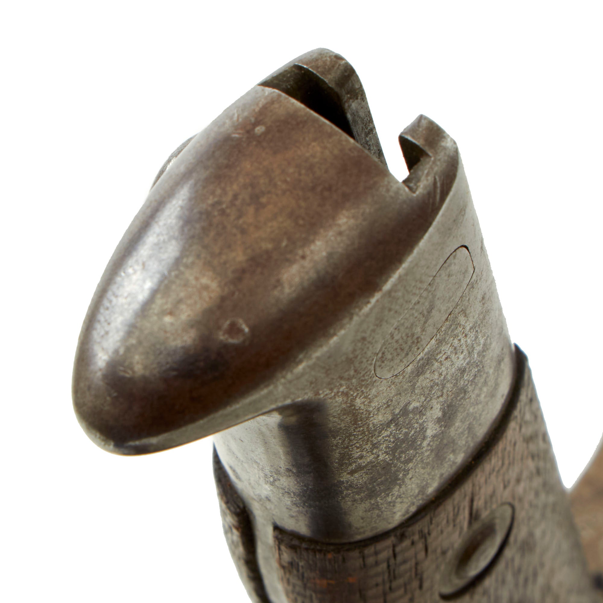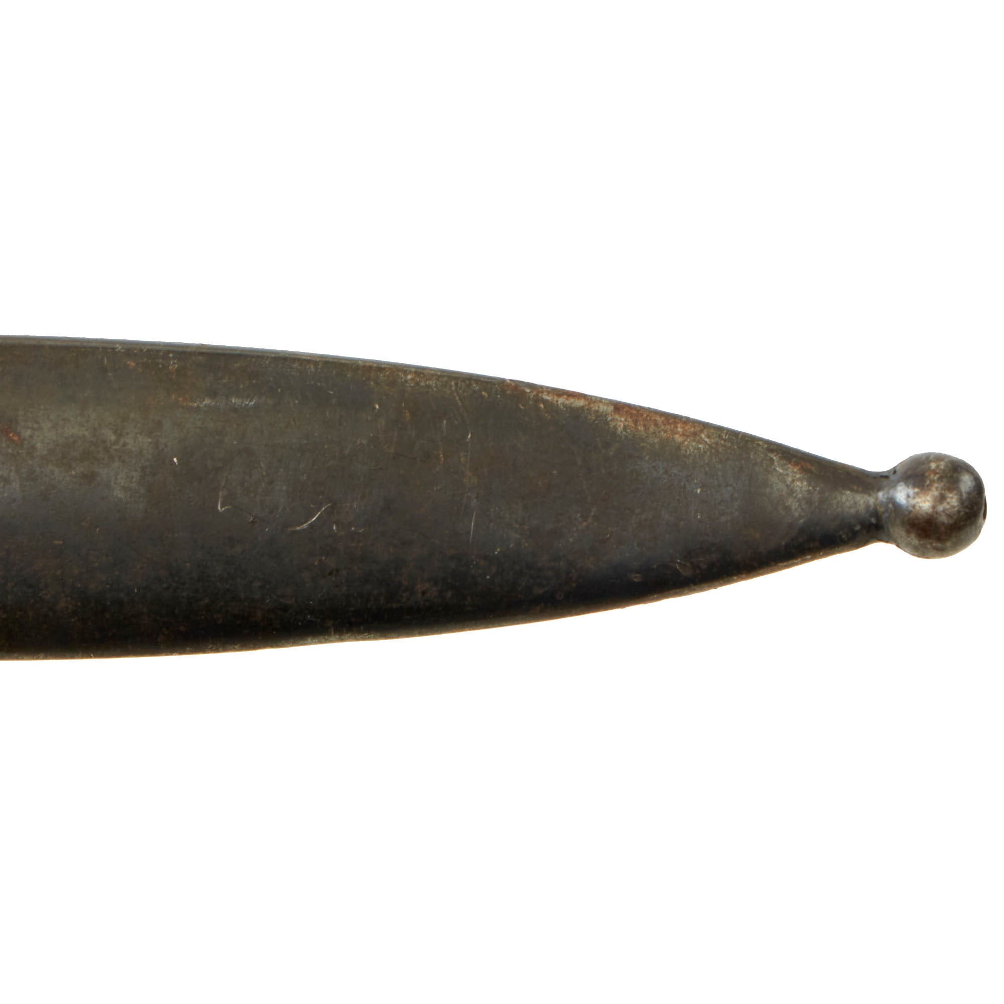 This example is in good condition, with the original bright finish oxidized to a gray/brown coloration in areas. Blade shows signs of sharpening, and of honest use, most likely in a tropical environment. The edge does show wear with a few nicks present. The 1892 pattern grips are in good condition with just a few dents and chips, and are held in place by domed rivets. The wood does show some wear and open grain.