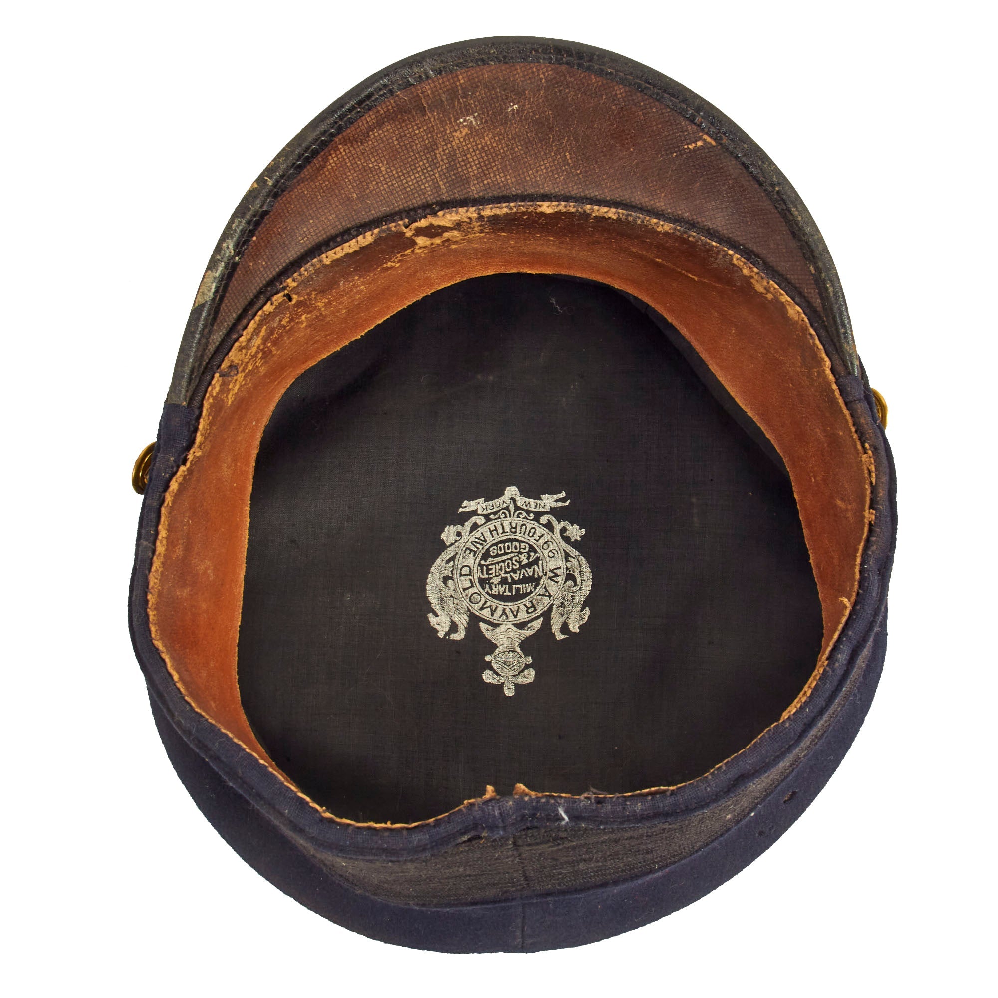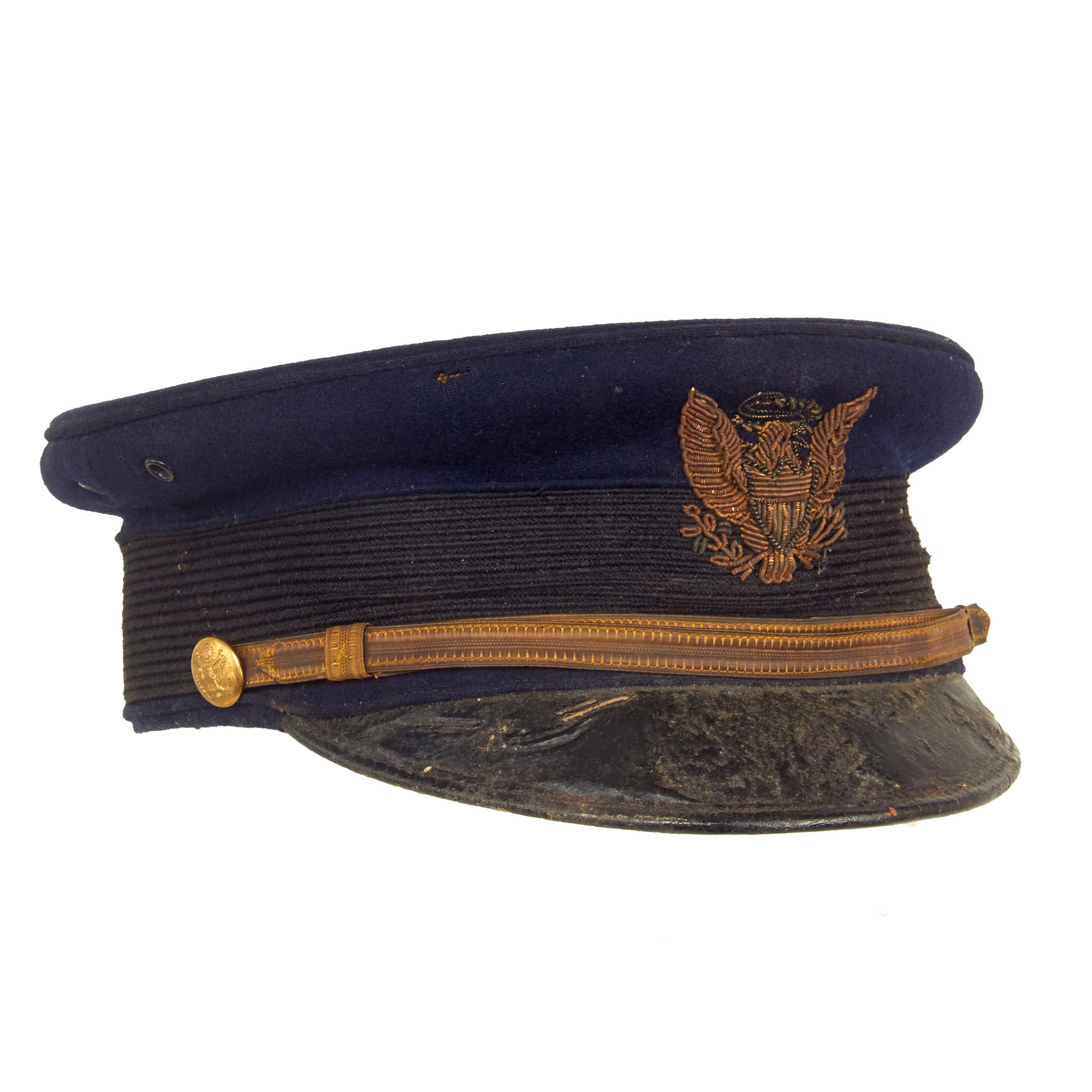 Original Item: Only One Available. This is a very nice Philippine-American / Moro Rebellion era Model 1902 peaked visor in Navy blue. The visor was worn by an Officer in the US Army. The M1902 replaced the earlier M1895 pattern. This was the U.S. Army's second example of a visor cap after leaving the traditional kepi design. Like the M1895, it is made of wool, and has a leather visor bound with patent leather, lined on the underside with lacquered paper. It retains an officers chin strap retained by gilded brass federal regulation general service buttons. The front of the visor has a beautifully embroidered Federal Eagle which was directly embroidered to the visor and was not on a separate piece of fabric.