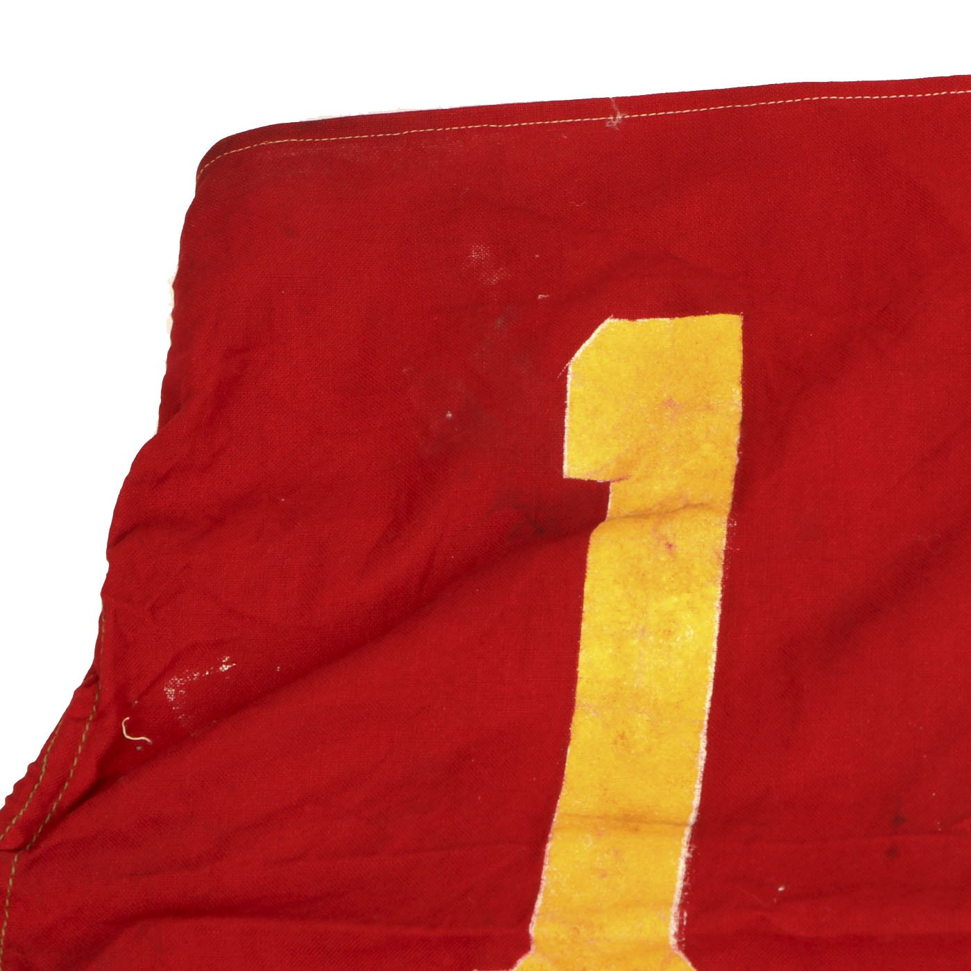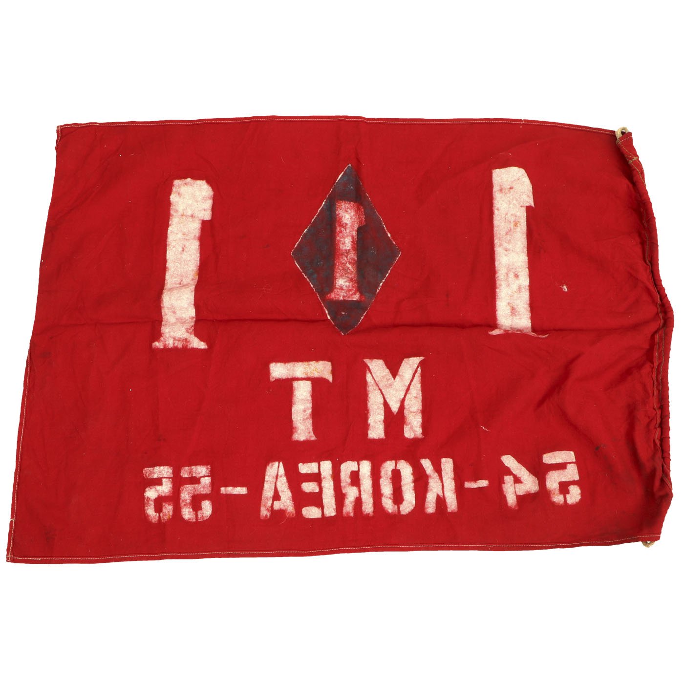 Original Item: Only One Available. Very nice wool flag with rope stitched into the header for use as a hoist. The flag measures approximately 21" x 30" it is constructed of red wool and is hand painted. It reads MT 54 - KOREA - 55 with 1st Marine division insignia to the center.