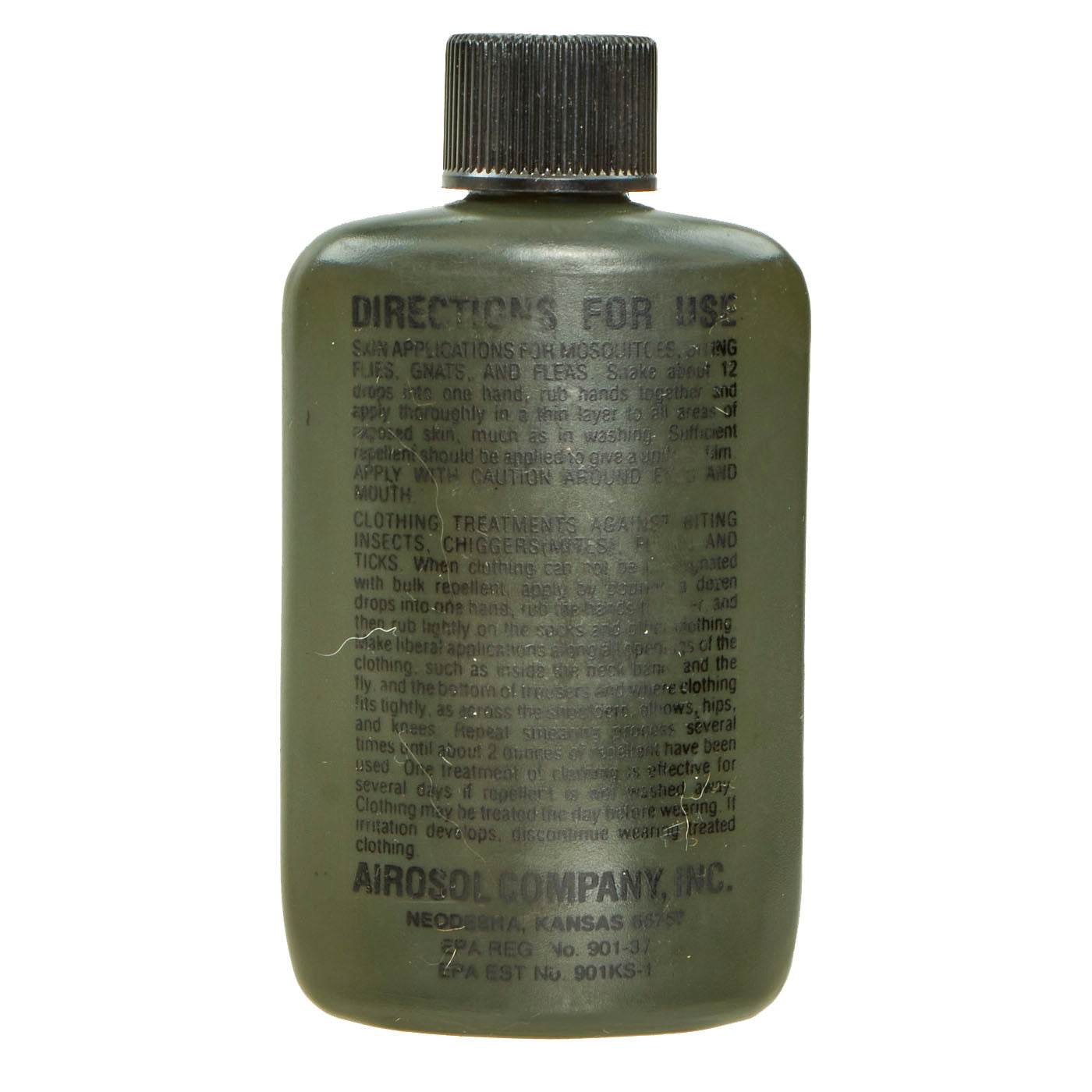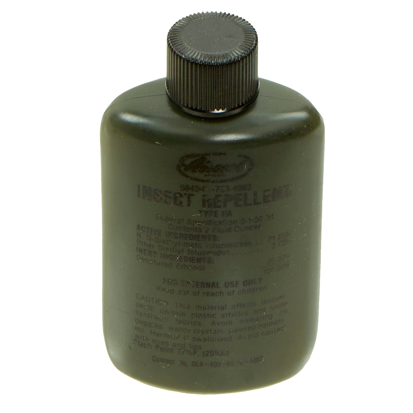 Original Items: Limited Quantity Available. These are wonderful “Vietnam Type” 2 fluid ounce containers of “bug juice” insect repellent. In the jungles of Vietnam, Panama and even the various deserts around the globe, these were often seen stuck inside of the helmet bands of servicemen. Each container varies in condition as well as content amount. Not all of these will contain all 2fl.oz of repellent. These are over 40 years old and are being sold as a novelty item for displays and reenactment purposes.