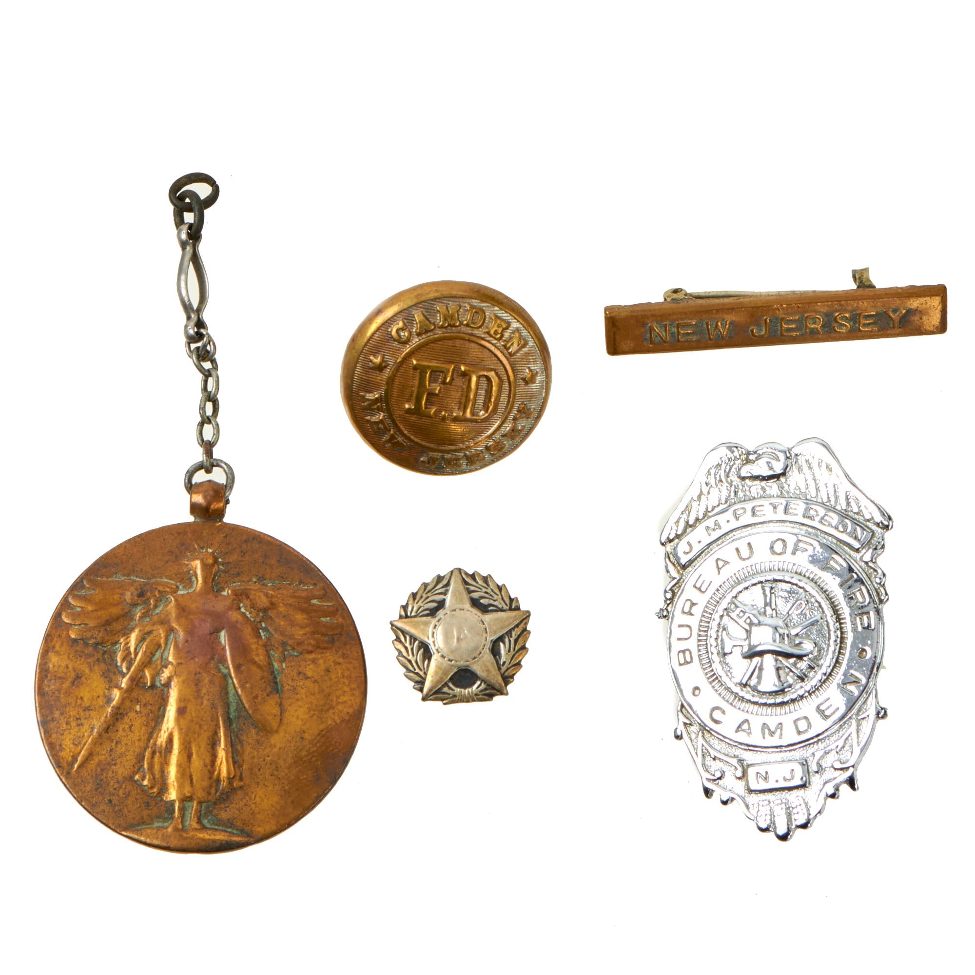 Original Items: Only One Lot Available. This is a fantastic early firefighter’s protective helmet for Hoseman John Peterson of Engine COmpany 11 with the Camden Fire Department in Camden, New Jersey. The lot also includes various items that would have been proper for Peterson to own/wear and also has a pair of lovely photos (copies) and a newspaper article (copy). This is a fantastic grouping perfect for the veteran firefighter!