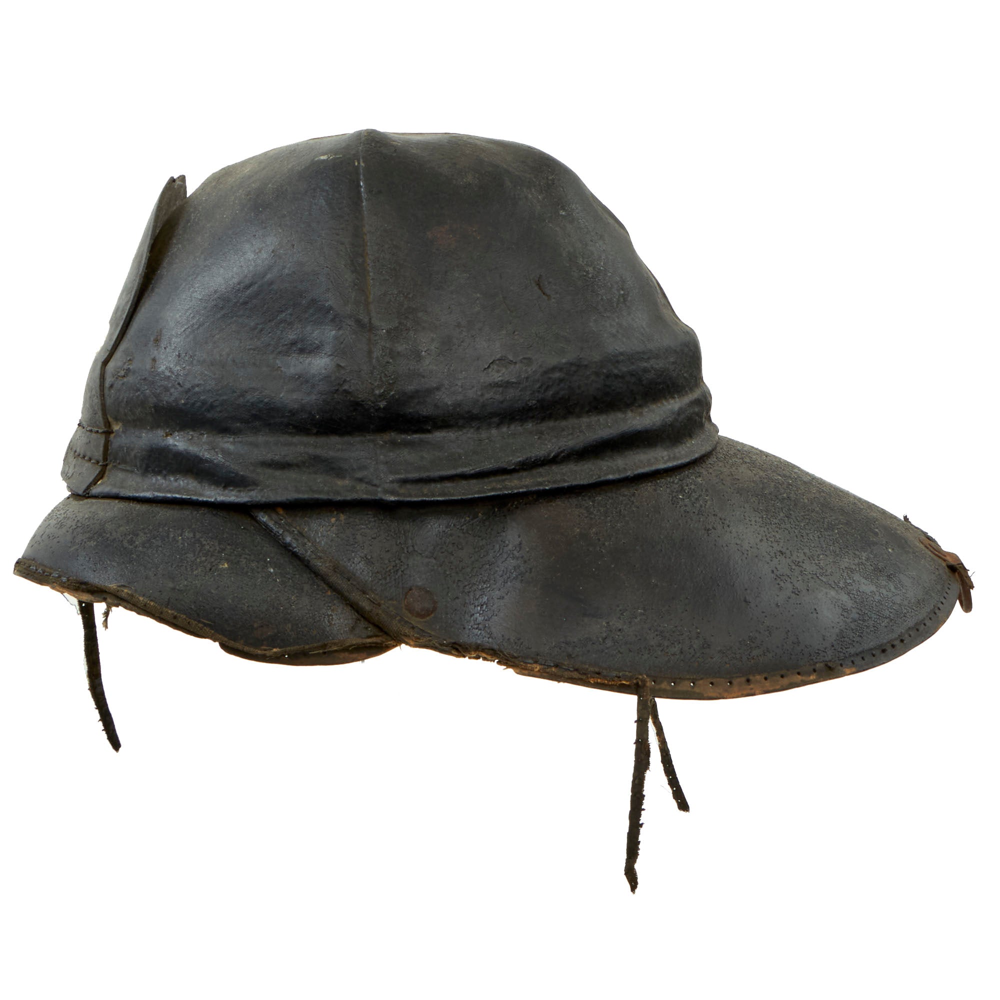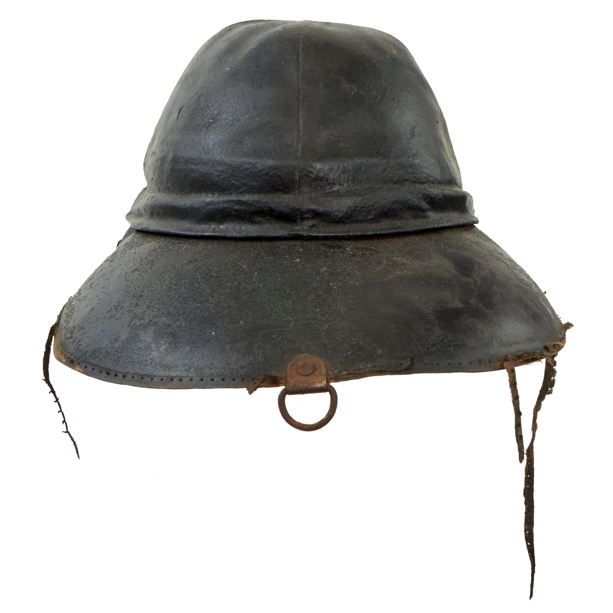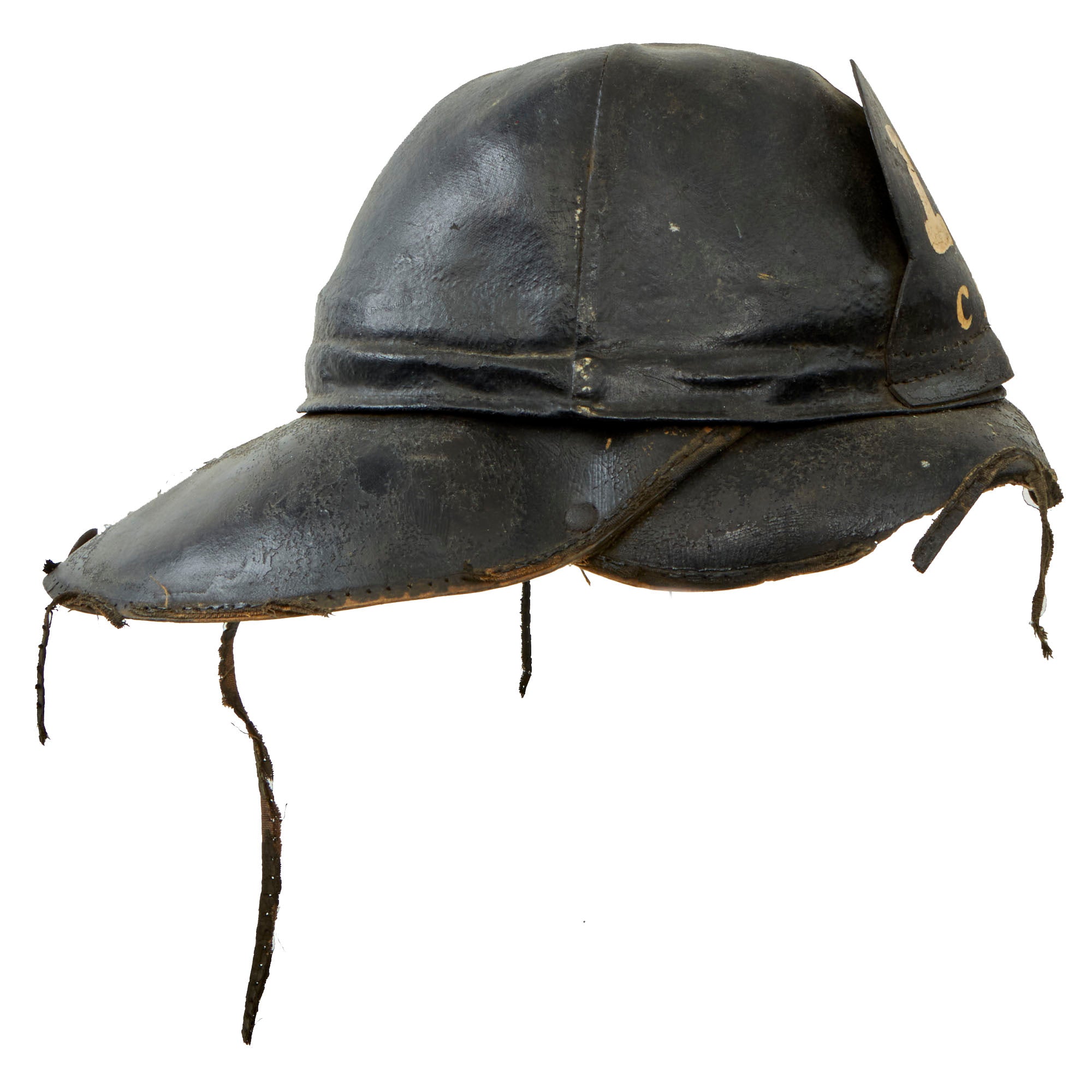 To create this new helmet, Bullard used overlapping layers of sturdy canvas, which were steamed for temporary pliability before being secured together with glue. He then covered the inside and outside shell with water-resistant shellac for added strength and durability which is retained nicely but is not without loss or damage. Finally, he added leather to the front and rear brims which are still firmly attached to the “bowl”.