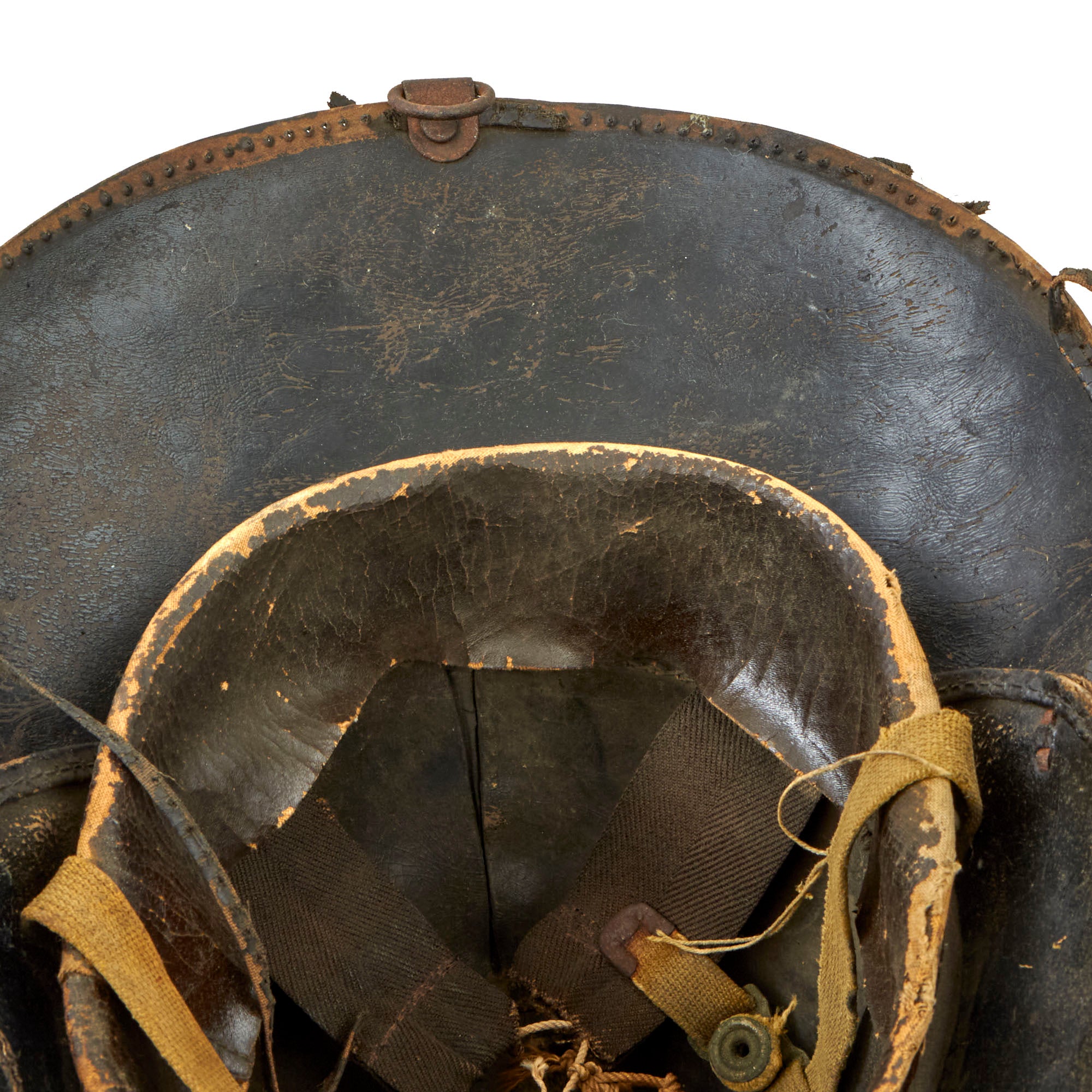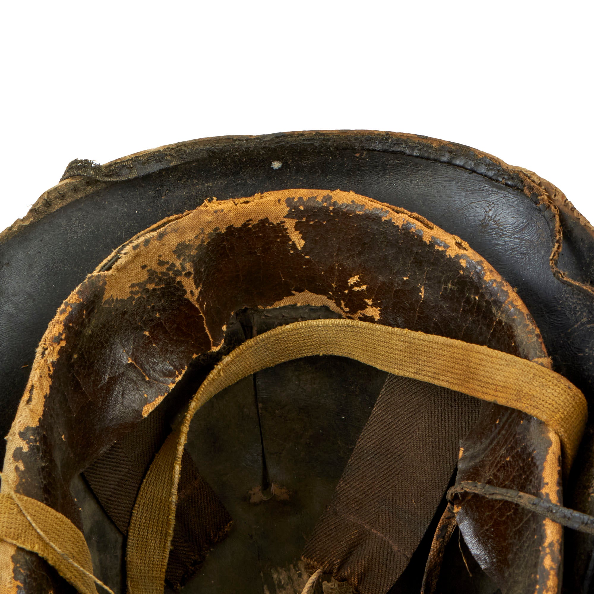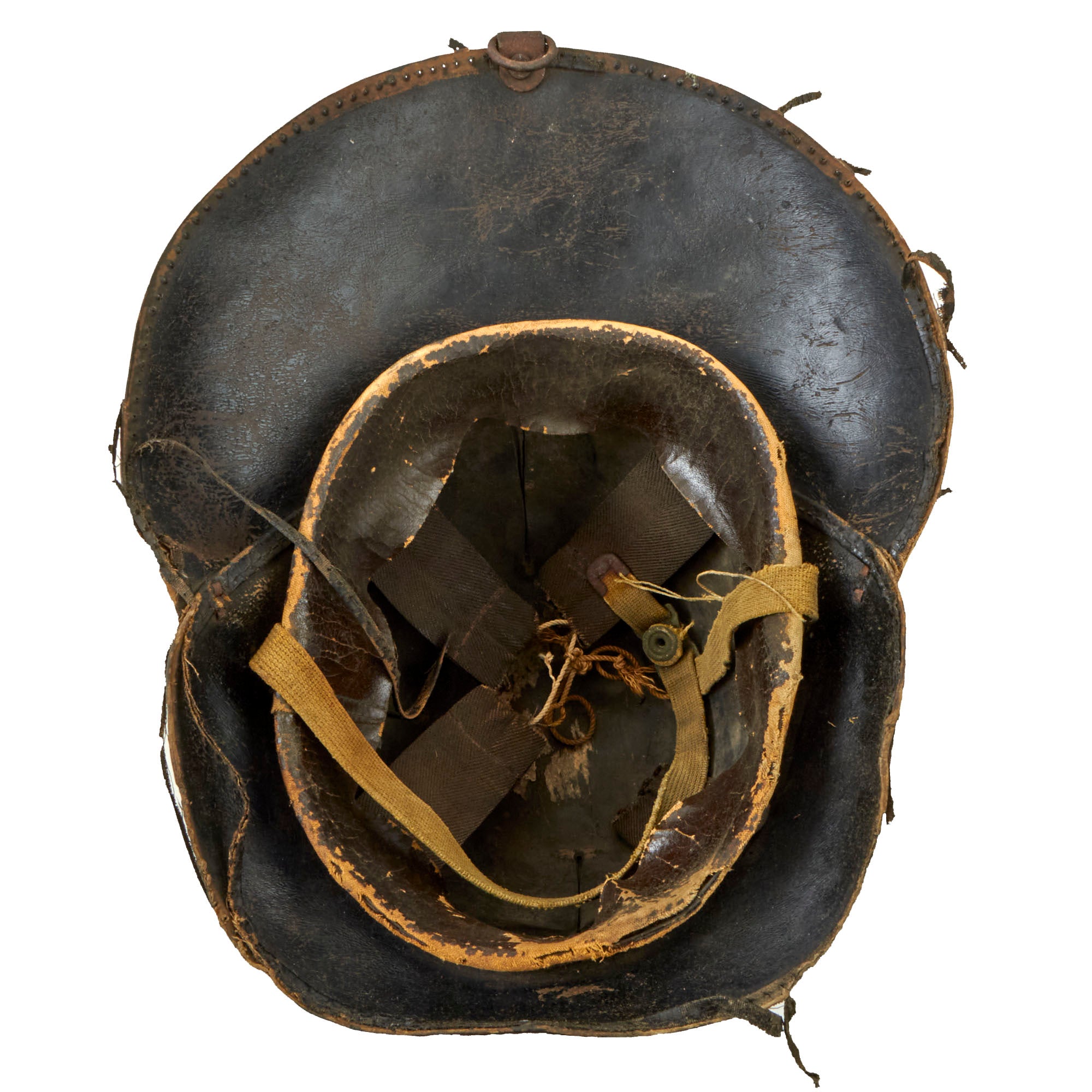 The condition of the helmet is that of one that saw many years of faithful service. The leather brims are deformed with the strips of reinforcement leather almost completely gone or detached. There is a wonderful, very worn suspension liner very similar to the M1917A1 Kelly Helmet but with 4 separate “fingers” made of strong woven cotton. Unfortunately one of the fingers is torn through where the top size adjustment string runs through.