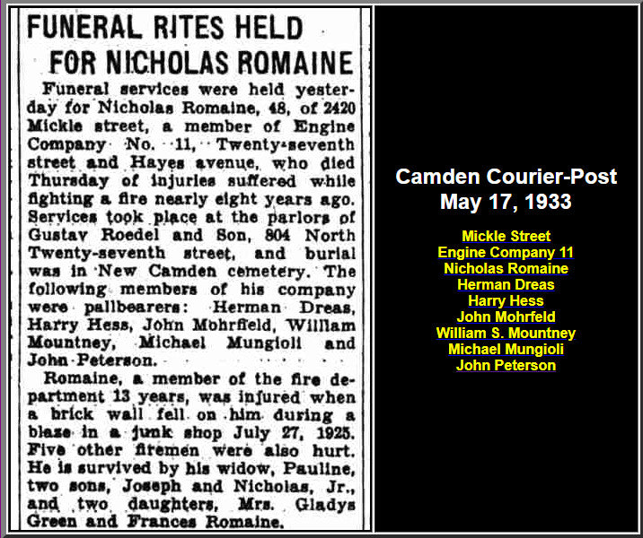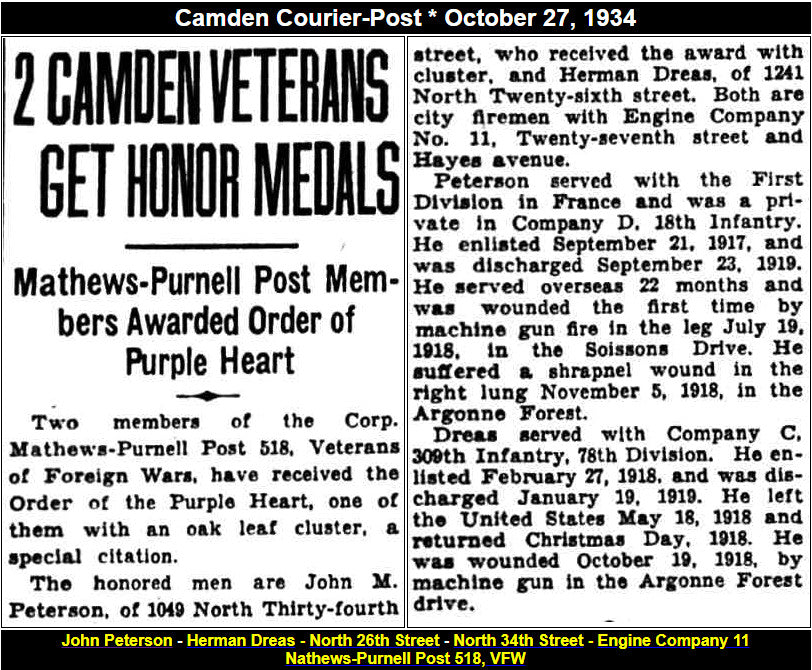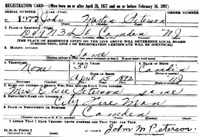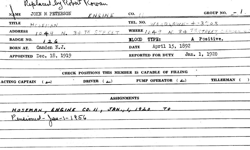 When John M. Peterson registered for the draft on June 5, 1917 he was living with his mother at 1042 North 18th Street in Camden's Cramer Hill section. John M. Peterson was appointed to the Camden Fire Department on December 16, 1919. He reported for duty at Engine Company 11 on January 1, 1920. Fire Department records from 1931 show John M. Peterson residing at 1049 North 34th Street.