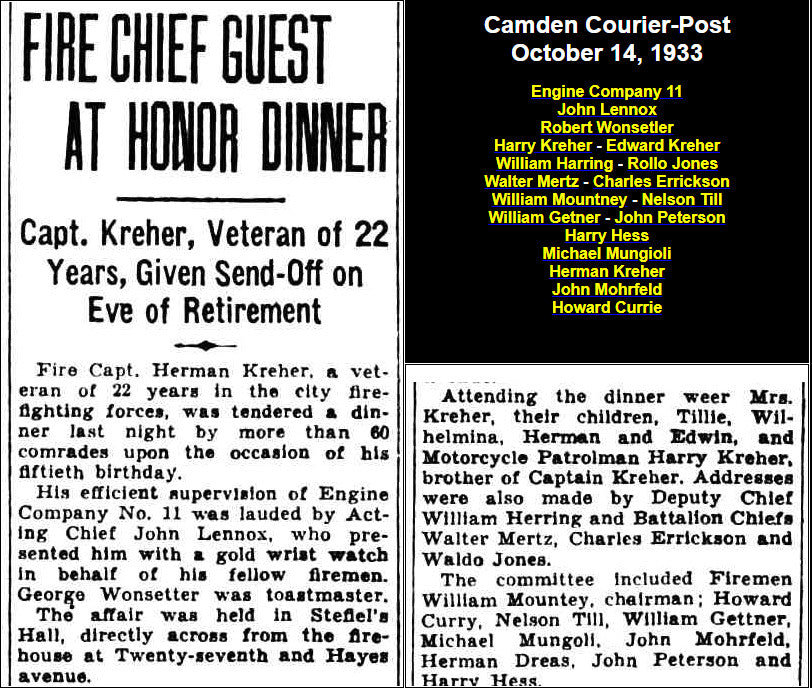 Having reached the mandatory retirement age and having completed 36 years of distinguished service with Engine Company 11 of the Camden Fire Department, John M. Peterson retired on pension January 1, 1956. He moved out of Camden shortly afterwards.