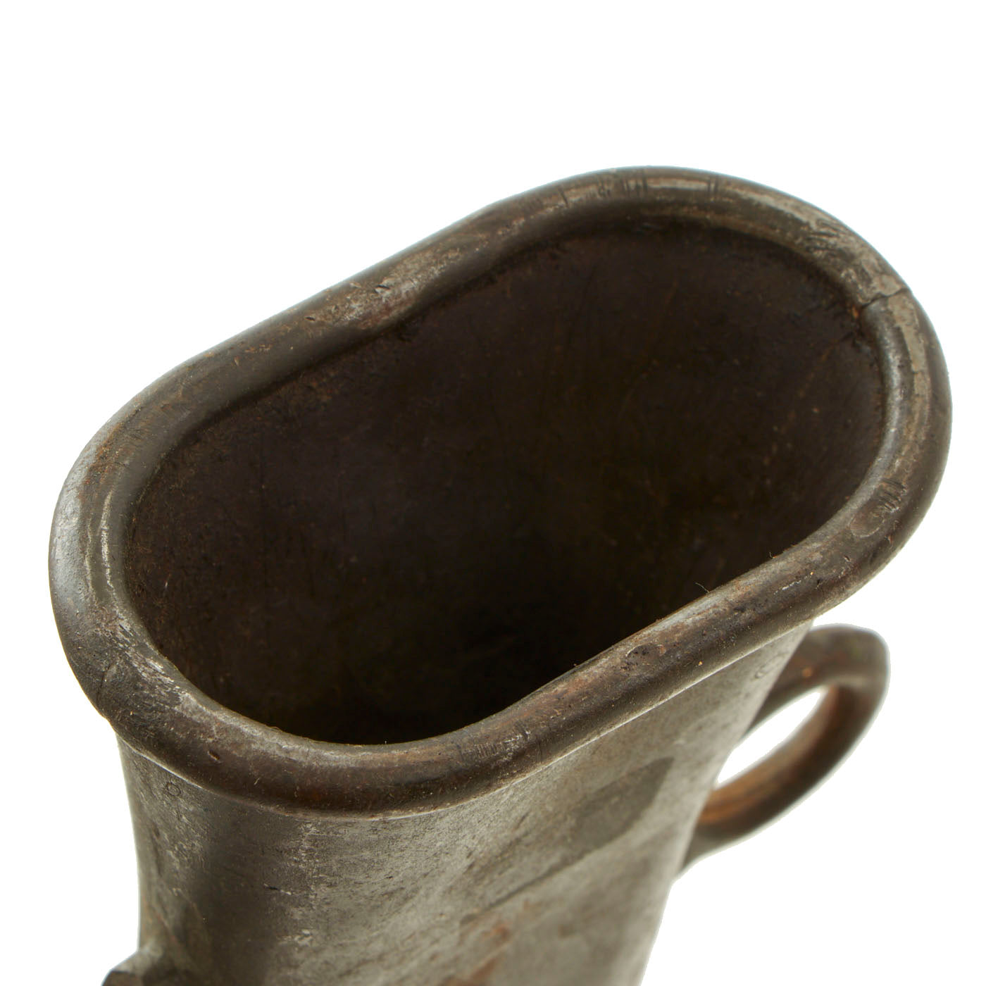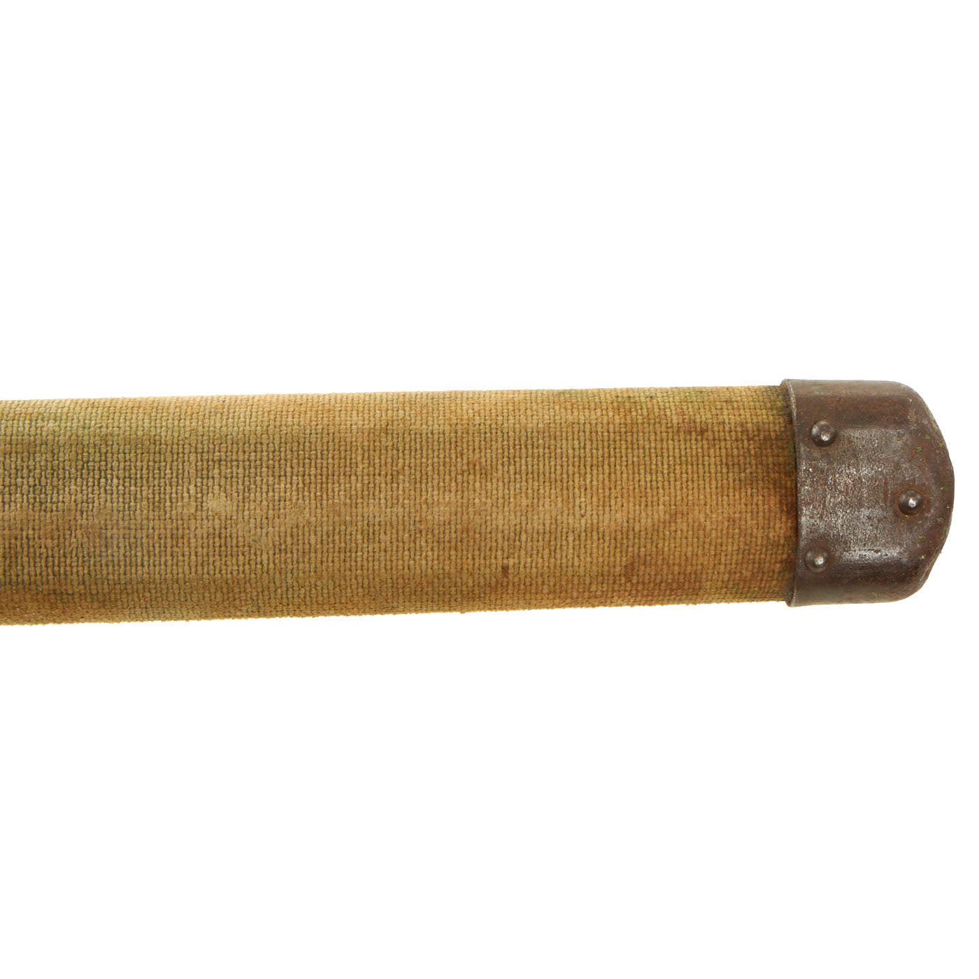 Blade condition is nice, with a wonderful patina, and only a few nicks on the edge. There is unfortunately some pitting and the usual light staining from age. The canvas on the scabbard is intact with staining from age. The steel throat and drag fittings are in lovely condition with a nice patina. The heavy steel guard is in great shape, as is the grip, which shows only light dents and a few paint marks. The grip is cracked unfortunately but still holding together nicely.
