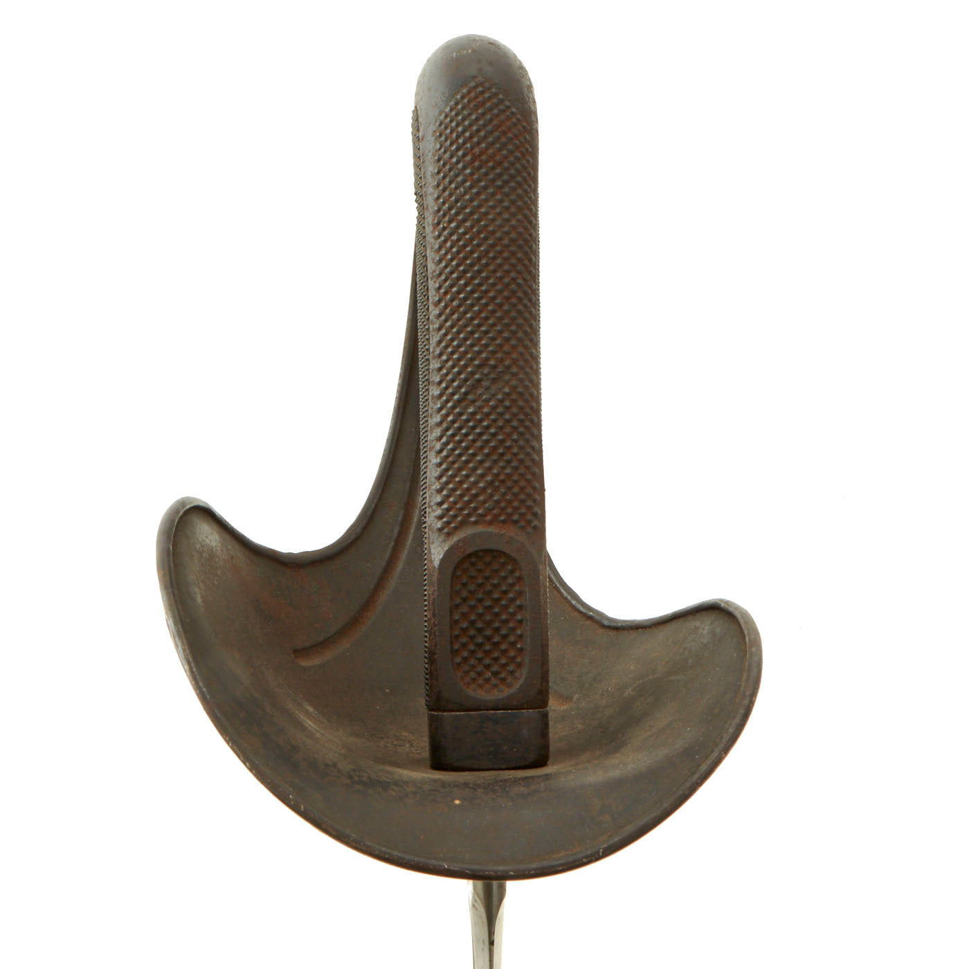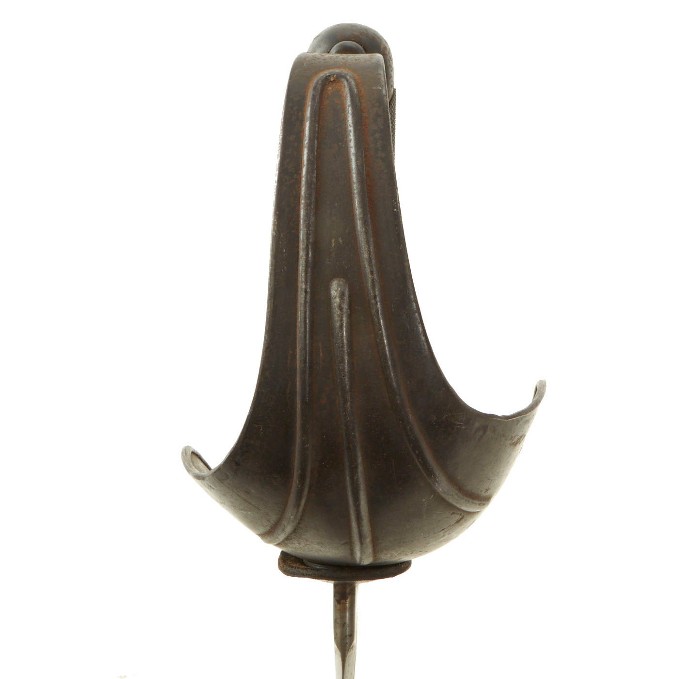 - It has a blued steel (some were nickel plated) "cup-hilt" and a black composition grip.